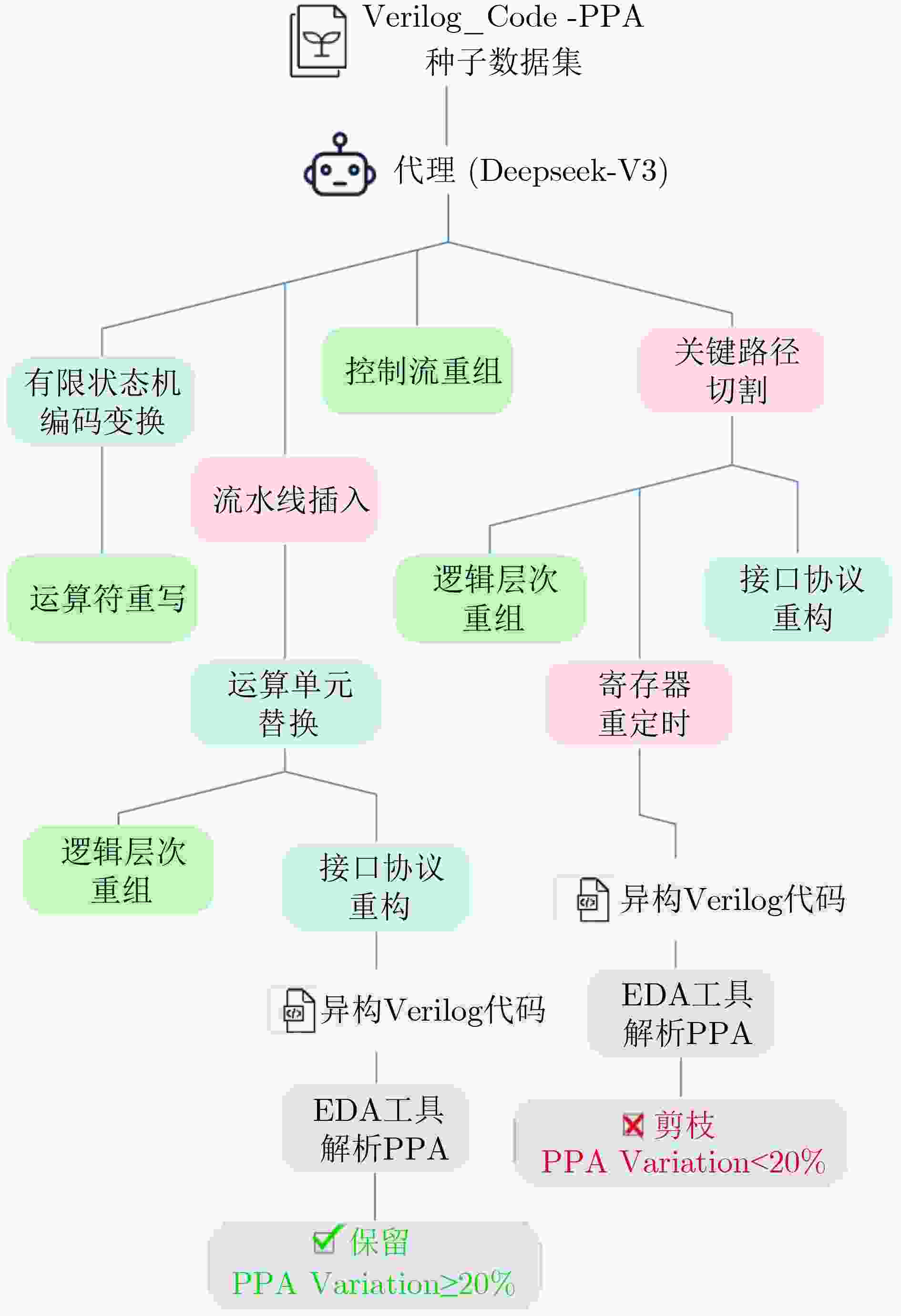 Algorithm1: 输入: Seed code set Seeds, Target mutation count TargetCount, PPA threshold threshold 输出: AugmentedDataset (1) Initialization: (2) Transformer set T = {FSM encoding, Interface protocol, Arithmetic unit, Control flow, Operator rewriting, Logic hierarchy, Critical
