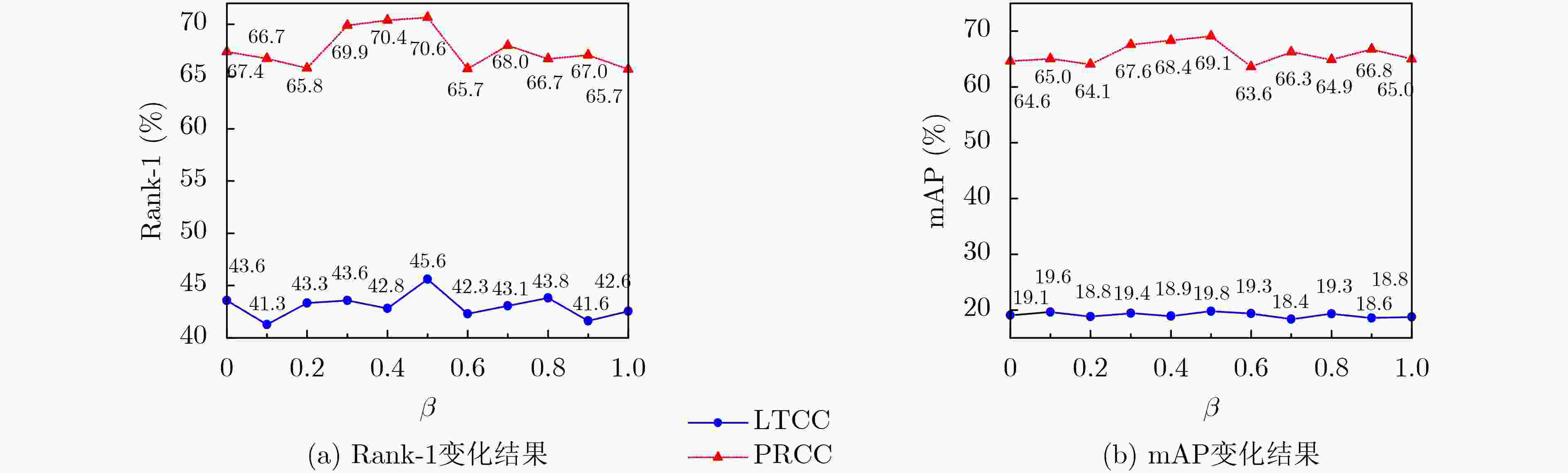 数据集 摄像头 数据类型 训练集(ID/图像) 测试集(ID/图像) 查询集 图库集 LTCC 12 SC/CC 77/ 9576 75/493 75/ 7050 PRCC 3 SC/CC 150/ 17896 71/ 3543 71/ 3384 Celeb-reID - SC/CC 632/ 20208 420/ 2972 420/ 11006 DeepChange 17 CC 450/ 75083 521/ 17527 521/ 62956 Market- 1501 6 SC 751/ 12936 750/ 3368 750/ 19732 注:SC和CC分别表示服装一致和服装变换两种模式 表 2 本文方法与其他最新方法在LTCC和PRCC数据集上的实验结果(%)