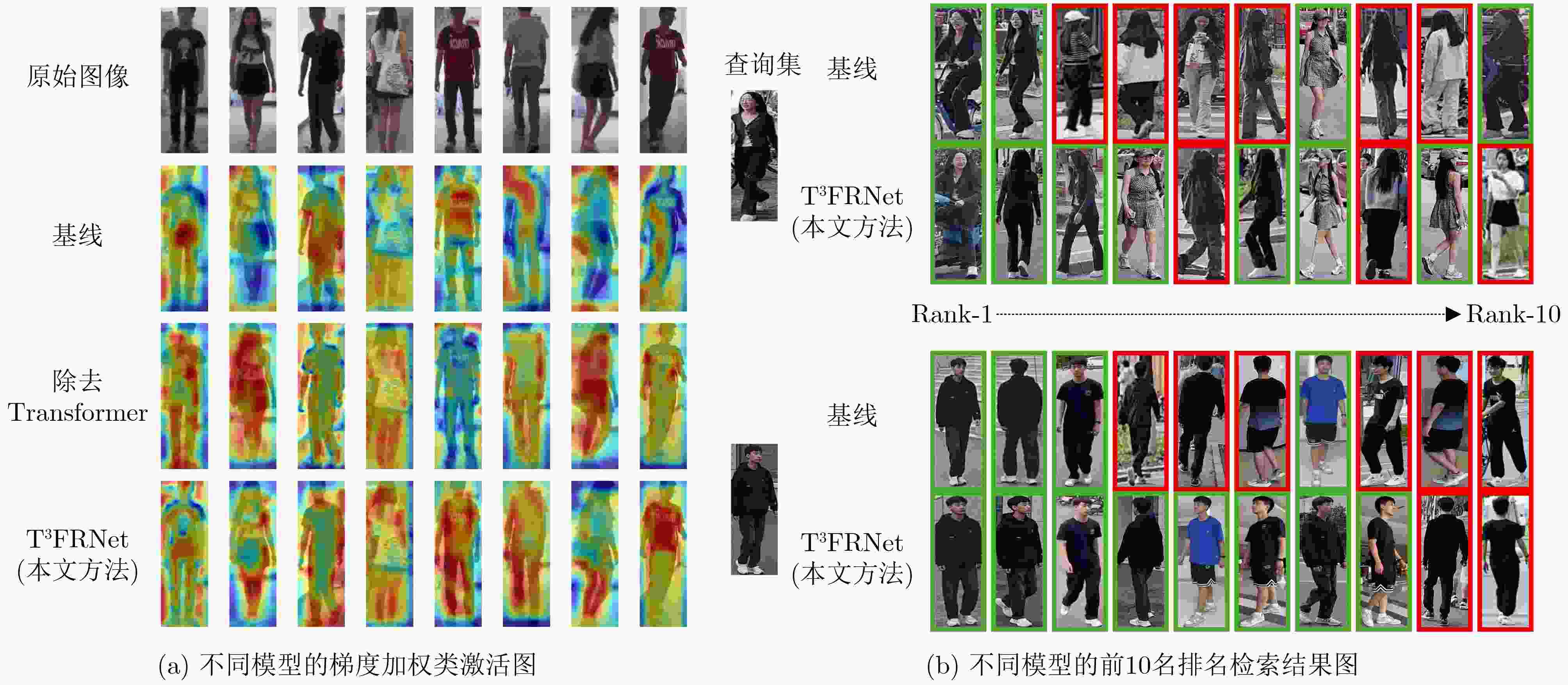 方法 模态 服装标签 LTCC PRCC 标准 服装变换 标准 服装变换 Rank-1 mAP Rank-1 mAP Rank-1 mAP Rank-1 mAP CAL[7] RGB Yes 74.2 40.8 40.1 18.0 100.0 99.8 55.2 55.8 AIM[8] RGB Yes 76.3 41.1 40.6 19.1 100.0 99.9 57.9 58.3 FDGAN[23] RGB Yes 73.4 36.9 32.9 15.4 100.0 99.7 58.3 58.6 GI-ReID[4] RGB+ga No 63.2 29.4 23.7 10.4 - - 33.3 - BMDB[6] RGB+bs No 74.3 39.5 41.8 17.9 99.7 97.9 56.6 53.9 FIRe2[12] RGB No 75.9 39.9 44.6 19.1 100.0 99.5 65.0 63.1 TAPFN[13] RGB No 71.9 34.7 40.1 17.4 99.8 98.1 69.1 68.7 CSSC[11] RGB No 78.1 40.2 43.6 18.6 100.0 99.1 65.5 63.0 MBUNet[9] RGB No 67.6 34.8 40.3 15.0 99.8 99.6 68.7 65.2 ACID[10] RGB No 65.1 30.6 29.1 14.5 99.1 99.0 55.4 66.1 AFL[24] RGB No 74.4 39.1 42.1 18.4 100.0 99.7 57.4 56.5 T3FRNet(本文方法) RGB No 79.8 41.3 45.6 19.8 100.0 99.9 70.6 69.1 表 3 本文方法与其他最新方法在Celeb-reID数据集上的实验结果(%)