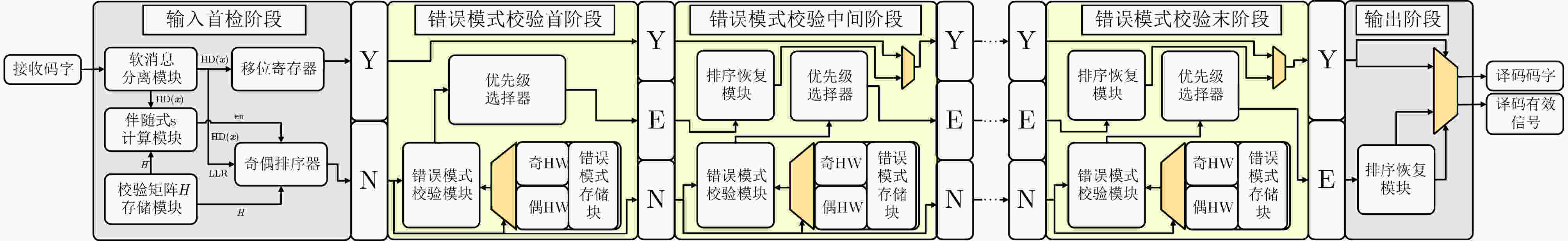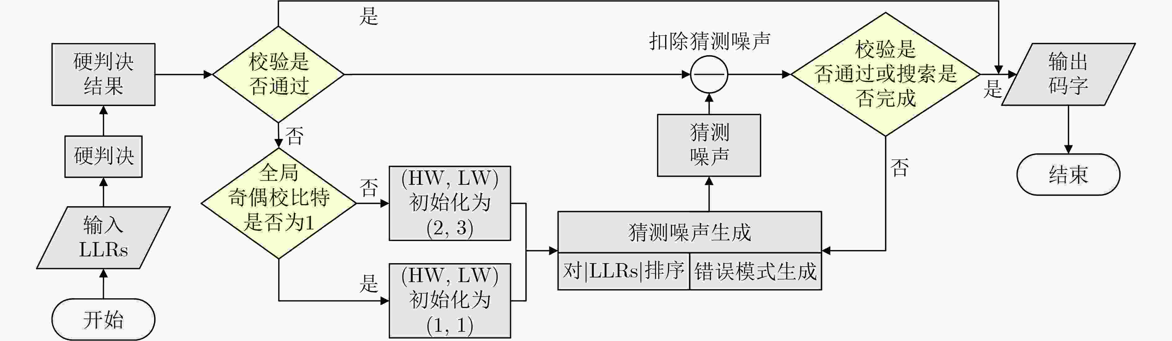 1223 %。Abstract:Objective Ordered Reliability Bits Guessing Random Additive Noise Decoding (ORBGRAND) is a universal channel decoding algorithm characterized by its simple principles, strong decoding performance, low average latency, and hardware-friendly implementation. Since its proposal, ORBGRAND has attracted considerable attention as a promising alternative to traditional decoding methods. By combining ordered reliability bits with a noise-guessing strategy, it achieves near Maximum-Likelihood Decoding (MLD) performance while avoiding prohibitive resource overhead. However, challenges remain: its worst-case latency and limited throughput restrict practical use in high-speed communication systems. To address these gaps, this work proposes improved ORBGRAND serial and unrolled hardware architectures that incorporate a special parity-check constraint. Methods This study proposes incorporating a specific parity-check constraint into serial and unrolled ORBGRAND architectures. In the serial architecture, the global parity-check bit is used to control the iteration of Hamming Weight (HW) and Logistic Weight (LW), enabling the decoder to skip the generation and verification of invalid error patterns. In the unrolled architecture, error patterns are separately pre-stored and queried according to the global parity-check bit. This design significantly enhances the hardware efficiency of ORBGRAND decoders. Results and Discussions The improved serial and unrolled ORBGRAND decoders with the global parity-check constraint are implemented and compared with their original counterparts. Simulation results for a tested code indicate that the parity-check constraint preserves the decoding performance of conventional ORBGRAND, while reducing the average number of error pattern queries by 50% in the low to medium Signal-to-Noise Ratio (SNR) range. The architectures are synthesized using Synopsys Design Compiler with TSMC 28 nm technology. The serial ORBGRAND architecture achieves an operating frequency of 400 MHz, delivering a throughput of 33.1 Gbps at SNR = 8 dB. The implementation occupies 0.18 mm2 of area, yielding an area efficiency of 183.9 Gbps/mm2. Compared with the prior art, the serial design increases throughput by 80.9% and area efficiency by 48.1%. The unrolled architecture achieves a throughput of 110.6 Gbps and an area efficiency of 3.97 Gbps/mm2, corresponding to improvements of 584% in throughput and 1223 % in area efficiency relative to the prior art.Conclusions The ORBGRAND algorithm offers a promising approach for high-performance decoding in communication systems by combining high parallelism with near MLD performance. The specific parity-check constraint filters out invalid error patterns, significantly reducing the number of error pattern queries in serial and unrolled ORBGRAND architectures, without compromising performance. The serial and unrolled architectural implementations achieve notable gains in throughput and area efficiency compared with original designs. Integrating ORBGRAND with parity-check constraints thus represents a significant advancement, providing a more efficient solution for pratical communication applications. Future work will focus on further optimization of these architectures and their adaptation to diverse communication standards. In particular, the exploration of additional coding contraints may further extend the applicability of the approach. -
