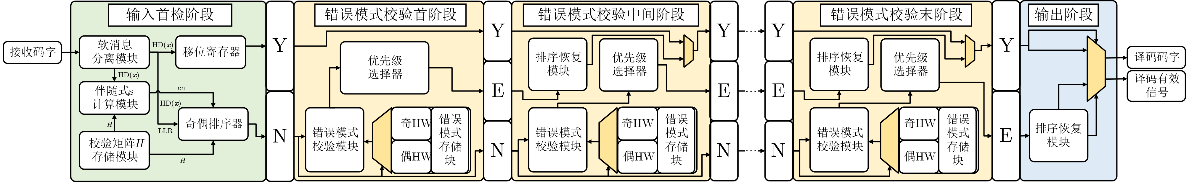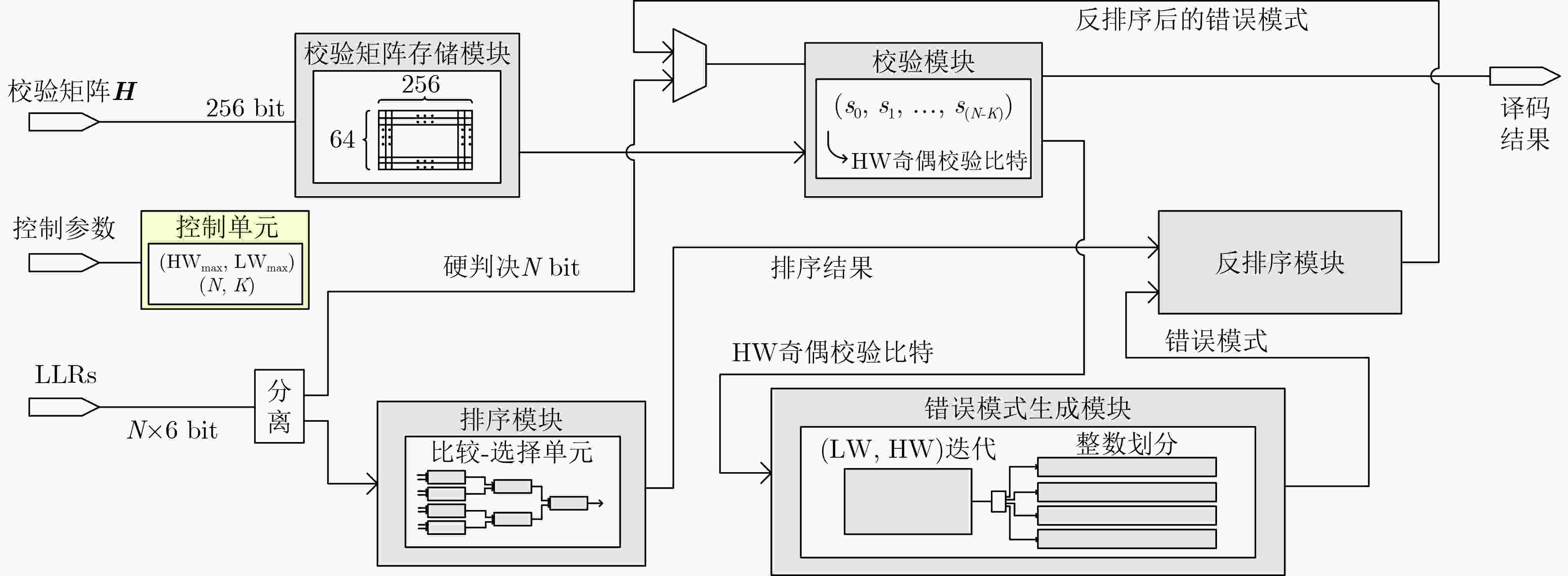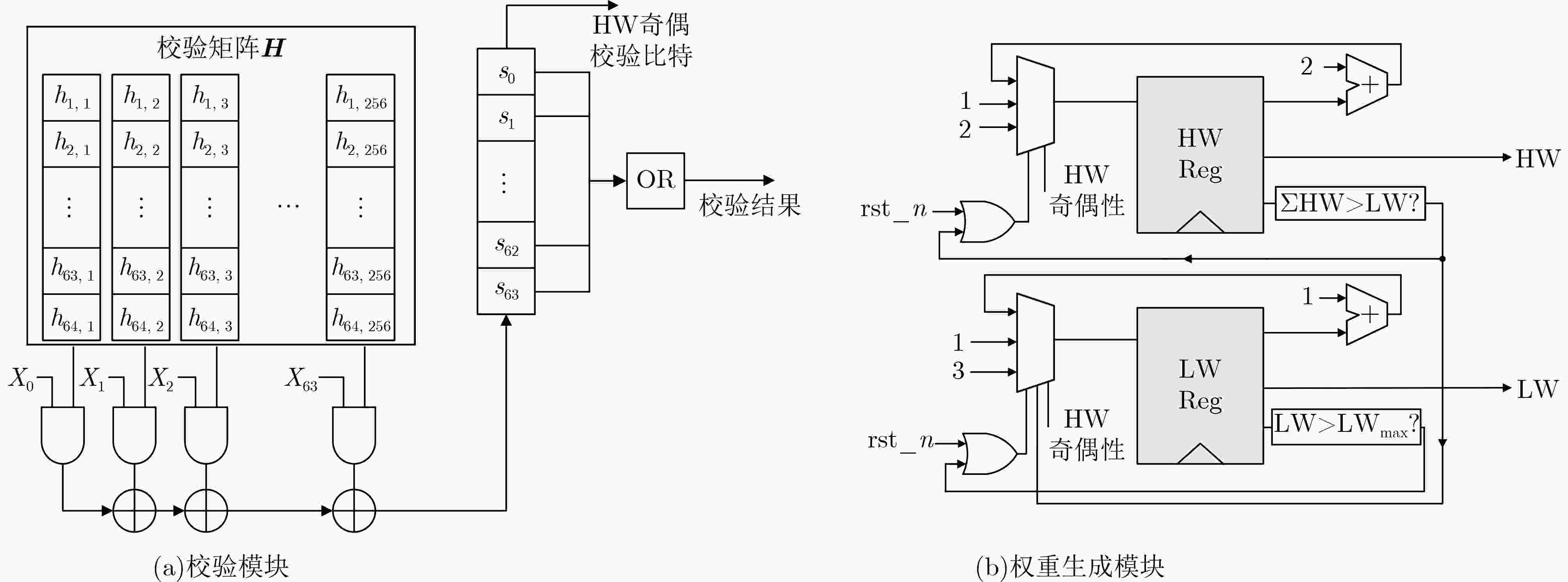 摘要: 有序可靠位猜测随机加性噪声译码(ORBGRAND)凭借其平均时延短和通用性等优点受到广泛关注。然而,目前ORBGRAND算法和硬件实现仍然面临挑战,如最差时延长和吞吐率受限等。为了改善上述问题,该文提出将特殊的编码校验关系融入现有串行和展开架构的ORBGRAND译码器以提升硬件效率。针对串行架构,利用全局奇偶校验比特控制逻辑重量和汉明重量(HW)的迭代过程,跳过部分无效错误模式的生成与校验过程;针对展开架构,根据全局奇偶校验比特将错误模式按照HW奇偶性进行分类存储与测试。采用现有文献中的归一化方法处理后的硬件实现结果表明,所提优化的串行架构译码器吞吐率提升了80.9%,面积效率提升了48.1%;所提优化的展开架构译码器吞吐率提升了584%,面积效率提升了