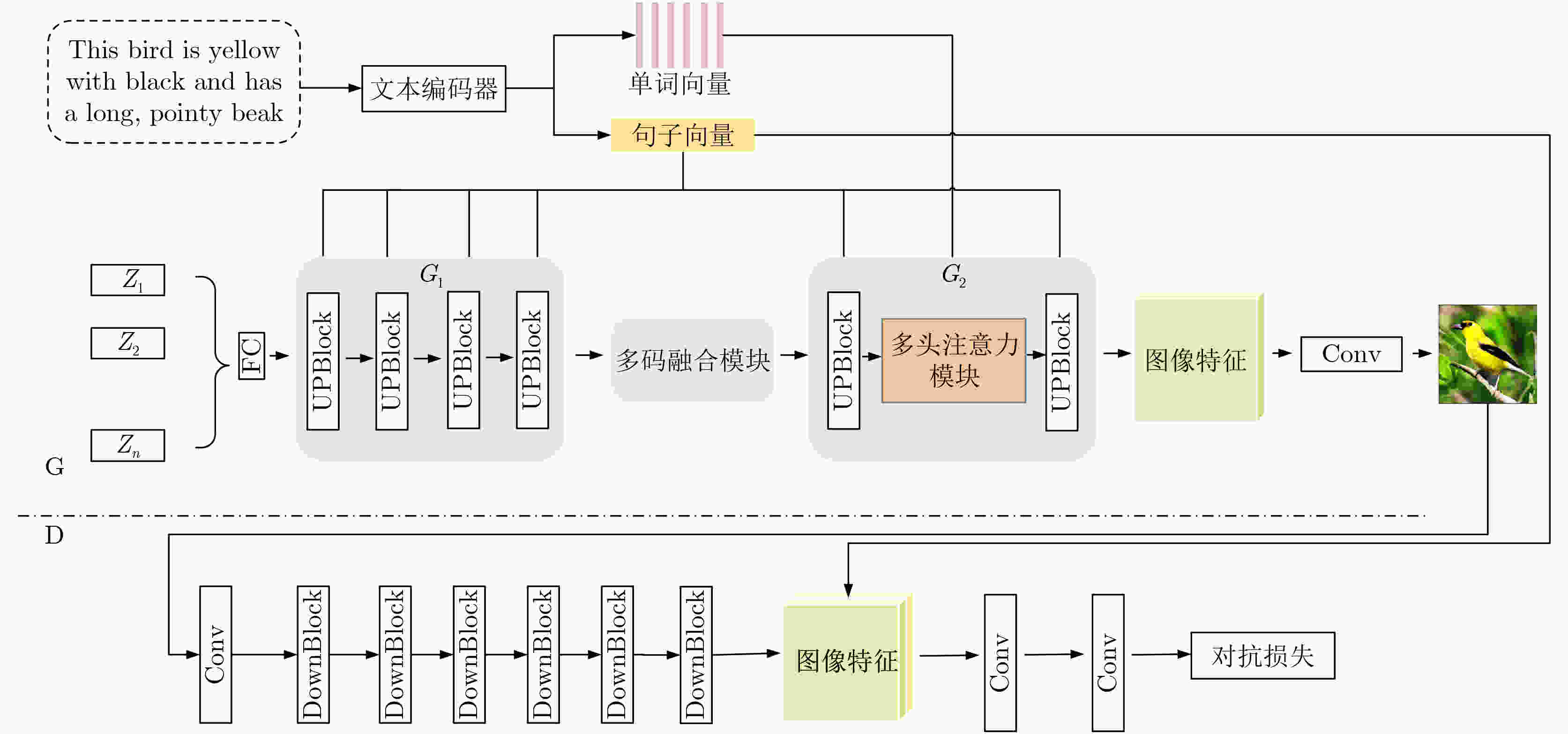 摘要: 文本生成图像是一项极具挑战的跨模态任务,其核心在于生成与文本描述高度一致、细节丰富的高质量图像。当前基于生成对抗网络的方法多依赖单一噪声输入,导致生成图像细粒度不足;同时,单词级特征利用不充分,也制约了文本与图像之间的语义对齐精度。为此,该文提出一种多码深度特征融合生成对抗网络(mDFA-GAN)。该方法通过设计多噪声输入生成器与多码先验融合模块,提升生成图像的细节表现力;在生成器中引入多头注意力机制,从多角度对齐单词与图像子区域,增强语义一致性;此外,提出多码先验融合损失以稳定训练过程。在CUB和COCO数据集上的实验结果表明,所提方法在IS与FID评价指标上均优于当前主流生成对抗网络方法,能够生成更逼真、细节更丰富、语义一致性更强的图像。Abstract: