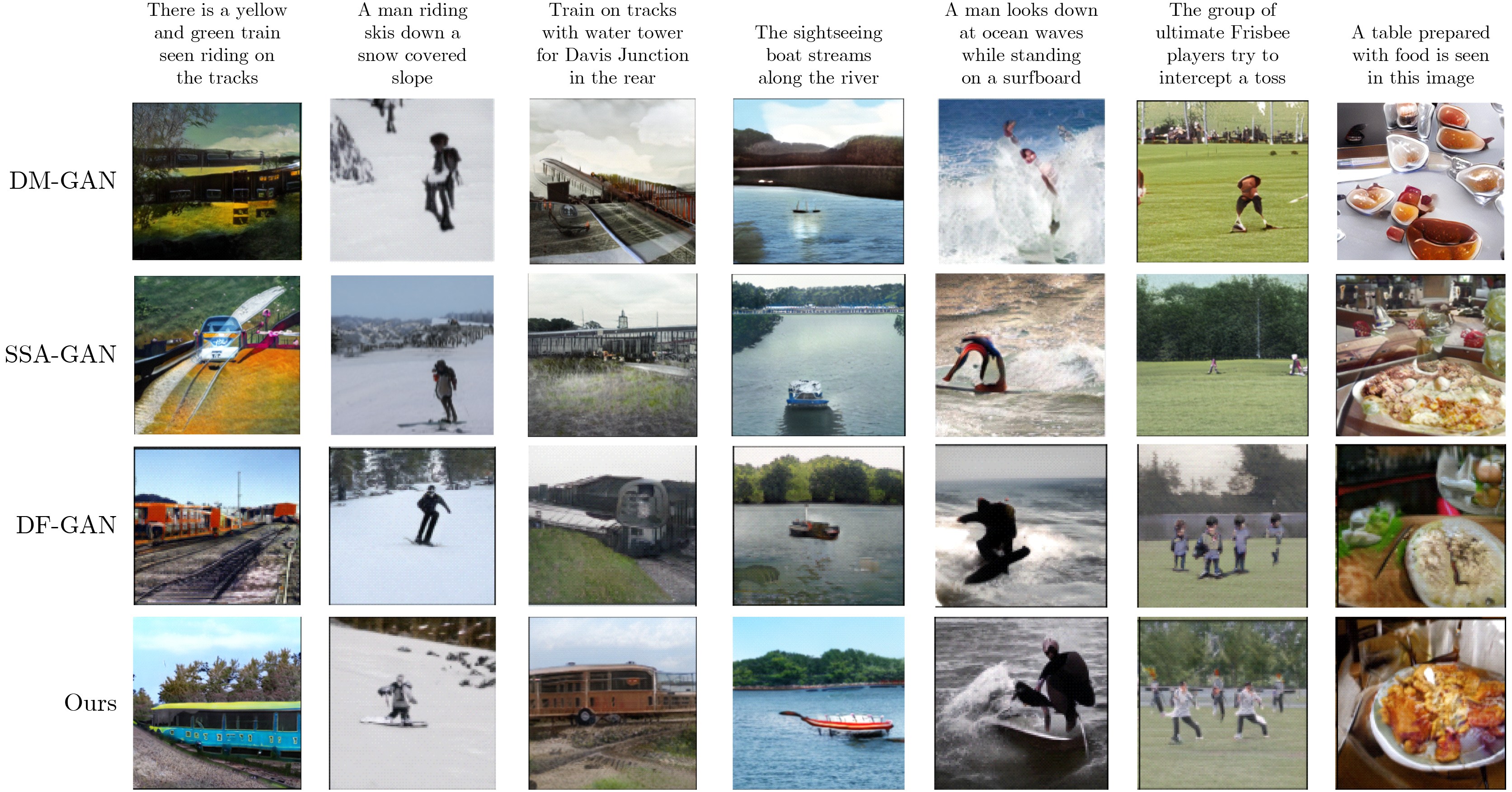 方法 CUB-FID↓ COCO-FID↓ StackGAN++ 15.30 81.59 AttnGAN 23.98 35.49 DM-GAN 16.09 32.64 DR-GAN 14.96 27.80 DF-GAN 14.81 19.32 SSA-GAN 15.61 19.37 Cogview - 27.10 LDM-8 - 23.31 本文 13.45 16.50 表 3 模型组成部分的消融实验