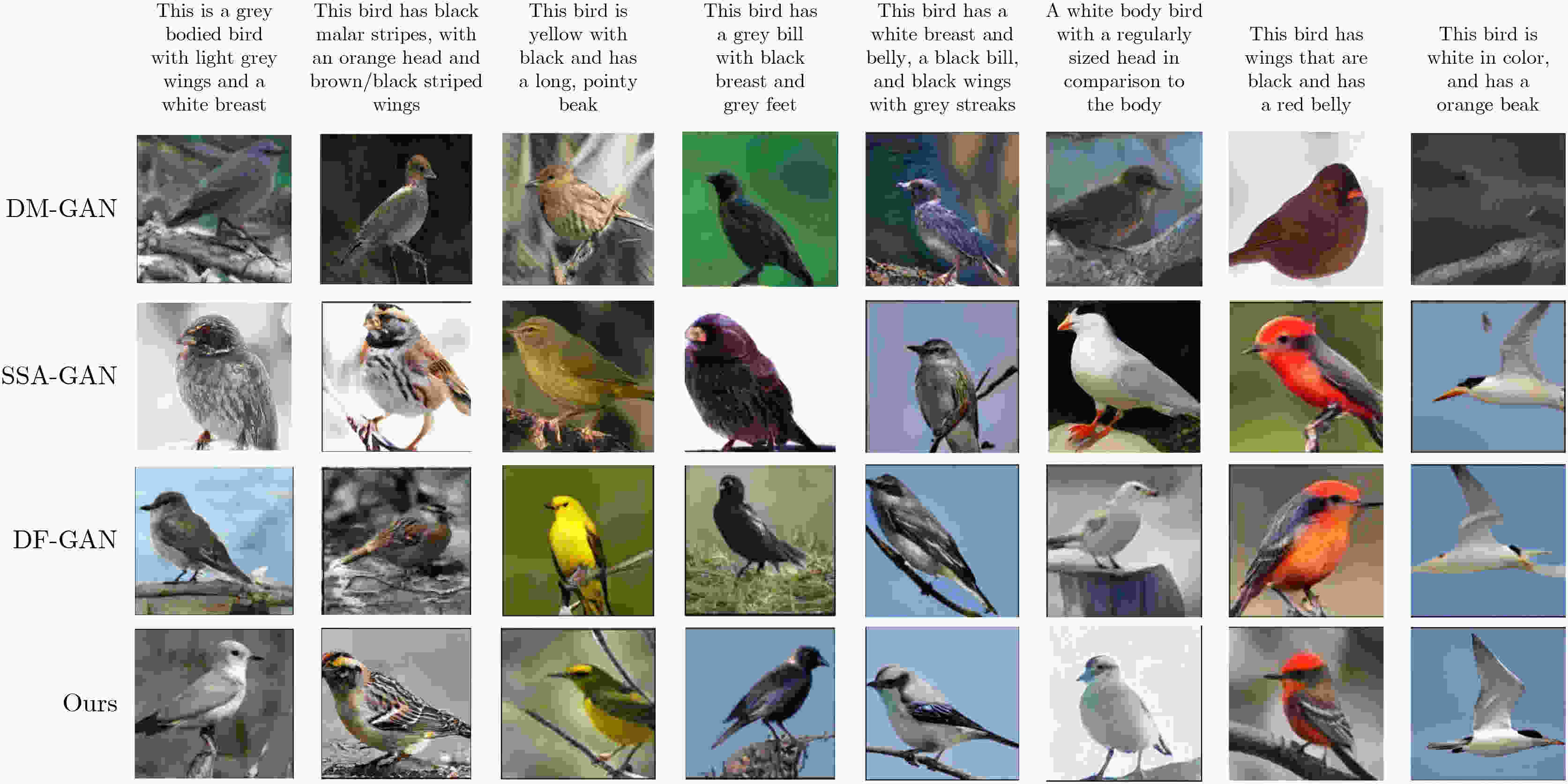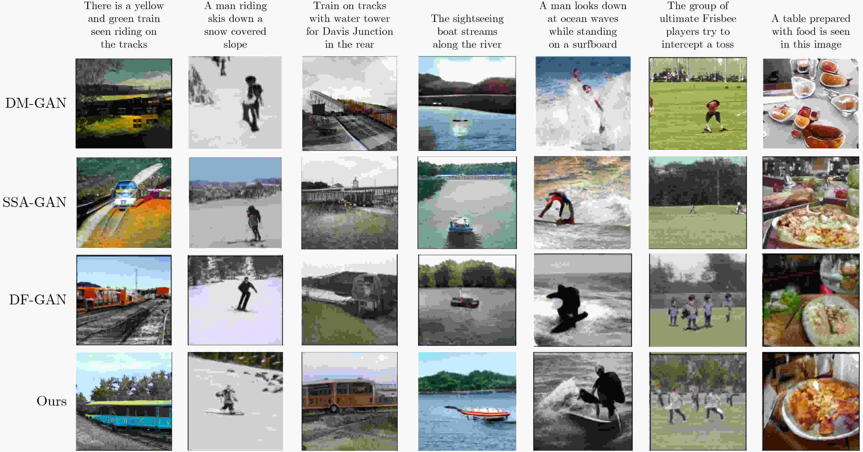 方法 Inception Score(IS)↑ StackGAN++ 4.04±0.06 AttnGAN 4.36±0.03 DM-GAN 4.47±0.19 DR-GAN 4.66±0.15 DF-GAN 4.61±0.12 SSA-GAN 4.70±0.08 Ours 4.82±0.10 表 2 在CUB数据集和COCO数据集上与前沿算法相比FID得分情况表