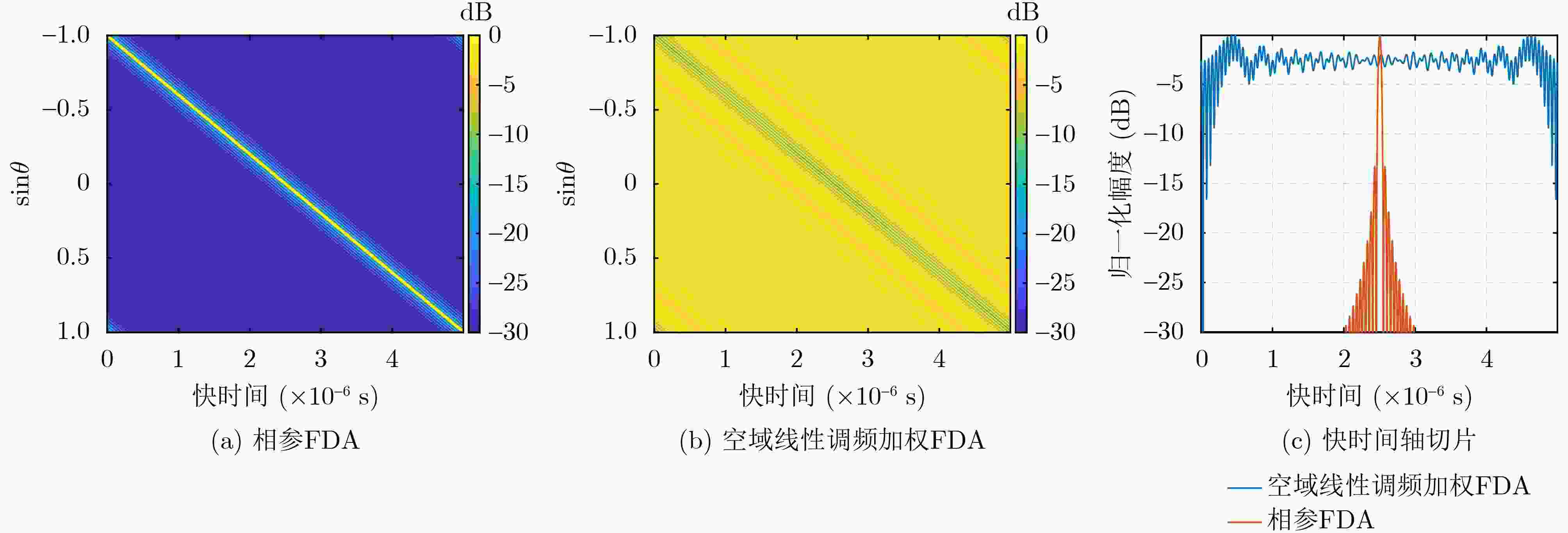 FDA波形 条带样高增益旁瓣区域 平均旁瓣水平 (dB) 距离分辨率 (m) 基于空域线性调频加权的空时联合波形 无 $ 10\lg ({N_{\text{c}}} - {N_{\hat t}}) - 20\lg {N_{\text{c}}} $ $ c/(2B) $ 基于空域相位编码加权的空时联合波形 无 $ 10\lg ({N_{\text{c}}} - {N_{\hat t}}) - 20\lg {N_{\text{c}}} $ $ c/(2B) $ 空域相位编码加权FDA $ \hat t = \tau - k/B $ $ 10\lg (N - \left| k \right|) - 20\lg N $ $ c/(2B) $ 相参FDA时域相位编码 $ \hat t = \tau + \dfrac{{d(\sin {\theta _0} - \sin \theta )}}{{\Delta f\lambda }} $ $ 10\lg \displaystyle\sum\limits_{k = 1 - N}^{N - 1} {\dfrac{{{{\left( {N - \left| k \right|} \right)}^2}}}{{{N^2}{N_{\text{c}}}}}} $ $ c/(2B) $ 表 2 雷达信号参数