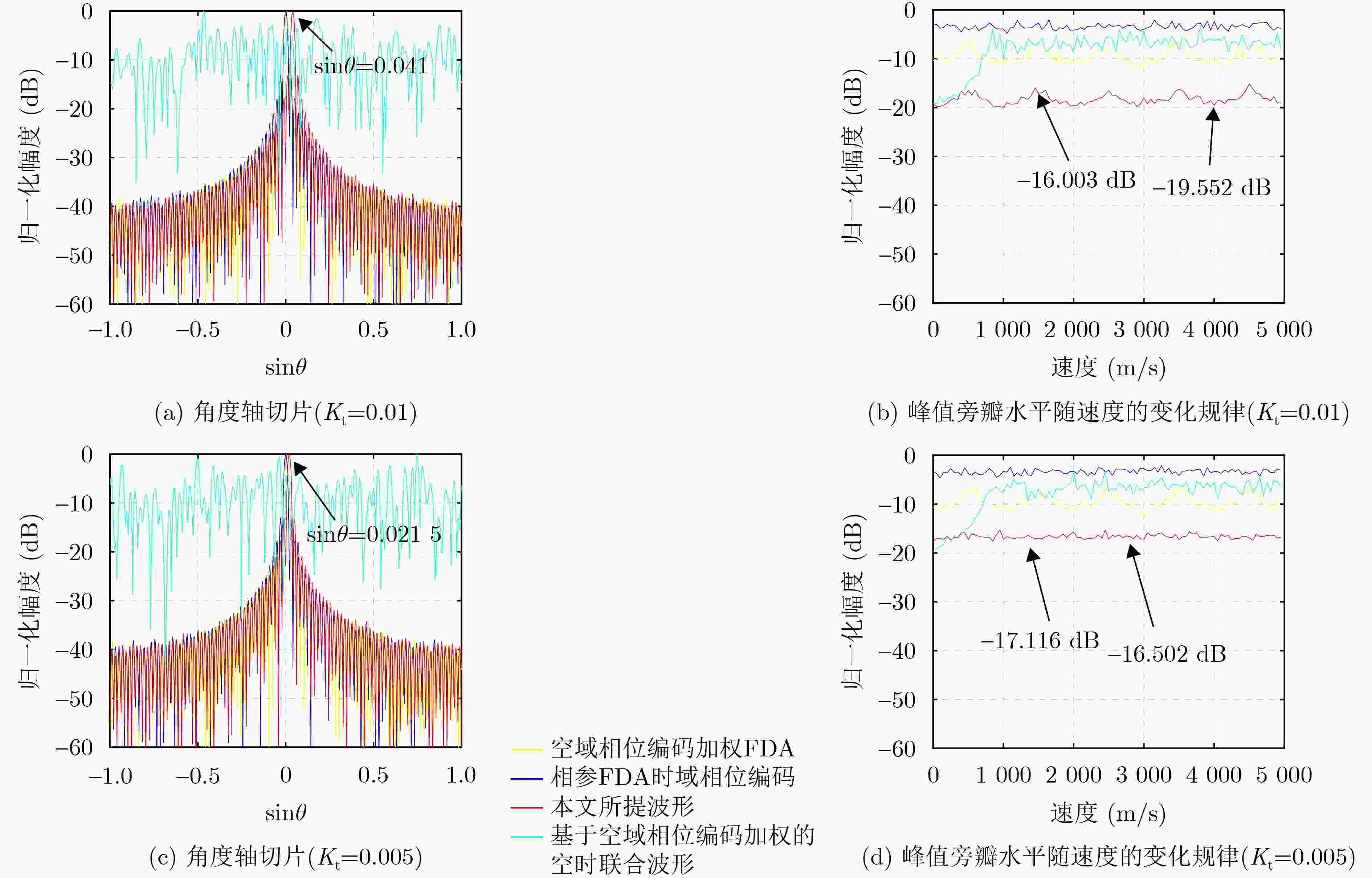 Abstract:Objective Frequency Diverse Array (FDA) radar exhibits a fast time-varying beampattern and a space–time coupled steering vector, offering potential advantages for multi-target tracking, wide-area surveillance, and mainlobe interference suppression. However, the beampattern of conventional coherent FDA radar is narrow, resulting in a shorter beam dwell time than that of phased arrays. This limitation prevents the ambiguity function of conventional coherent FDA from achieving both high range resolution and low sidelobe level simultaneously. When the baseband signal is modulated with a Linear Frequency Modulation (LFM) waveform, the ambiguity function presents low range resolution and low sidelobe level. Conversely, when the baseband signal is modulated with a phase-coded waveform, it achieves high range resolution but exhibits high sidelobe levels with strip-like high-gain sidelobes. The degradation in range resolution or sidelobe performance significantly constrains detection capability. To address this problem, this study proposes a novel space–time joint FDA waveform with spatial LFM weighting, which simultaneously achieves high range resolution, low sidelobe level, and reduced Doppler sensitivity. Methods The spatial-domain modulation scheme and the time-domain baseband waveform are two interdependent factors that determine the ambiguity function performance of FDA radar. Selecting a time-domain baseband waveform with a thumbtack-shaped ambiguity function enables the range resolution to remain independent of space–time coupling. By modulating the spatial weighting phase, the beampattern shape of the FDA can be adjusted to extend beam dwell time, suppress strip-like high-gain sidelobes, and smooth sidelobe energy distribution. The proposed space–time joint waveform thus achieves both high range resolution and low sidelobe level. Doppler tolerance is another key metric for evaluating ambiguity function performance. A space–time joint waveform with spatial phase-coded weighting exhibits high Doppler sensitivity, leading to significantly elevated sidelobe levels and sharp reductions in transmit beamforming gain. In contrast, the spatial LFM weighting method proposed in this study enhances Doppler tolerance while maintaining desirable range and sidelobe characteristics. Results and Discussions By combining the spatial LFM weighting method with a time-domain baseband waveform exhibiting a thumbtack-shaped ambiguity function (e.g., a phase-coded waveform), this study addresses the limitation of conventional coherent FDA waveforms, which cannot simultaneously achieve high range resolution and low sidelobe level. The proposed waveform demonstrates robust pulse compression performance, even under target motion. Simulation experiments were conducted to analyze the ambiguity functions under both stationary and motion conditions, and the results are summarized as follows: (1) The average sidelobe levels near the target peak for the space–time joint FDA waveform with spatial LFM weighting and spatial phase-coded weighting are both approximately –30 dB ( Fig.3(a) –(b) ). In comparison, the average sidelobe level near the target peak for the spatial phase-coded weighting FDA using a time-domain LFM baseband waveform is about –10 dB (Fig.3(c) ), while that of the coherent FDA with a time-domain phase-coded waveform is about –12 dB (Fig.3(d) ). Thus, the two space–time joint FDA waveforms achieve the lowest average sidelobe levels. (2) The imaging results of both space–time joint FDA waveforms show no strip-like high-gain sidelobes (Fig.4(a) –(b) ). By contrast, the spatial phase-coded weighting FDA and the coherent FDA with a time-domain phase-coded waveform both display prominent high-gain sidelobes (Fig.4(c) –(d) ). These sidelobes from high Signal-to-Noise Ratio (SNR) targets can obscure nearby low-SNR targets. (3) All four FDA waveforms achieve a range resolution of 0.75 m (Fig. 5 ), corresponding to a bandwidth of 200 MHz. (4) Under motion conditions, the space–time joint FDA waveform with spatial phase-coded weighting exhibits a notable increase in peak sidelobe level compared with stationary conditions (Fig. 6(a) ). In contrast, the space–time joint FDA waveform with spatial LFM weighting maintains the lowest peak sidelobe level among all four FDA configurations (Fig. 6(b) ).Conclusions This study proposes a space–time joint FDA waveform with spatial LFM weighting. The proposed waveform effectively resolves the issue of degraded range resolution in conventional coherent FDA systems, ensuring that range resolution depends solely on bandwidth. It also eliminates the strip-like high-gain sidelobes commonly observed in conventional FDA waveforms. Under simulation conditions, the average sidelobe level near the target peak is reduced by approximately 10 dB and 18 dB compared with those of the spatial phase-coded weighting FDA and the coherent FDA with a time-domain phase-coded waveform, respectively. This reduction substantially mitigates the masking of low–SNR targets by sidelobes from high-SNR targets and demonstrates strong Doppler tolerance. However, under relative motion conditions, the proposed waveform exhibits Doppler–angle coupling, which will be addressed in future research through the development of coupling mitigation strategies. -