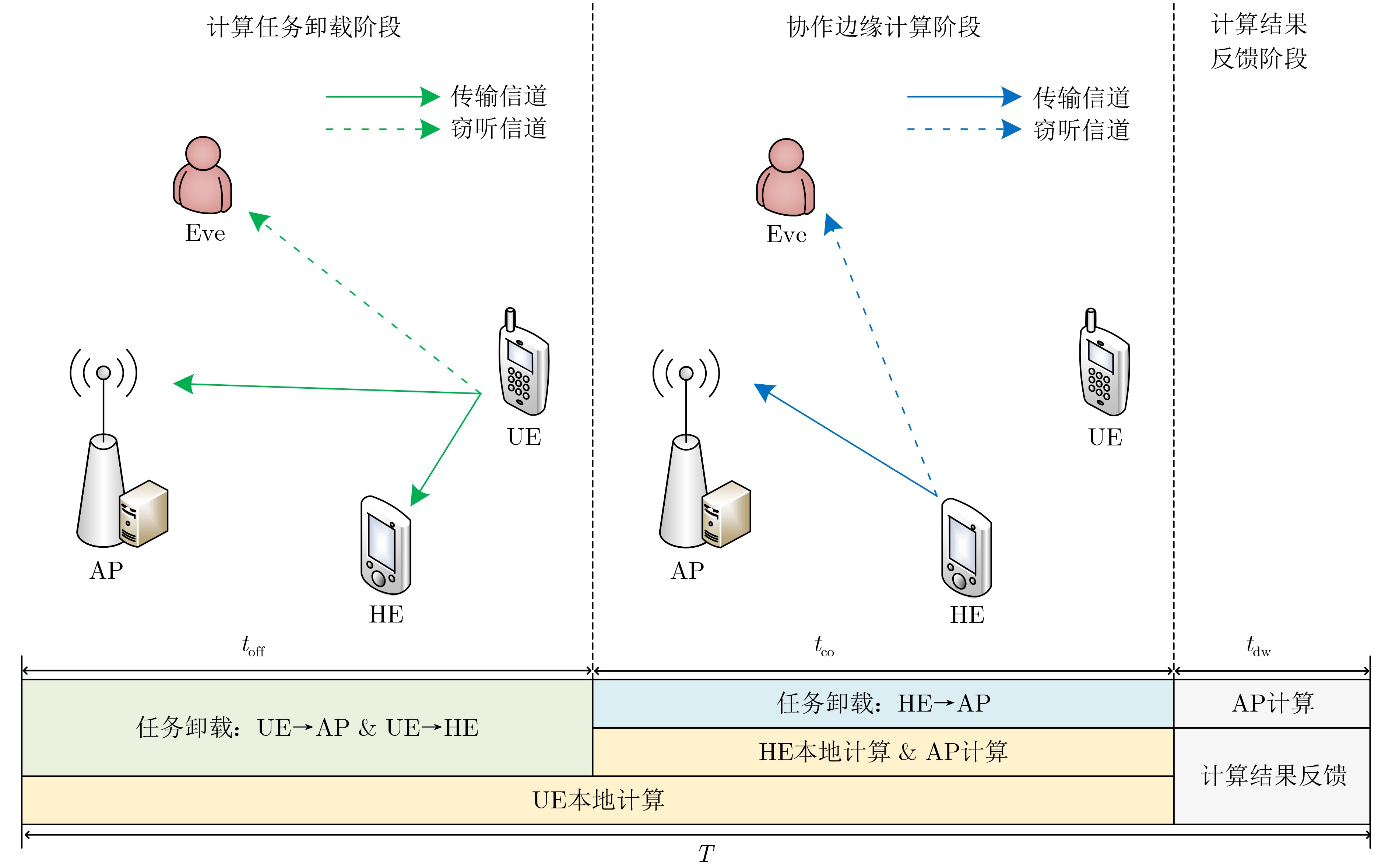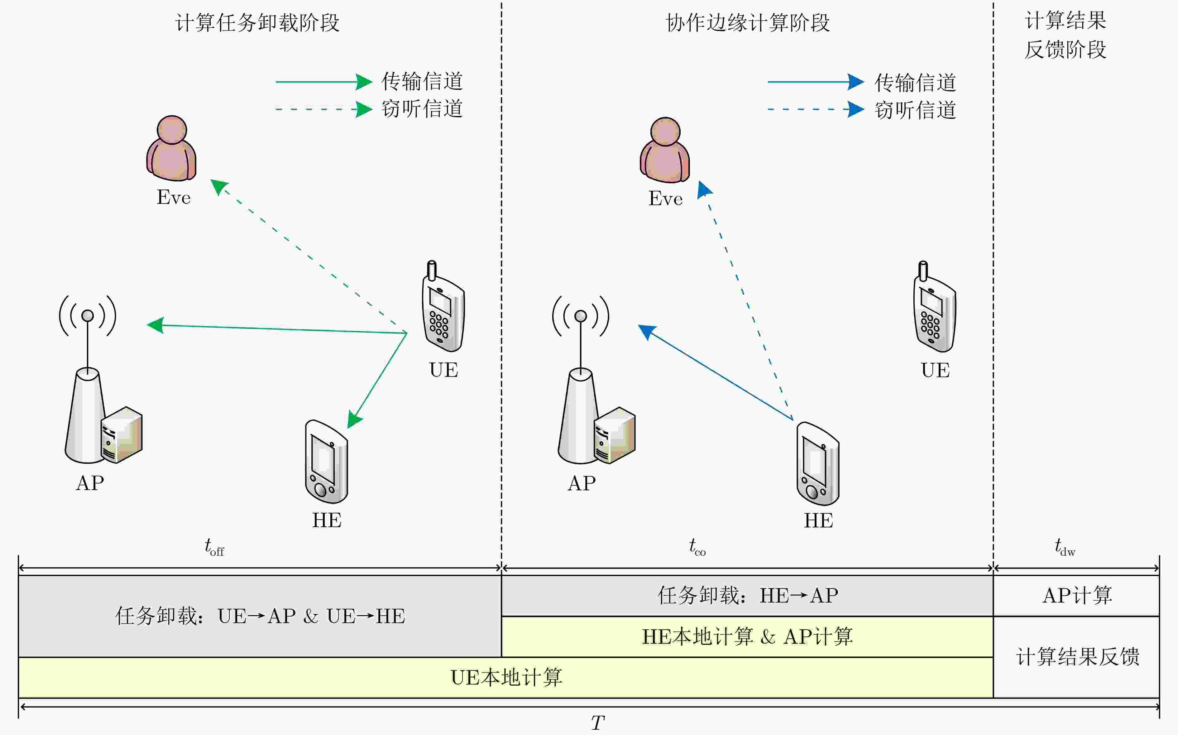 Objective Mobile Edge Computing (MEC) is used to strengthen the computational capability and response speed of mobile devices by shifting computing and caching functions to the network edge. Non-Orthogonal Multiple Access (NOMA) further supports high spectral efficiency and large-scale connectivity. Because wireless channels are broadcast, the MEC offload transmission process is exposed to potential eavesdropping. To address this risk, physical-layer security is integrated into a NOMA-MEC system to safeguard secure offloading. Existing studies mainly optimize performance metrics such as energy use, latency, and throughput, or improve security through NOMA-based co-channel interference and cooperative interference. However, the combined effect of performance and security has not been fully examined. To reduce the energy required for secure offloading, a cooperative NOMA secure offload scheme is designed. The distinctive feature of the proposed scheme is that cooperative nodes provide forwarding and computational assistance at the same time. Through joint local computation between users and cooperative nodes, the scheme strengthens security in the offload process while reducing system energy consumption. Methods The joint design of computational and communication resource allocation for the nodes is examined by dividing the offloading procedure into two stages: NOMA offloading and cooperative offloading. Offloading strategies for different nodes in each stage are considered, and an optimization problem is formulated to minimize the weighted total system energy consumption under secrecy outage constraints. To handle the coupled multi-variable and non-convex structure, secrecy transmission rate constraints and secrecy outage probability constraints, originally expressed in probabilistic form, are first transformed. The main optimization problem is then separated into two subproblems: slot and task allocation, and power allocation. For the non-convex power allocation subproblem, the non-convex constraints are replaced with bilinear substitutions, and sequential convex approximations are applied. An alternating iterative resource allocation algorithm is ultimately proposed, allowing the load, power, and slot assignment between users and cooperative nodes to be adjusted according to channel conditions so that energy consumption is minimized while security requirements are satisfied. Results and Discussions Theoretical analysis and simulation results show that the proposed scheme converges quickly and maintains low computational complexity. Relative to existing NOMA full-offloading schemes, assisted computing schemes, and NOMA cooperative interference schemes, the proposed offloading design reduces system energy consumption and supports a higher load under identical secrecy constraints. The scheme also demonstrates strong robustness, as its performance is less affected by weak channel conditions or increased eavesdropping capability. Conclusions The study shows that system energy consumption and security constraints are closely coupled. In the MECg offloading process, communication, computation, and security are not independent. Performance and security can be improved at the same time through the effective use of cooperative nodes. When cooperative nodes are present, NOMA and forwarding cooperation can reduce the effects of weak channel conditions or high eavesdropping risks on secure and reliable transmission. Cooperative nodes can also share users’ local computational load to strengthen overall system performance. Joint local computation between users and cooperative nodes further reduces the security risks associated with long-distance wireless transmission. Thus, secure offloading in MEC is not only a Physical Layer Security issue in wireless transmission but also reflects the coupled relationship between communication and computation that is specific to MEC. By making full use of idle resources in the network, cooperative communication and computation among idle nodes can enhance system security while maintaining performance. -