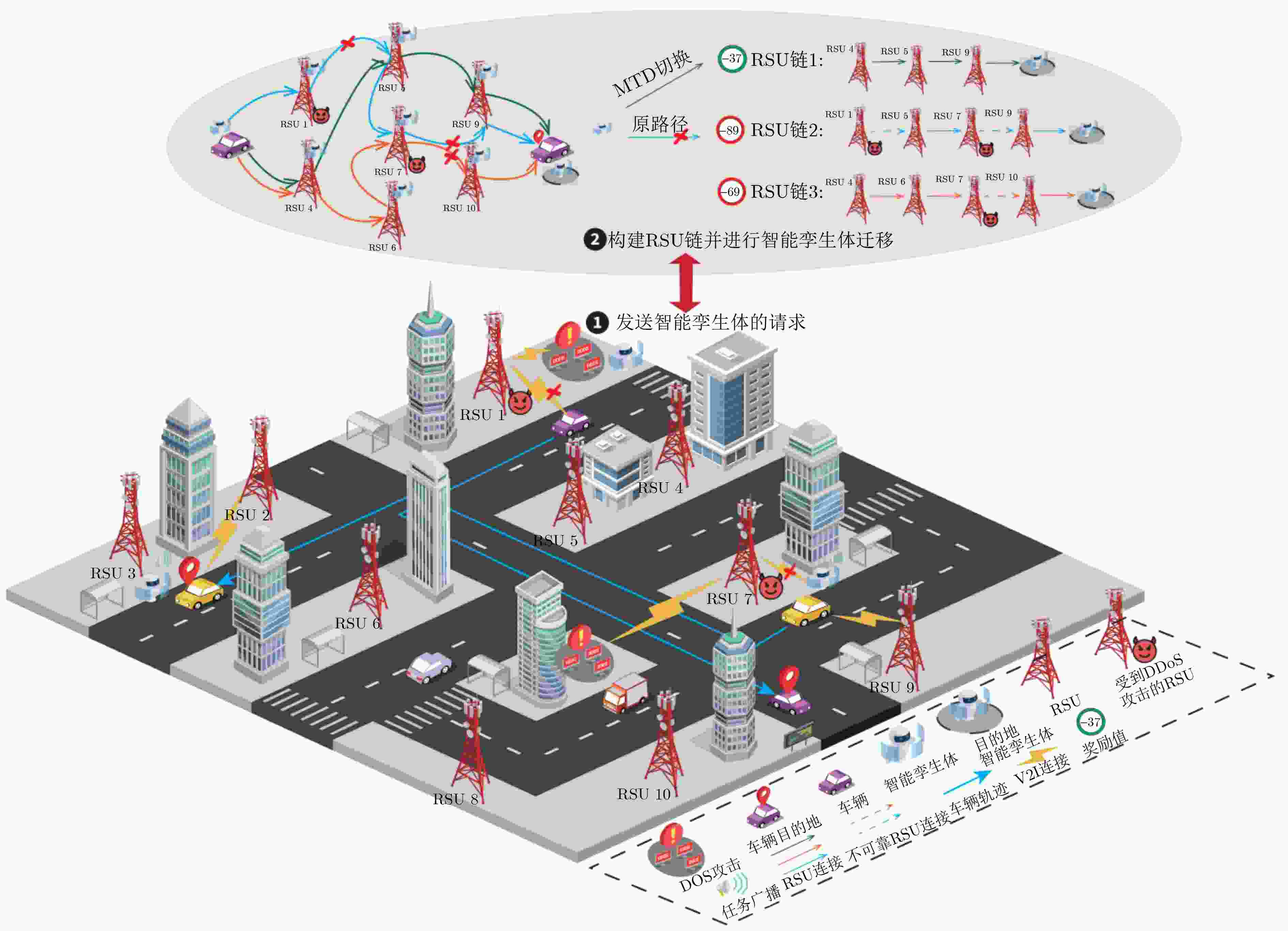 摘要: 车载元宇宙作为元宇宙与智能交通系统融合演进的新兴范式,正逐步成为汽车产业变革的重要推力。在这一背景下,智能孪生体作为覆盖车辆全生命周期并管理车载应用的数字化副本,为用户提供沉浸式车载元宇宙服务。针对车载元宇宙中孪生体迁移的服务连续性与网络安全性问题,该文提出了一种基于路侧单元(RSU)链构建的孪生体全局安全动态迁移方案,以确保在面临多种类型分布式拒绝服务(DDoS)攻击时,孪生体能够高效安全迁移。具体而言,该方案通过通信不中断机制构建可靠RSU链集合,实现孪生体在不同RSU间的无缝迁移。然后,将全局迁移过程建模为部分可观测马尔可夫决策过程,综合考虑RSU负载、计算能力及攻击类型等动态环境因素。最后,利用多智能体深度Q网络算法对安全迁移优化问题进行求解。实验结果表明,在多种DDoS攻击场景下所提方案显著提升了迁移过程的效率与安全性,使孪生体有效避免与受攻击的RSU连接,从而保障全局迁移的高效可靠性。