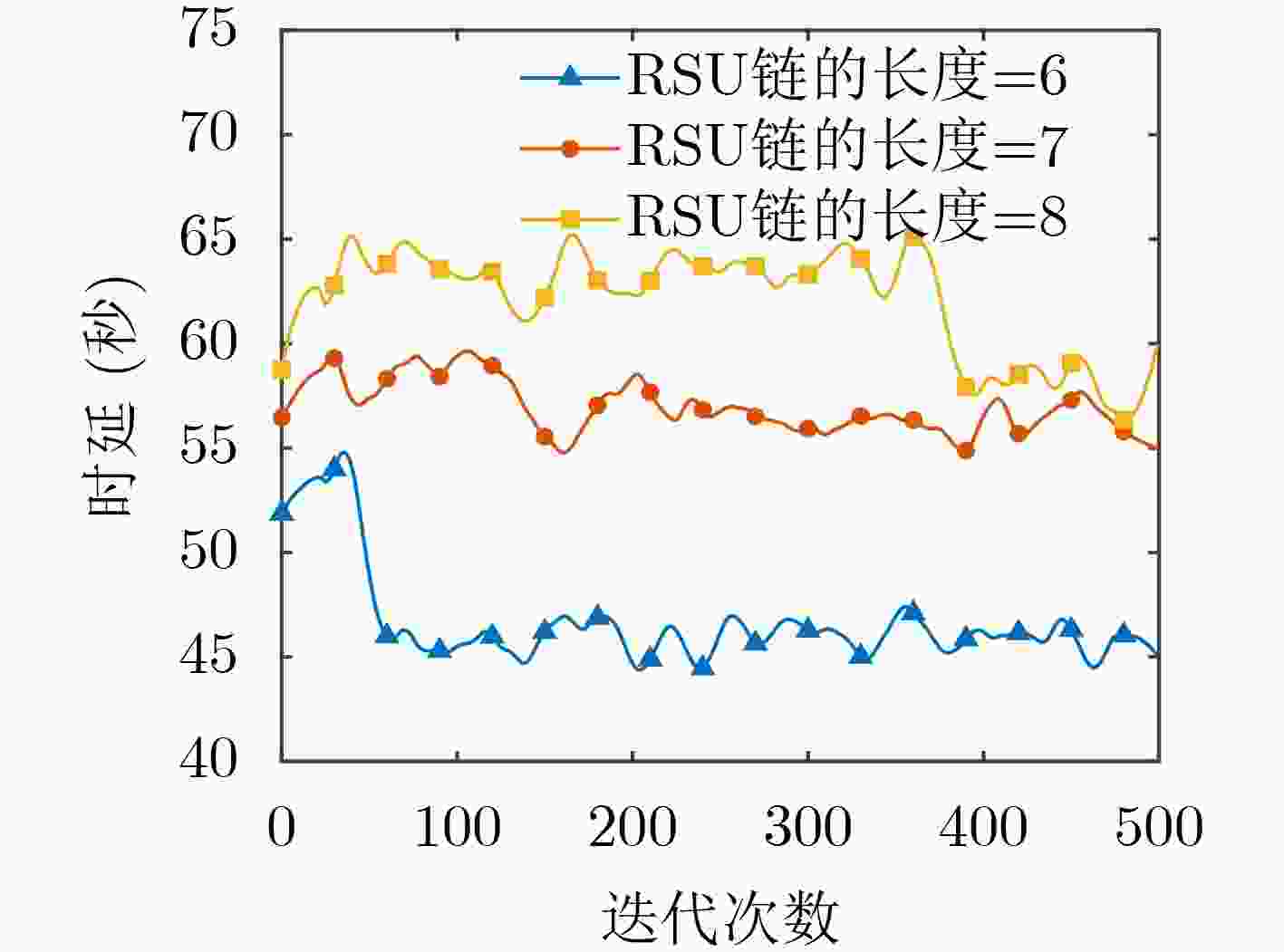 间点的所有部署节点的集合$ \mathcal{B} $,可行RSU链集合$ \mathcal{C} $(1) for t = 0 to T do (2) for n = 0 to N do (3) 如果车辆与RSU的连接状态显示可用,即$ {\mathrm{L}}_{\mathrm{n}}\left(\mathrm{t}\right)=1 $ (4) 将对应的RSU $ {\mathcal{E}}_{\mathrm{n}} $添加到集合$ \mathcal{A} $[t] (5) end for (6) end for (7) for t = 0 to T do (8) 在每个时间点上,从$ \mathcal{A} $[t]中枚举所有可能部署节点,并保存于$ \mathcal{B} $ (9) end for (10) 利用笛卡尔积将 $ \mathcal{B} $中不同时间点组合,生成完整的 RSU 部署链集合$ \mathcal{C} $ 表 1 基本设施参数