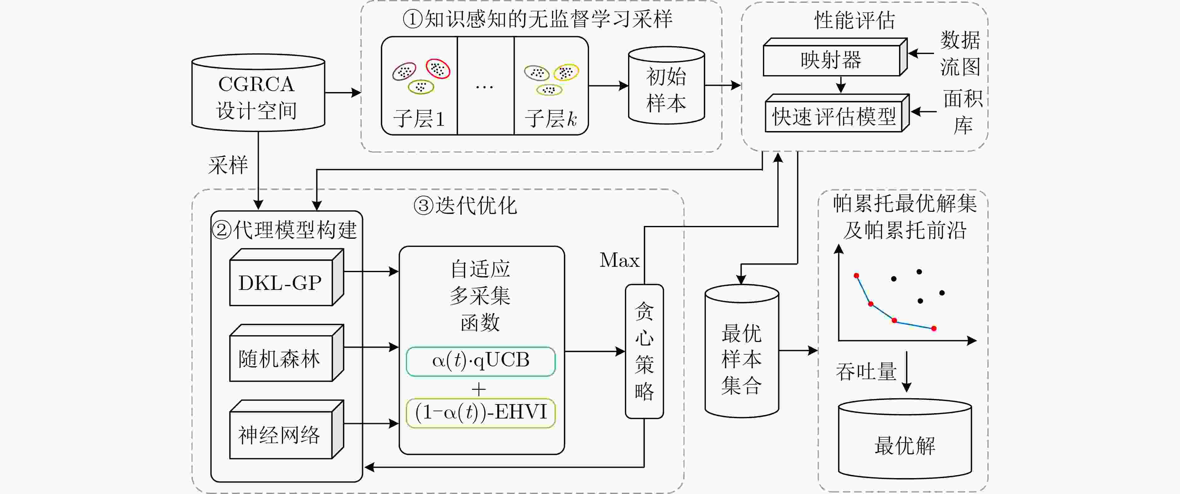 • 摘要: 由于粗粒度可重构密码逻辑阵列(CGRCA)的设计空间规模巨大,导致设计评估耗时长,手工探索优化解的质量不高且搜索效率较低。为此,该文面向CGRCA架构的高维空间、多目标优化特性,提出了基于贝叶斯优化的多目标设计空间探索方法,在平衡吞吐量、面积和FU利用率的同时提升解的质量。首先,该方法利用知识感知的无监督学习采样策略获得初始样本,确保初始样本的代表性与多样性。其次,建立快速评估模型对样本进行量化评估,缩短评估性能的时长。再者,设计自适应的多采集函数并建立基于贪心的混合代理模型,提出多目标贝叶斯优化方法来搜索最优的CGRCA架构,提升搜索效率和通用性。实验结果表明,该文提出的设计空间探索方法较其他设计空间探索方法,与参考集的平均距离(ADRS)至多降低34.9%,超体积提升28.7%,吞吐量提升29.9%,面积减少6.0%,FU利用率提升11.6%,并且展现出优异的跨算法稳定性。