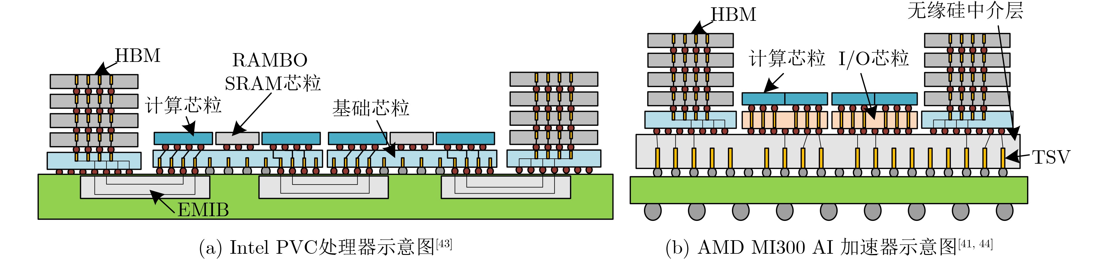 成本2D 有机基板互连。成本低,可靠性高,面积扩展性好;互连密度低 ~10 ~100 ~1.7 1 AMD EPYCTM, RyzenTM [4], Nvidia Simba [11] 2.5D 硅等中介层互连。互连密度较高;面积受限,成本高,可靠性问题 <4 ~50 ~0.5 1.5~(>3)[9] Instinct MI200 series[5], Intel FGPA[15], 华为Kunpeng 920[16], Intel Meteor Lake[17], Intel Sapphire Rapids(SPR)[18], Occamy[19], Manticore[20], Centaur[21], AMD RadeonTM R9 Fury X[28] 3D 垂直堆叠,硅通孔互连。互连密度高,延时、功耗低;成本高,可靠性问题显著 <2 ~40 ~0.15 >3[9,26,27] IntAct[14], HBM[25](商用芯片常见[29–31]), Intel Lakefield[32], SHINSAI[33], Lu等人[34], 华为 Ascend910[35], AMD V-Cache[36], Niu等人[37], Samsung HBM2-PIM[38] 3.5D 2.5D和3D结合。水平垂直互连协同设计,灵活性强;成本高,可靠性问题显著 <1 ~40 <0.1 >3[42] Intel PVC[43], AMD InstinctTM
