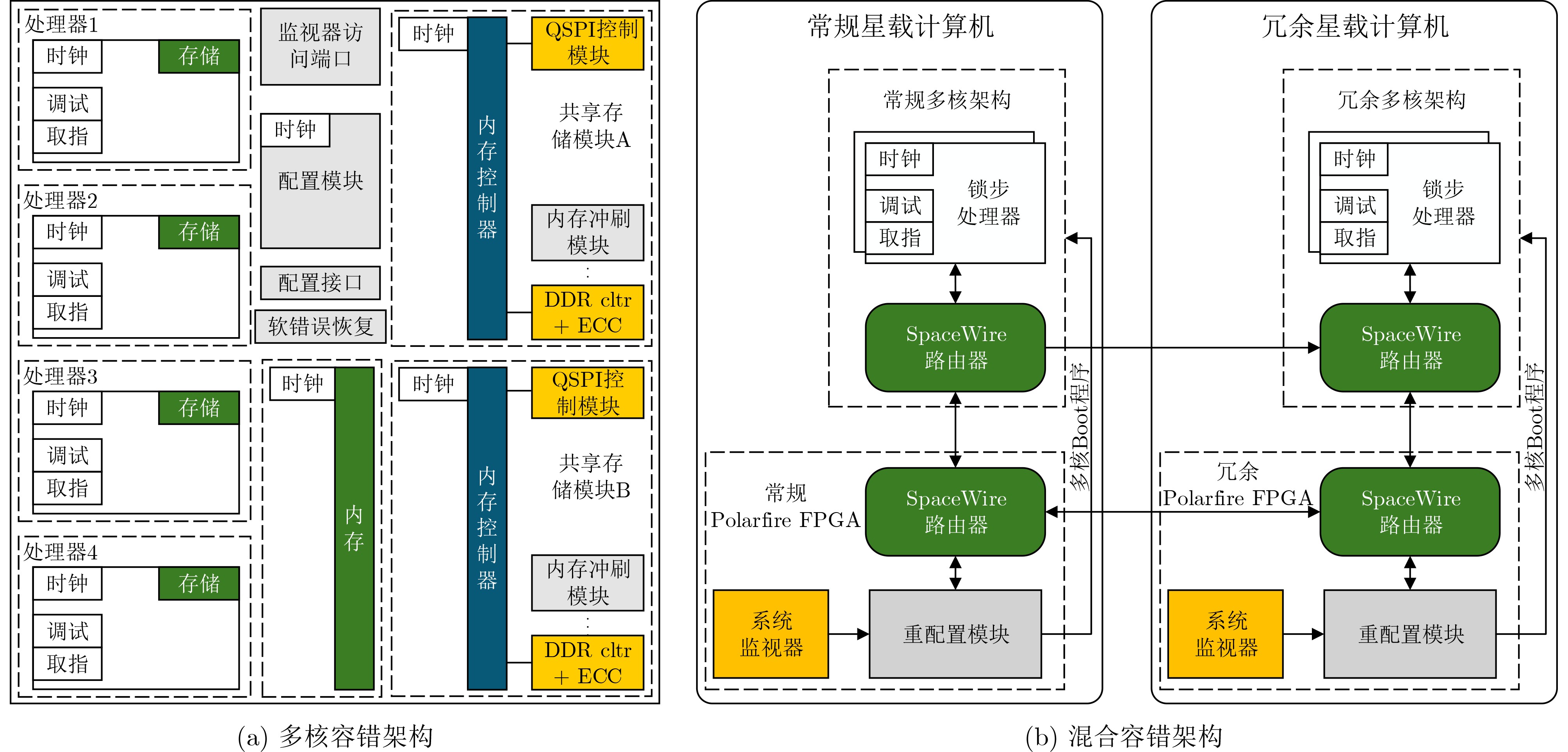 技术 描述 优缺点 TCLS 配置3个内核执行同一任务,进行周期级比对 效率最高的纠错率,但最大的面积与功耗开销 HMR 构建锁步控制矩阵,实现TCLS、DCLS与独立模式快速切换 面积、性能与可靠度之间均衡折中 ODGR 在每3个核间配置多数表决模块,通过软件配置启用或释放冗余模块 额外硬件开销最小,依赖软件恢复周期长 表 4 电路容错技术对比