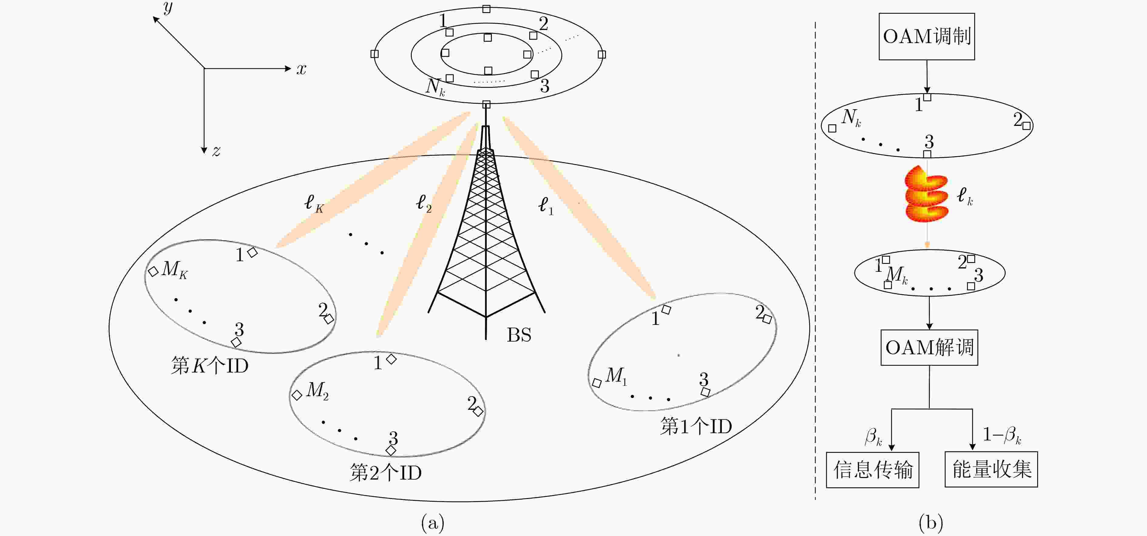 Objective The Internet of Things (IoT) requires not only interconnection among devices but also seamless connectivity among users, information, and things. Ensuring stable operation and extending the lifespan of IoT Devices (IDs) through continuous power supply have become urgent challenges in IoT-driven Sixth-Generation (6G) communications. Radio Frequency (RF) signals can simultaneously transmit information and energy, forming the basis for Simultaneous Wireless Information and Power Transfer (SWIPT). Non-Orthogonal Multiple Access (NOMA), a key technology in Fifth-Generation (5G) communications, enables multiple users to share the same time and frequency resources. Efficient wireless-powered NOMA communication requires a Line-of-Sight (LoS) channel. However, the strong correlation in LoS channels severely limits the degree of freedom, making it difficult for conventional spatial multiplexing to achieve capacity gains. To address this limitation, this study designs an Orbital Angular Momentum (OAM)-based wireless-powered NOMA communication system. By exploiting OAM mode multiplexing, multiple data streams can be transmitted independently through orthogonal OAM modes, thereby significantly enhancing communication capacity in LoS channels. Methods The OAM-based wireless-powered NOMA communication system is designed to enable simultaneous energy transfer and multi-channel information transmission for IDs under LoS conditions. Under the constraints of the communication capacity threshold and the harvested energy threshold, this study formulates a sum-capacity maximization problem by converting harvested energy into the achievable uplink information capacity. The optimization problem is decomposed into two subproblems. A closed-form expression for the optimal Power-Splitting (PS) factor is derived, and the optimal power allocation is obtained using the subgradient method. The transmitting Uniform Circular Array (UCA) employs the Movable Antenna (MA) technique to adjust both position and array angle. To maintain system performance under typical parallel misalignment conditions, a beam-steering method is investigated. Results and Discussions Simulation results demonstrate that the proposed OAM-based wireless-powered NOMA communication system effectively enhances capacity performance compared with conventional wireless communication systems. As the OAM mode increases, the sum capacity of the ID decreases. This occurs because higher OAM modes exhibit stronger hollow divergence characteristics, resulting in greater energy attenuation of the received OAM signals ( Fig. 3 ). The sum capacity of the ID increases with the PS factor (Fig. 4 ). However, as the harvested energy threshold increases, the system’s sum capacity decreases (Fig. 5 ). When the communication capacity threshold increases, the sum capacity first rises and then gradually declines (Fig. 6 ). In power allocation optimization, allocating more power to the ID with the best channel condition further improves the total system capacity.Conclusions To enhance communication capacity under LoS conditions, this study designs an OAM-based wireless-powered NOMA communication system that employs mode multiplexing to achieve independent multi-channel information transmission. On this basis, a sum-capacity maximization problem is formulated under communication capacity and harvested energy threshold constraints by transforming harvested energy into achievable uplink information capacity. The optimization problem is decomposed into two subproblems. A closed-form expression for the optimal PS factor is derived, and the optimal power allocation is obtained using the subgradient method. In future work, the MA technique will be integrated into the proposed OAM-based wireless-powered NOMA system to further optimize sum-capacity performance based on the three-dimensional spatial configuration and adjustable array angle. -