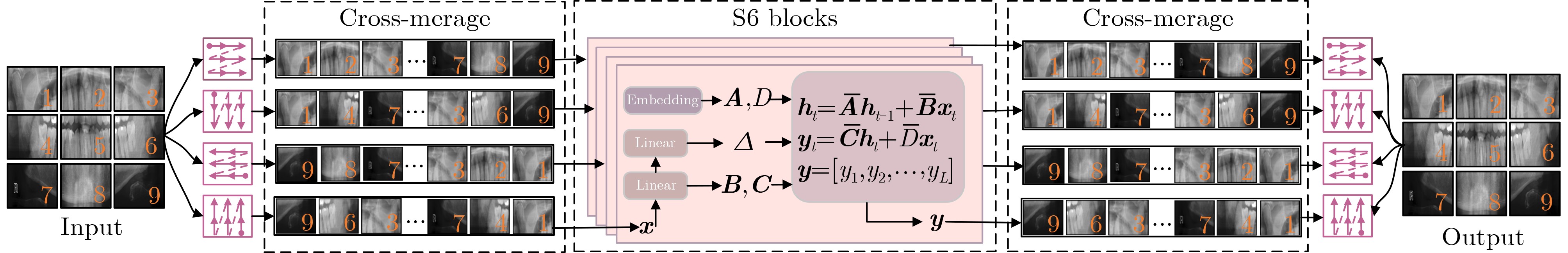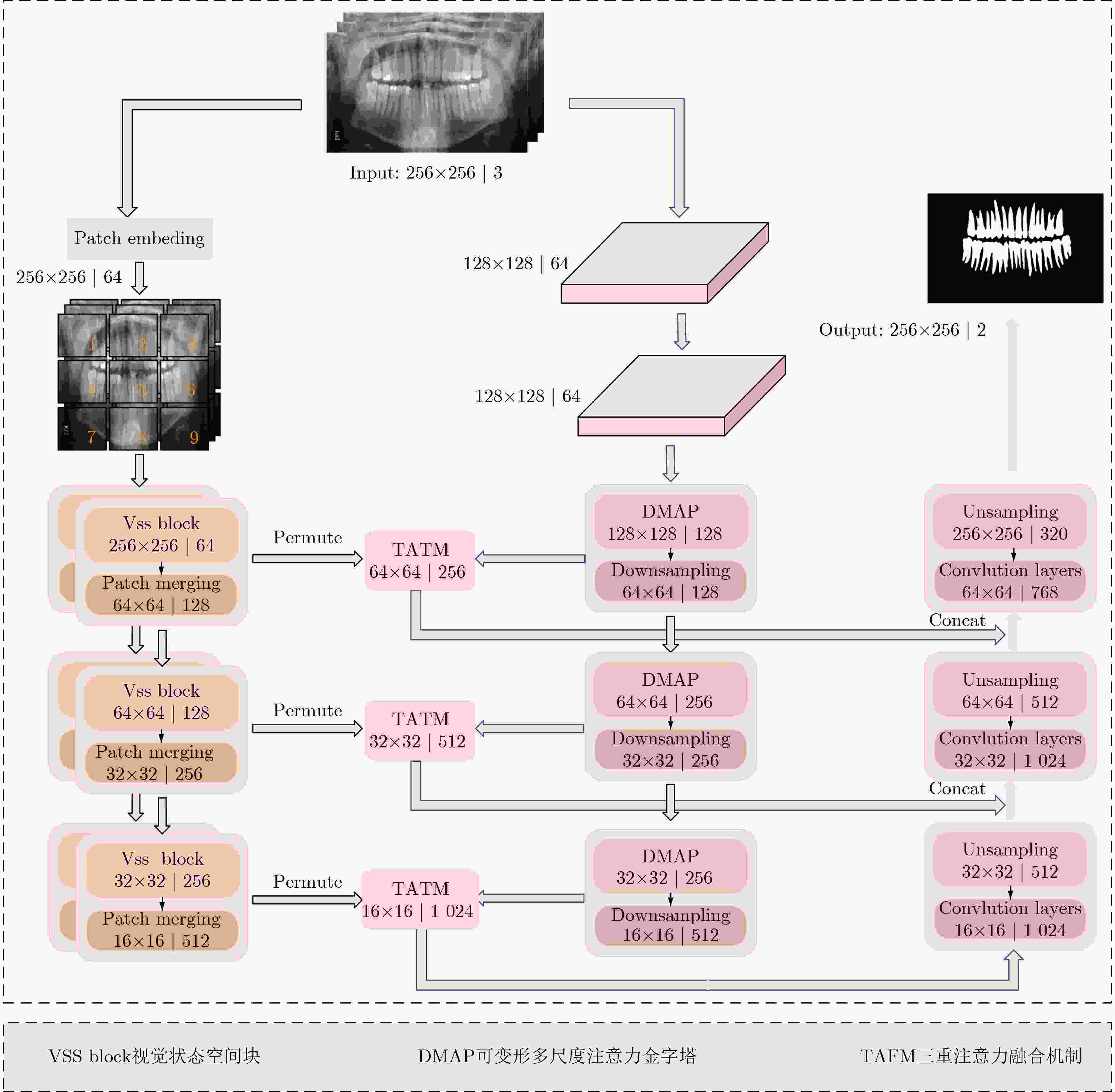 [1] RUAN Jiacheng, XIE Mingye, GAO Jingsheng, et al. EGE-UNet: An efficient group enhanced UNet for skin lesion segmentation[C]. Proceedings of the 26th International Conference on Medical Image Computing and Computer Assisted Intervention, Vancouver, Canada: Springer, 2023: 481–490. doi: 10.1007/978-3-031-43901-8_46. [2] CHEN Junren, CHEN Rui, WANG Wei, et al. TinyU-Net: Lighter yet better U-Net with cascaded multi-receptive fields[C]. Proceedings of the 27th International Conference on Medical Image Computing and Computer Assisted Intervention, Marrakesh, Morocco: Springer, 2024: 626–635. doi: 10.1007/978-3-031-72114-4_60. [3] CAO Hu, WANG Yueyue, CHEN J, et al. Swin-Unet: Unet-like pure transformer for medical image segmentation[C]. Proceedings of the 17th European Conference on Computer Vision, Tel Aviv, Israel: Springer, 2023: 205–218. doi: 10.1007/978-3-031-25066-8_9. [4] CHEN Jieneng, LU Yongyi, YU Qihang, et al. TransUNet: Transformers make strong encoders for medical image segmentation[J]. arXiv preprint arXiv: 2102.04306, 2021. doi: 10.48550/arXiv.2102.04306. [5] SUN Guanqun, PAN Yizhi, KONG Weikun, et al. DA-TransUNet: Integrating spatial and channel dual attention with transformer U-Net for medical image segmentation[J]. Frontiers in Bioengineering and Biotechnology, 2024, 12: 1398237. doi: 10.3389/fbioe.2024.1398237. [6] LEE H H, BAO Shunxing, HUO Yuankai, et al. 3D UX-Net: A large kernel volumetric convnet modernizing hierarchical transformer for medical image segmentation[C]. Proceedings of the 11th International Conference on Learning Representations, Kigali, Rwanda: ICLR, 2023. [7] ZHOU Hongyu, GUO Jiansen, ZHANG Yinghao, et al. nnFormer: Volumetric medical image segmentation via a 3D transformer[J]. IEEE Transactions on Image Processing, 2023, 32: 4036–4045. doi: 10.1109/TIP.2023.3293771. [8] HATAMIZADEH A, NATH V, TANG Yucheng, et al. Swin UNETR: Swin transformers for semantic segmentation of brain tumors in MRI images[C]. Proceedings of the 7th International Workshop on Brainlesion: Glioma, Multiple Sclerosis, Stroke and Traumatic Brain Injuries, Springer, 2021: 272–284. doi: 10.1007/978-3-031-08999-2_22. [9] GU A and DAO T. Mamba: Linear-time sequence modeling with selective state spaces[J]. arXiv preprint arXiv: 2312.00752, 2023. doi: 10.48550/arXiv.2312.00752. [10] RUAN Jiacheng, LI Jincheng, and XIANG Suncheng. VM-UNet: Vision mamba UNet for medical image segmentation[J]. ACM Transactions on Multimedia Computing, Communications and Applications, 2025. doi: 10.1145/3767748. [11] HAO Jing, ZHU Yonghui, HE Lei, et al. T-Mamba: A unified framework with long-range dependency in dual-domain for 2D & 3D tooth segmentation[J]. arXiv preprint arXiv: 2404.01065, 2024. doi: 10.48550/arXiv.2404.01065. [12] LIN Xian, XIANG Yangyang, YU Li, et al. Beyond adapting SAM: Towards end-to-end ultrasound image segmentation via auto prompting[C]. Proceedings of the 27th International Conference on Medical Image Computing and Computer Assisted Intervention, Marrakesh, Morocco: Springer, 2024: 24–34. doi: 10.1007/978-3-031-72111-3_3. [13] LIN P L, HUANG P Y, HUANG P W, et al. Teeth segmentation of dental periapical radiographs based on local singularity analysis[J]. Computer Methods and Programs in Biomedicine, 2014, 113(2): 433–445. doi: 10.1016/j.cmpb.2013.10.015. [14] MAHDI F P and KOBASHI S. Quantum particle swarm optimization for multilevel thresholding-based image segmentation on dental X-ray images[C]. Proceedings of the Joint 10th International Conference on Soft Computing and Intelligent Systems and 19th International Symposium on Advanced Intelligent Systems, Toyama, Japan: IEEE, 2018: 1148–1153. doi: 10.1109/SCIS-ISIS.2018.00181. [15] SON L H and TUAN T M. A cooperative semi-supervised fuzzy clustering framework for dental X-ray image segmentation[J]. Expert Systems with Applications, 2016, 46: 380–393. doi: 10.1016/j.eswa.2015.11.001. [16] PUSHPARAJ V, GURUNATHAN U, ARUMUGAM B, et al. An effective numbering and classification system for dental panoramic radiographs[C]. Proceedings of the 4th International Conference on Computing, Communications and Networking Technologies, Tiruchengode, India: IEEE, 2013: 1–8. doi: 10.1109/ICCCNT.2013.6726480. [17] ALSMADI M K. A hybrid Fuzzy C-Means and Neutrosophic for jaw lesions segmentation[J]. Ain Shams Engineering Journal, 2018, 9(4): 697–706. doi: 10.1016/j.asej.2016.03.016. [18] KOCH T L, PERSLEV M, IGEL C, et al. Accurate segmentation of dental panoramic radiographs with U-NETS[C]. Proceedings of the 2019 IEEE 16th International Symposium on Biomedical Imaging, Venice, Italy: IEEE, 2019: 15–19. doi: 10.1109/ISBI.2019.8759563. [19] ZANNAH R, BASHAR M, MUSHFIQ R B, et al. Semantic segmentation on panoramic dental X-ray images using U-Net architectures[J]. IEEE Access, 2024, 12: 44598–44612. doi: 10.1109/ACCESS.2024.3380027. [20] IMAK A, ÇELEBI A, POLAT O, et al. ResMIBCU-Net: An encoder–decoder network with residual blocks, modified inverted residual block, and bi-directional ConvLSTM for impacted tooth segmentation in panoramic X-ray images[J]. Oral Radiology, 2023, 39(4): 614–628. doi: 10.1007/s11282-023-00677-8. [21] LI Yunxiang, WANG Shuai, WANG Jun, et al. GT U-Net: A U-net like group transformer network for tooth root segmentation[C]. Proceedings of the Machine Learning in Medical Imaging: 12th International Workshop, Strasbourg, France: Springer, 2021: 386–395. doi: 10.1007/978-3-030-87589-3_40. [22] SHENG Chen, WANG Lin, HUANG Zhenhuan, et al. Transformer-based deep learning network for tooth segmentation on panoramic radiographs[J]. Journal of Systems Science and Complexity, 2023, 36(1): 257–272. doi: 10.1007/s11424-022-2057-9. [23] LI Pengcheng, GAO Chenqiang, LIAN Chunfeng, et al. Spatial prior-guided bi-directional cross-attention transformers for tooth instance segmentation[J]. IEEE Transactions on Medical Imaging, 2024, 43(11): 3936–3948. doi: 10.1109/TMI.2024.3406015. [24] LIU Yue, T