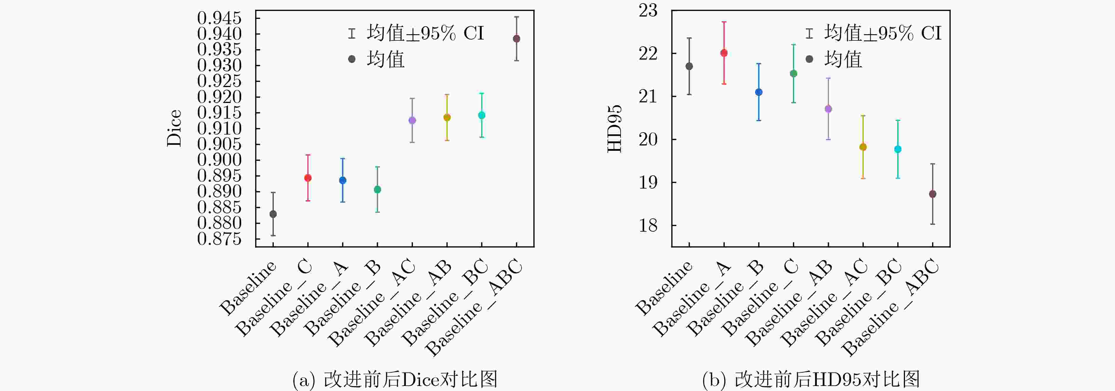 Dice(%) HD95 Accuracy(%) Recall(%) Precision(%) 模型大小(MB) 参数量(M) baseline 88.17 21.70 93.03 87.97 86.73 84.24 93.19 baseline_A 89.41 22.01 93.67 88.24 87.07 79.23 88.43 baseline_B 89.16 22.10 93.74 88.32 87.42 81.15 89.16 baseline_C 89.73 21.53 93.86 88.87 87.13 78.59 85.63 baseline_AB 91.32 20.71 94.07 89.03 87.26 82.15 91.52 baseline_AC 91.24 19.82 94.20 89.24 87.34 83.41 92.31 baseline_BC 91.53 19.77 94.13 89.37 87.42 81.68 90.74 本文 93.86 18.73 94.57 90.46 88.03 81.23 90.10 表 2 对比实验指标对比