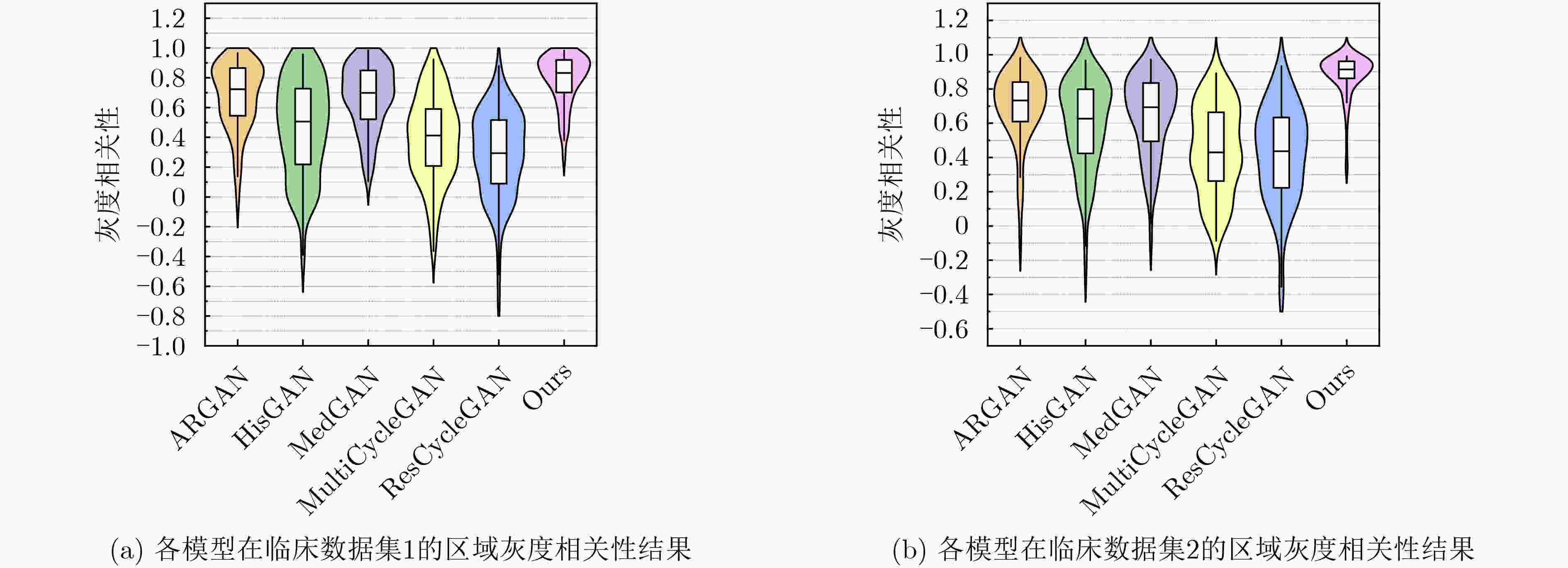 方法 MSE↓ MSE p值 PSNR↑ PSNR p值 SSIM↑ SSIM p值 HisGAN 0.0337 ±0.0209 *3×10–137 20.24±2.57* 3×10–174 0.601±0.112* 3×10–106 ARGAN 0.0296 ±0.0170 *1×10–181 20.66±2.25* 7×10–220 0.611±0.089* 2×10–218 MedGAN 0.0313 ±0.0206 *4×10–146 20.54±2.45* 5×10–190 0.625±0.074* 4×10–158 MultiCycleGAN 0.0462 ±0.0273 *7×10–256 18.82±2.44* 3×10–263 0.556±0.085* 9×10–263 ResCycleGAN 0.0345 ±0.0240 *1×10–160 20.19±2.56* 1×10–193 0.618±0.079* 5×10–154 本文方法 0.0155 ±0.0154 - 24.17±3.12 - 0.678±0.073 - 表 5 跨中心泛化实验指标(临床数据集2训练、临床数据集1测试)