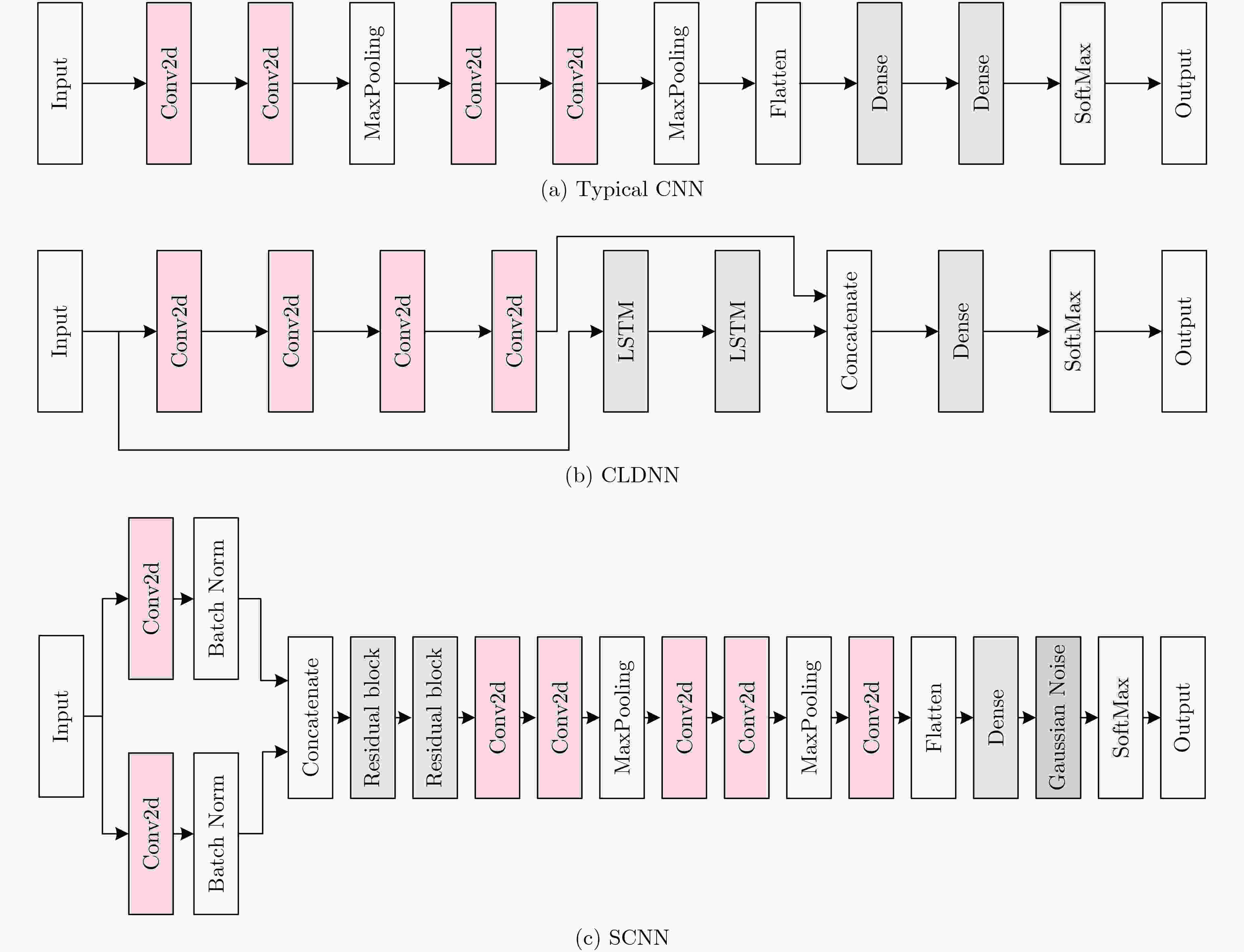 AMC方法 候选调制方式 信噪比(dB) 准确率(%) P-LSTM[24] {B/Q/8PSK, 16/32QAM} 0:5:20 99.30 at 5 dB 3D CNN[26] {B/Q/8PSK, 16QAM} –15:5:30 > 95.00 at 0 dB 可分离CNN[29] {2/4/8FSK, B/Q/8PSK, 16QAM} –10:2:20 83.44 分布式CNN[31] RadioML 2016.10a –20:2:18 平均62.41 信噪比分类网络[32] RadioML 2016.10a –20:2:18 86.00 at 0 dB CNN[33] RadioML 2018.01a 0:2:30 > 90.00 at 0 dB CNN[34] RadioML 2016.10a –20:2:18 平均63.8 CNN[35] RadioML 2016.10a –20:2:18 > 85.00 at 0 dB MWD-CNN[36] RadioML 2016.10a –20:2:18 平均62.52 CNN[37] {BPSK, QPSK, 16QAM, 64QAM, GFSK, CPFSK} 30 97.00 ANR CNN[38] RadioML 2016.10a –20:2:18 平均61.75 MobileNetV2[39] RadioML 2016.10a 20 95.00 ResNet-LSTM[41] RadioML 2016.10b –20:2:18 > 90.00 at 0 dB CBAM-GRU[43] RadioML 2016.10a –20:2:18 > 92.79 at 0 dB GR-ResNet[44] RadioML 2016.10a –6:2:18 平均83.57 多注意力ResNet-GRU[45] RadioML 2016.10b –20:2:18 平均64.78 LSTM-Transformer[46] RadioML 2016.10a –20:2:18 > 89.90 at 0 dB ResNet-Transformer[48] RadioML 2018.01a –20:2:30 平均62.61 Bottleneck Transformer[49] {PAM2, PAM4, PAM8, PAM16, BPSK, QPSK} 8:2:30 99.16 at 8 dB Transformer[50] RadioML 2016.10a 0:2:18 平均91.90 CNN-Transformer[51] RadioML 2016.10b –20:2:18 平均64.01 Meta-Transformer[52] RadioML 2018.01a –20:2:30 95.76 at 20 dB 稀疏Transformer[71] RadioML 2016.10a, RML22 –20:2:20 平均71.13 KAN-CNN[70] RadioML 2018.01a –20:2:30 平均65.56 Ultra Lite CNN[69] RadioML 2016.10a –20:2:18 平均62.47 PCTNet[72] RadioML 2016.10b –20:2:18 平均64.60 双流Transformer[73] {OFDM, 2/4/8FSK, B/Q/8PSK, 16/64QAM} –10:2:20 > 85.00 at 0 dB 自适应小波网络[74] RadioML 2016.10a/b, RadioML 2018.01a –20:2:18/-20:2:30 平均62.44 时空CNN[75] RadioML 2016.10a –20:2:18 平均61.50 多端CNN[76] {B/Q/OQ/8PSK, 16/64QAM, 16/32APSK} 0:1:10 95.00 at 5 dB HKDD[53] HKDD_AMC12, HKDD_AMC36 –20:2:20/-20:2:30 > 90.00 at 20 dB GGCNN[54] RadioML 2018.01a –20:2:30 > 80.00 at 20 dB ResSwinT–SwinT[58] {CW, SIN/LFM, B/4FSK, B/QPSK, polyphase codes} –14:2:10 99.80 at 0 dB DL-EVT[61] RadioML 2018.01a 0:2:30 > 90.00 at 8 dB 图卷积神经网络[68] {2/4ASK, 2/4FSK, B/QPSK, 16/64QAM} –14:2:10 > 70.00 at 2 dB 对比自监督学习[77] RadioML 2018.01a –20:2:30 49.50 at -5 dB 阈值去噪RNN[78] RadioML 2018.01a –20:2:30 平均63.50 GIGNet[79] RadioML 2016.10a –20:2:18 平均63.83 多尺度自适应小波分解网络[80] HisarMod 2019.1 –20:2:18 平均74.40 DCTFANet[81] RadioML 2016.10a –20:2:18 平均71.60 卷积双注意力Transformer[82] RadioML 2018.01a –20:2:30 平均63.86 M2–Net[83] Multiband signals –20:2:10 平均51.17 自监督对齐数据增强网络[84] RadioML 2016.10a –10:2:0 平均72.19 KG-MTSNet[85] RadioML 2016.10a –6:2:18 平均86.63 FTPNet[86] RadioML 2018.01a –20:2:30 平均56.44 -