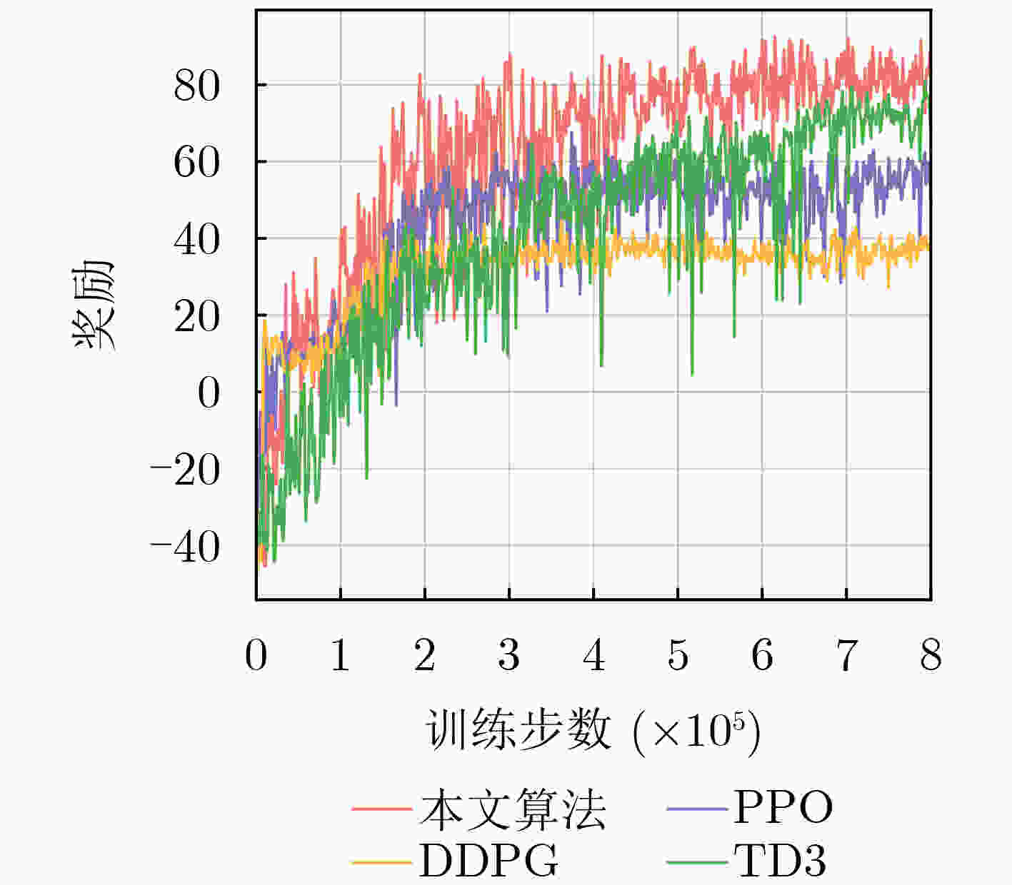 (1)初始化环境参数 (2)初始化评论网络参数、策略网络参数和目标网络参数 (3) 对每个训练周期执行: (4) 对每个环境交互步骤执行: (5) 根据当前状态$ s{_{{l}}} $从策略分布$ {\pi _\phi }({a_l}|{s_l}) $中采样动作$ {a_l} $ (6) 观察奖励$ r({s_l},{a_l}) $和下一个状态 (7) 将转移元组$ ({s_l},{a_l},r({s_l},{a_l}),{s_{l + 1}}) $存入经验回放缓冲区$ \mathcal{D} $ (8) 结束该环境步循环 (9) 对每个梯度更新步骤执行: (10) 从$ \mathcal{D} $中采样小批次样本 (11) 计算损失函数$ {L_Q}\left( \omega \right) $和$ {L_\pi }(\phi ) $ (12) 根据梯度下降公式$ \boldsymbol{\alpha}\leftarrow\boldsymbol{\alpha}-\lambda_{\boldsymbol{\alpha}}\mathit{\nabla}_{\boldsymbol{\alpha}}L(\boldsymbol{\alpha}) $更新温度参数 (13) 对目标网络执行软更新$ {\hat \omega _{{i}}} \leftarrow {\tau _\pi }{\omega _i} + (1 - {\tau _\pi }){\hat \omega _i} $,