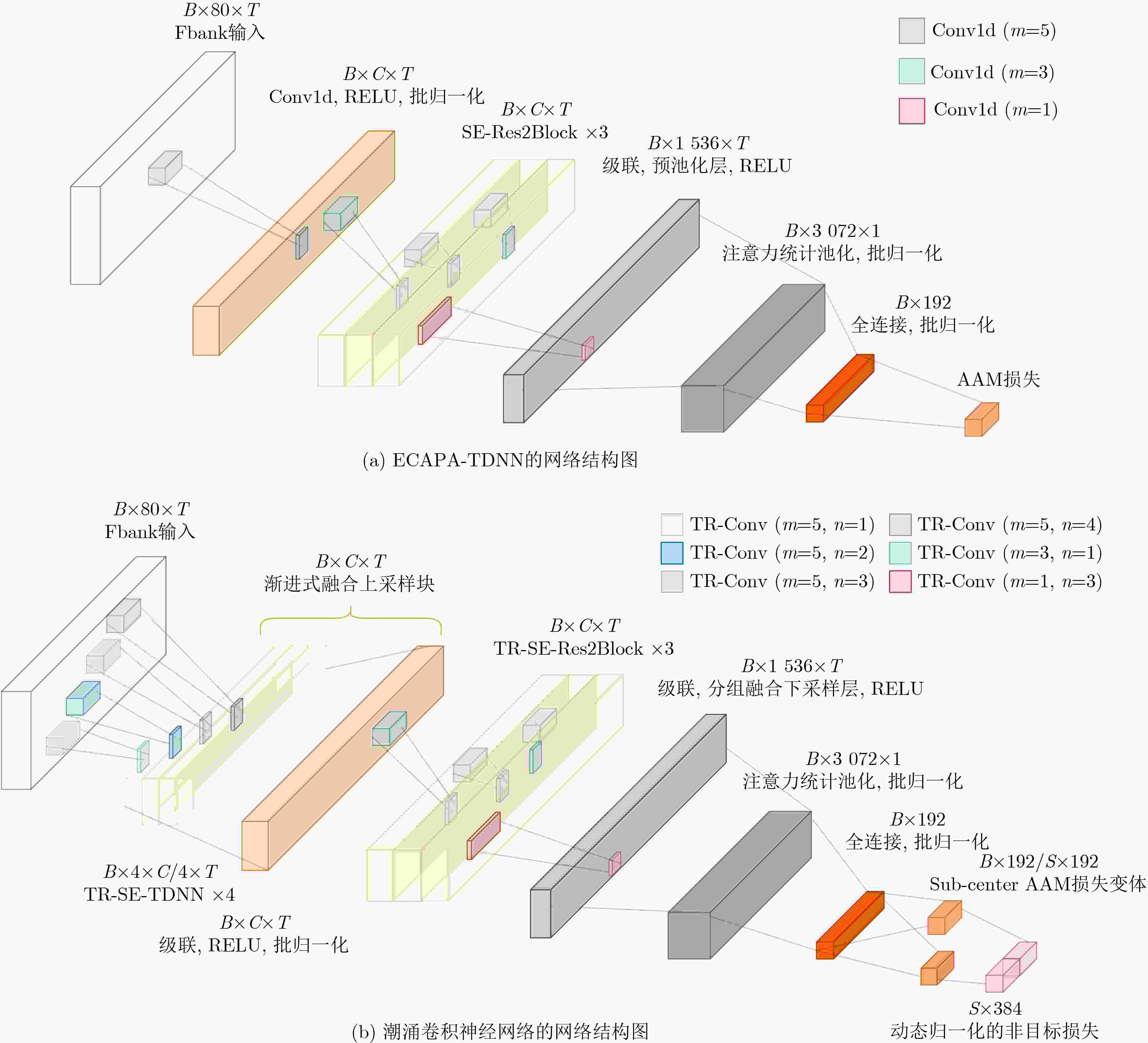 • 摘要: 近年来,最先进的说话人确认模型大多数以牺牲参数量和计算量的代价来实现感受野的固定获取,鉴于语音信号内部蕴含着丰富且多层次的信息,然而通过高度自主选择的动态感受野来描绘复杂信息是相对未被探索的,更没有直观的解释是什么构成了关于有效感受野的最佳实践。潮涌现象表现为潮水前端形成陡立水墙并伴随轰鸣声高速推进,受其非线性耦合行为的启发,提出潮涌卷积(TR-Conv)“使用潮涌感受野(T-RRF),获得更有效感受野”。首先采用二幂插值操作构建窗口内的主/从感受野,随后分别采用扫描-池化机制聚焦提取窗口外的关键信息、算子机制精细感知窗口内的差异信息,最后融合三重感受野,得到兼具多尺度、动态性、有效性的可变感受野。为全面验证潮涌卷积的表现,建立潮涌卷积神经网络(TR-CNN)。另外,针对数据集的错误标签问题,提出动态归一化的非目标(NTDN)损失与具有两个子中心的加性角边距(Sub-Center AAM)损失变体加权融合的总损失,以提升模型性能。实验结果表明,与ECAPA-TDNN(C=512)相比,TR-CNN(C=512, n=1)分别在测试集Vox1-O、Vox1-E、Vox1-H上的等错误率(EER)和最小检测代价函数(MinDCF)相对降低了4.95%、31.55%,4.03%、17.14%和6.03%、17.42%,参数量和乘加累积操作次数相对减少了32.7%、23.5%。进一步,TR-CNN(C=1024, n=1)的EER/MinDCF分别是0.85%、0.0762,1.10%、0.1048,2.05%、0.1739。本研究代码已开源:https://github.com/splab-HRBUST/TR-CNN。
