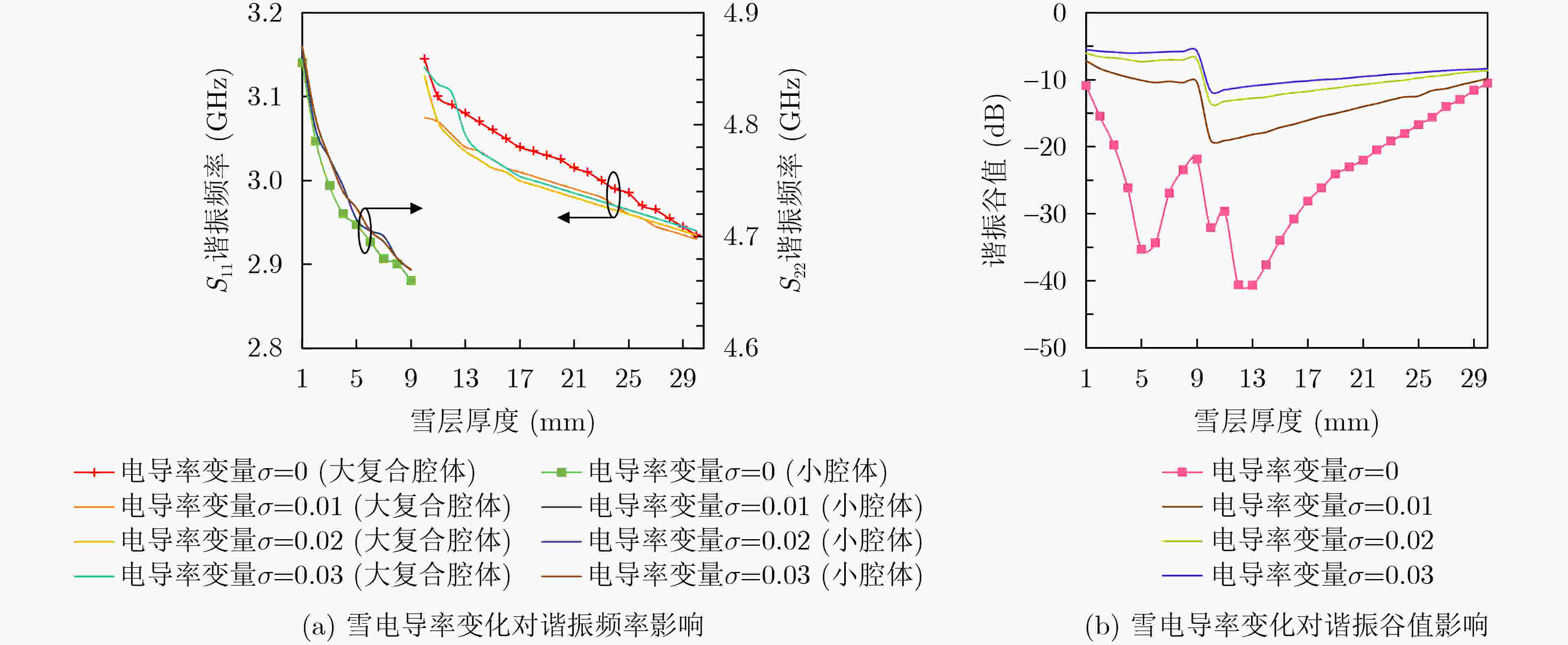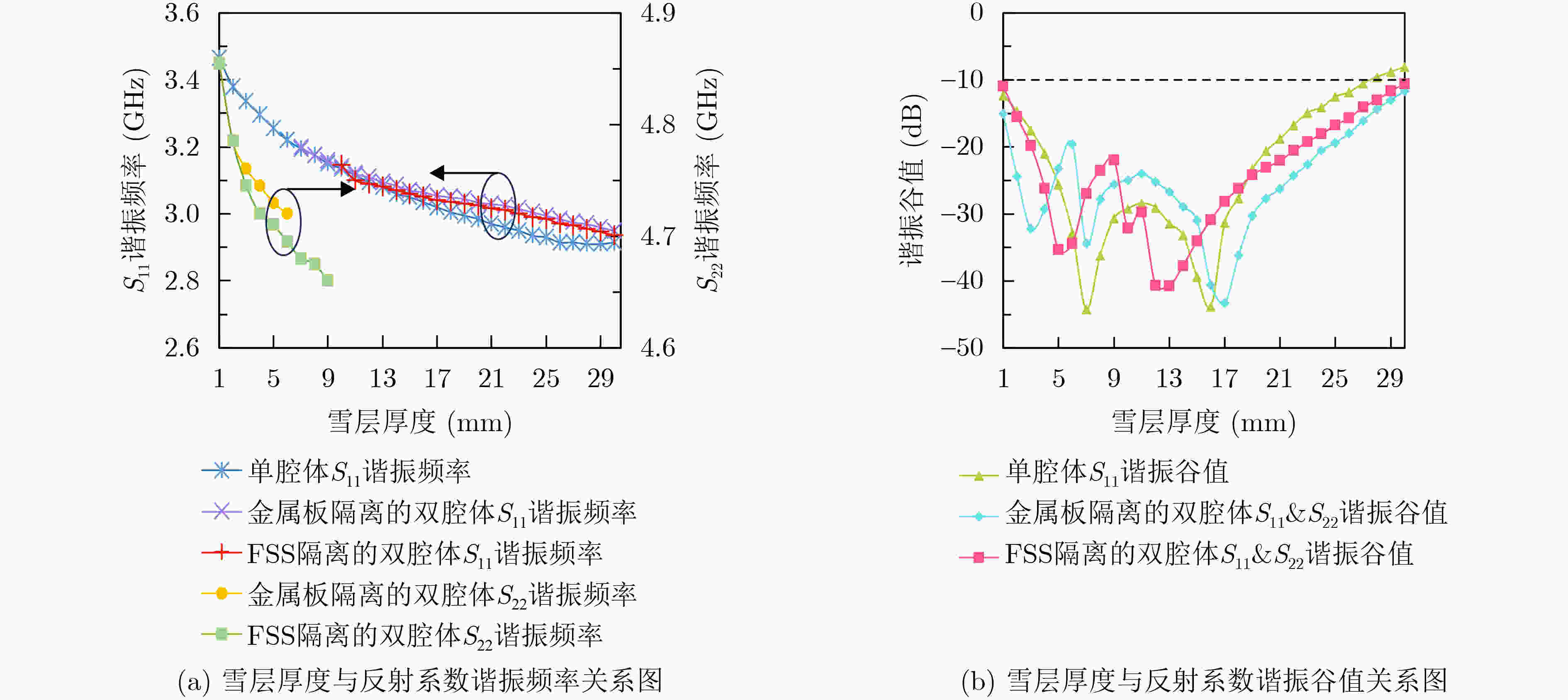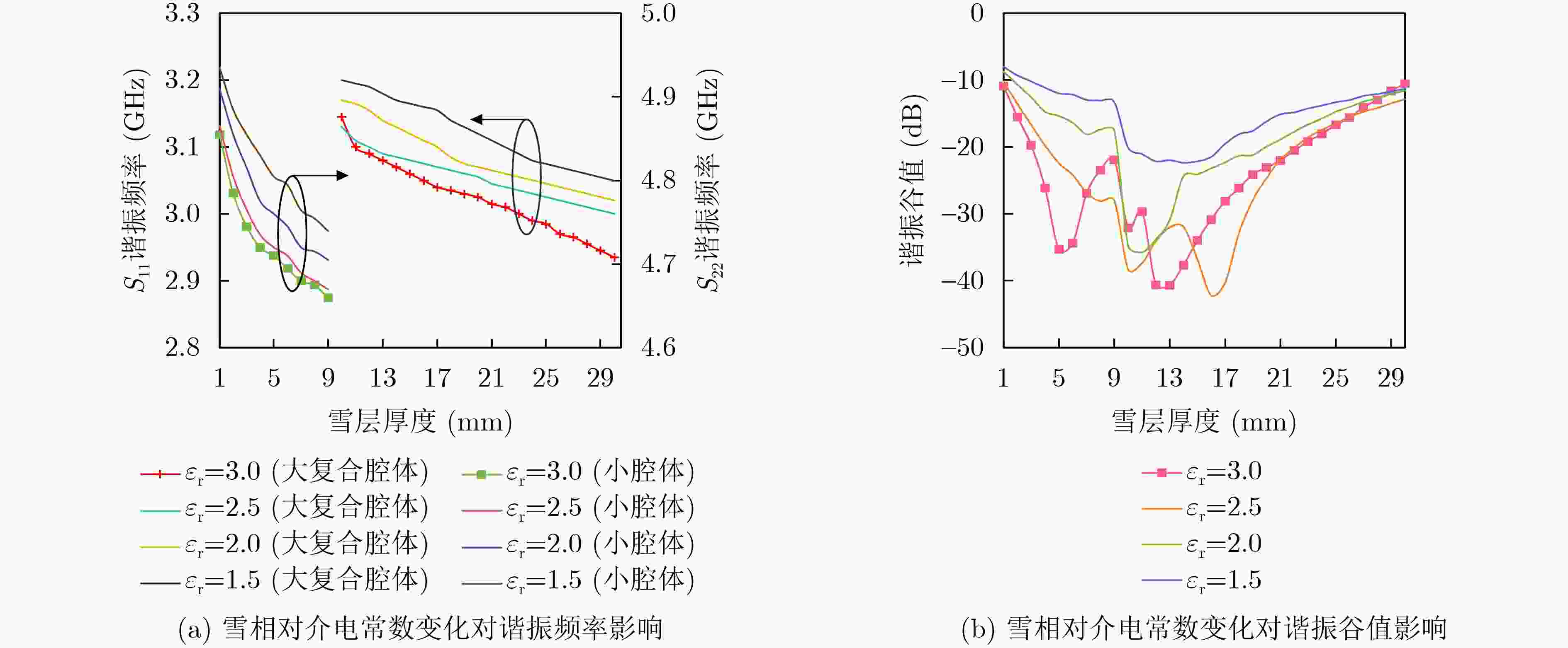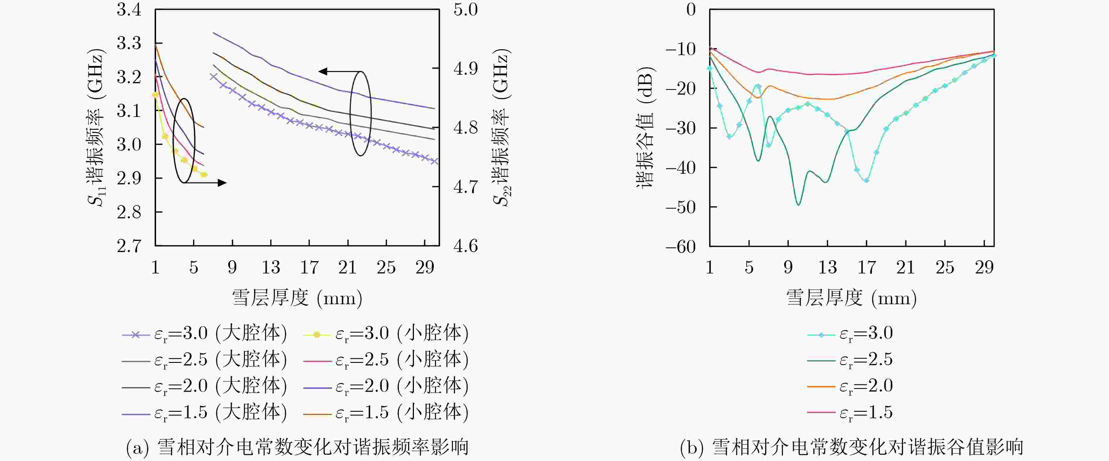 摘要: 能实时准确测量雪层厚度并进行预警的设备对于保护冬季长时间暴露在外界环境中的供电、通信和雷达等设备具有重要的应用价值。该文研究了基于微波矩形波导开口双腔体的雪层厚度测试方法,设计了对应的测量装置,给出了相关的构造、参数获取和数据反演策略。在此过程中,提出了基于单舱内嵌入金属隔板或频率选择表面(FSS)隔板的双腔双馈电双频段测试方法,通过大腔体低频大动态范围和小腔体高频高精度的策略结合参数相关处理算法,合理解决了大量程和高测试精度之间的矛盾。论文分析了自然降落覆盖在谐振腔开口处的不同雪层厚度对腔体的反射系数谐振频率和S参数的影响,并讨论了雪的密度、湿度对厚度测量精度的影响,比较了不同反演算法的效果,实现了1~30 mm的雪层厚度的分段测量,反演算法精度达到0.16 mm。测试精度优于1 mm。对应的技术和设备可直接或扩展用于以雪厚测试为代表的介质几何参数测试。Abstract: