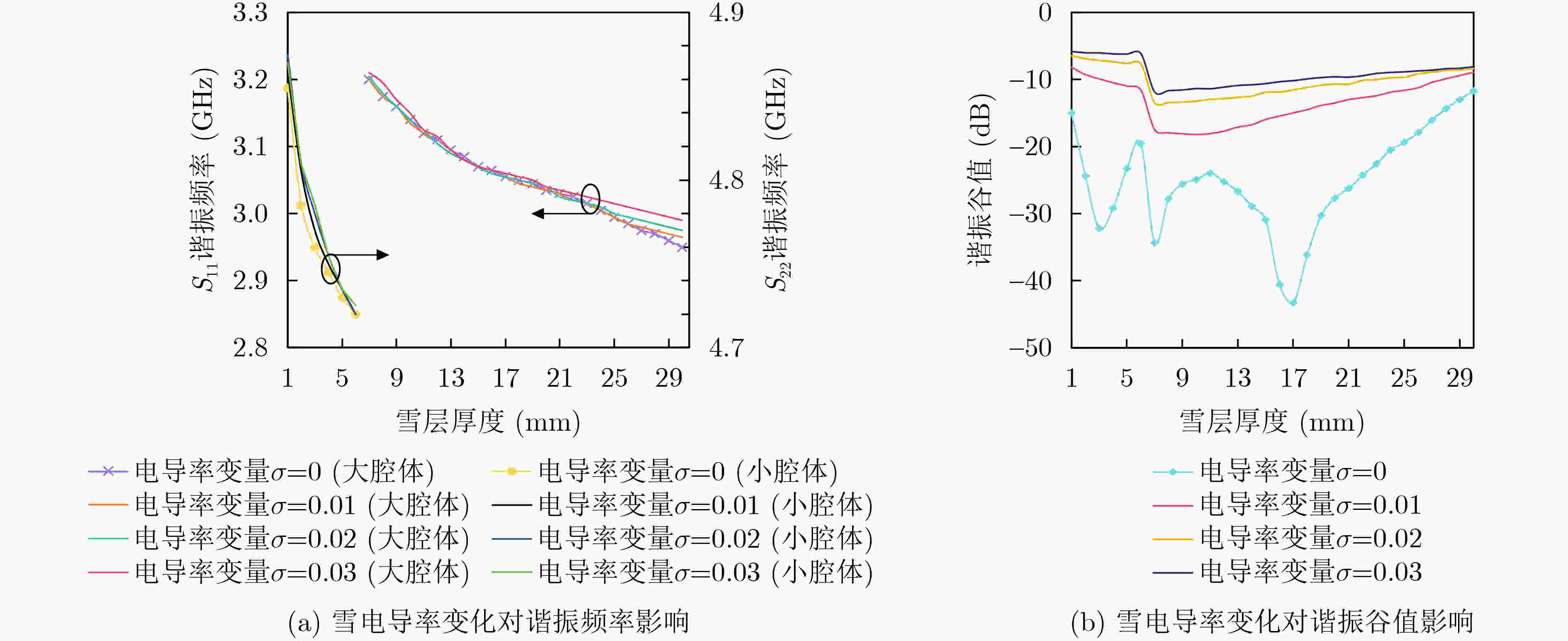 Objective Large-scale winter snowfall poses a significant threat to the safety of outdoor infrastructure, including power transmission and communication systems. Real-time monitoring of snow depth within the range of 1~30 mm is required for accurate early warning and effective snow removal scheduling. Satellite- and radar-based techniques are mainly applied to snow depths exceeding 10 cm, but their large size and limited spatial resolution restrict their applicability to near-surface measurements. Although recently developed planar resonant sensors based on the resonance principle improve measurement accuracy, their effective measurement range remains limited. To resolve the trade-off between measurement range and accuracy, a rectangular microwave open resonant cavity featuring a dual-cavity, dual-feed, and dual-frequency-band configuration is proposed in combination with a data inversion algorithm. This scheme achieves a wide dynamic range of 1~30 mm while maintaining a measurement accuracy of 1 mm. The proposed device meets the monitoring requirements for snow depth corresponding to six snowfall intensity grades, ranging from light snow to heavy snowstorms. Methods The research methodology consists of four main stages. First, the phase-matching condition of the resonator formed by the open-ended waveguide and the snow layer is used to derive an analytical relationship between resonant frequency and snow depth, thereby verifying the feasibility of the measurement principle. Subsequently, a single-cavity model with coaxial feed is designed and simulated to evaluate its sensitivity to snow depths from 1 to 25 mm and to determine the corresponding operating frequency band. To further extend the measurement range, a dual-cavity, dual-feed model is constructed using either a metal plate or a Frequency Selective Surface (FSS) as a separator. A segmented measurement strategy is adopted, in which the large cavity and small cavity are responsible for different snow thickness intervals, enabling stable measurements with a precision of 1 mm over the full 1~30 mm range under different snow conditions. Finally, an optimal data inversion scheme is selected and implemented to further improve measurement accuracy. Results and Discussions A snow depth measurement technique based on a dual-band open-ended microwave resonant cavity is demonstrated. The dynamic measurement range is extended from 1~25 mm ( Fig. 4 ) for the single-cavity configuration to 1~30 mm (Fig. 9 ) for the dual-cavity configuration. Simulation results show that the dual-cavity model maintains stable performance under variations in snow physical properties (Fig. 10 ~13 ). As snow depth increases, the resonant frequency exhibits a regular shift toward lower frequencies (Fig. 9(a) ), whereas the attenuation remains below –10 dB (Fig. 9(b) ), achieving a measurement precision of 1 mm. Experimental results show trends consistent with the simulations (Fig. 15 ). When combined with the data inversion scheme, the inversion error is less than 0.16 mm (Table 5 ), satisfying the requirements for both wide dynamic range and high measurement accuracy.Conclusions A dual-cavity, dual-feed, and dual-frequency snow depth measurement method employing either a metal plate or an FSS plate as a cavity separator is proposed. The limited dynamic range of conventional single-cavity designs is addressed through the constructed dual-cavity architecture. Measurement resolution is improved by assigning different snow thickness ranges to the two frequency bands and applying a data inversion algorithm. Experimental results demonstrate that the proposed method enables segmented measurement of snow depth from 1 to 30 mm, with an inversion accuracy of 0.16 mm and a measured precision better than 1 mm. The effects of variations in snow density and snow moisture content on resonant frequency and attenuation are analyzed. For future research, machine learning methods are suggested to associate measurement parameters with meteorological parameters, thereby improving measurement accuracy and extending the early-warning capability of the system. -