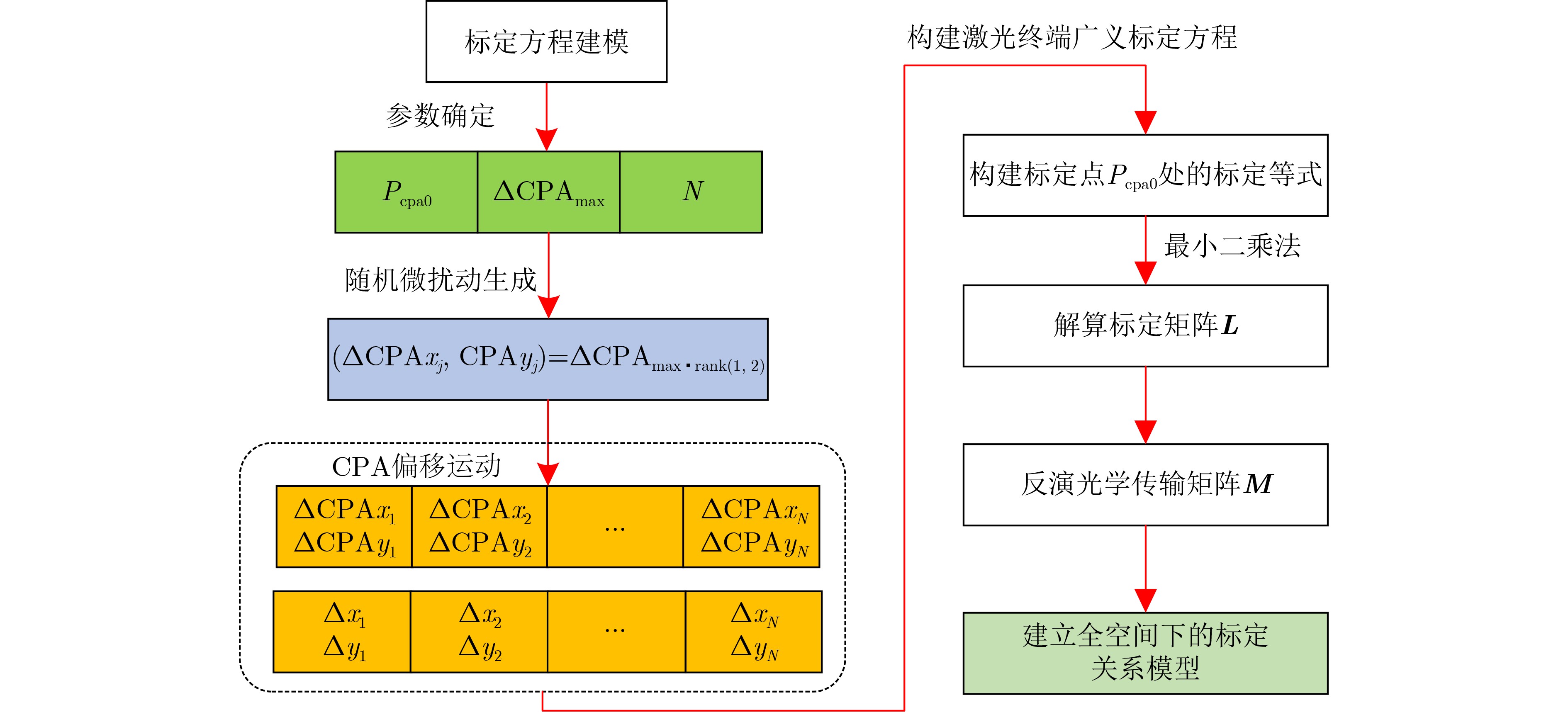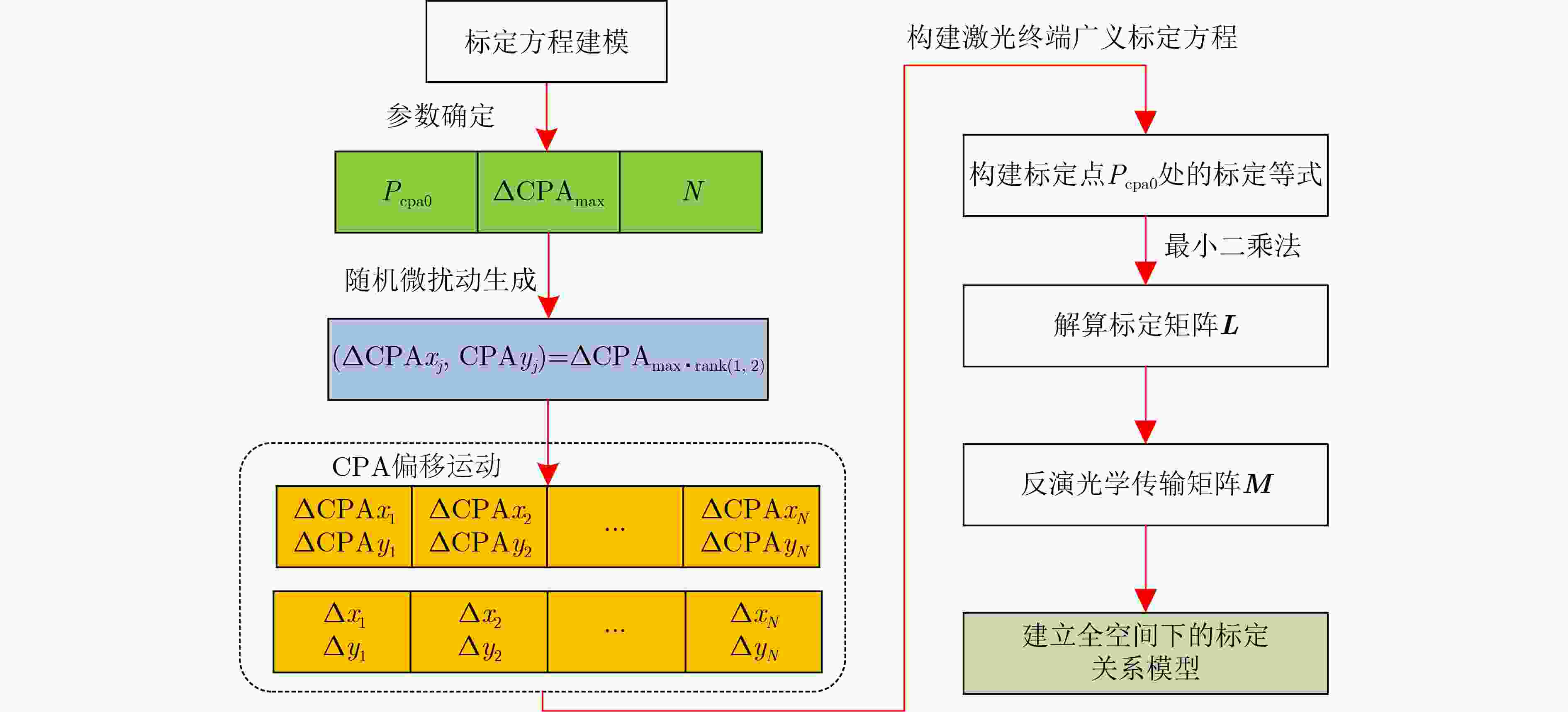 Objective The Coarse Pointing Assembly (CPA) is a core element in laser communication systems and supports wide-field scanning, active orbit-attitude compensation, and dynamic disturbance isolation. To address multi-source disturbances such as orbital perturbations and attitude maneuvers, a high-precision, high-bandwidth, and fast-response Pointing, Acquisition, and Tracking (PAT) algorithm is required. Establishing a full Field-Of-View (FOV) optical calibration model between the CPA and the detector is essential for suppressing image degradation caused by spatial pointing deviations. Conventional calibration methods often rely on ray tracing to simulate beam offsets and infer calibration relationships, yet they show several limitations. These limitations include high modeling complexity caused by non-coaxial paths, multi-reflective surfaces, and freeform optics; susceptibility to systematic errors generated by assembly tolerances, detector non-uniformity, and thermal drift; and restricted applicability across the full FOV due to spatial anisotropy. A high-precision calibration method that remains effective across the entire FOV is therefore needed to overcome these challenges and ensure stable and reliable laser communication links. Methods To achieve precise CPA-detector calibration and address the limitations of traditional approaches, this paper presents a full FOV optical calibration method with microradian-level accuracy. Based on the optical design characteristics of periscope-type laser terminals, an equivalent optical transmission model of the CPA is established and the mechanism of image rotation is examined. Leveraging the structural rigidity of the optical transceiver channel, the optical transmission matrix is simplified to a constant matrix, yielding a full-space calibration model that directly links CPA micro-perturbations to spot displacements. By correlating the CPA rotation angles between the calibration target points and the actual operating positions, the calibration task is further reduced to estimating the calibration matrix at the target points. Random micro-perturbations are applied to the CPA to induce corresponding micro-displacements of the detector spot. A calibration equation based on CPA motion and spot displacement is formulated, and the calibration matrix is obtained through least-squares regression. The full-space calibration relationship between the CPA and detector is then derived through matrix operations. Results and Discussions Using the proposed calibration method, an experimental platform ( Fig. 4 ) is constructed for calibration and verification with a periscope laser terminal. Accurate measurements of the conjugate motion relationship between the CPA and the CCD detector spot are obtained (Table. 1 ). To evaluate calibration accuracy and full-space applicability, systematic verification is conducted through single-step static pointing and continuous dynamic tracking. In the static pointing verification, the mechanical rotary table is moved to three extreme diagonal positions, and the CPA performs open-loop pointing based on the established CPA-detector calibration relationship. Experimental results show that the spot reaches the intended target position (Fig. 5 ), with a pointing accuracy below 12 mrad (RMS). In the dynamic tracking experiment, system control parameters are optimized to maintain stable tracking of the platform beam. During low-angular-velocity motion of the rotary table, the laser terminal sustains stable tracking (Fig. 6 ). The CPA trajectory shows a clear conjugate relationship with the rotary table motion (Fig. 6(a) ,Fig. 6(b) ), and the tracking accuracy in both orthogonal directions is below 5 mrad (Fig. 6(c) ,Fig. 6(d) ). The independence of the optical transmission matrix from the selection of calibration target points is also examined. By increasing the spatial accessibility of calibration points, the method reduces operational complexity while maintaining calibration precision. Improved spatial distribution of calibration points further enhances calibration efficiency and accuracy.Conclusions This paper presents a full FOV optical calibration method with microradian-level accuracy based on single-target micro-perturbation measurement. To satisfy engineering requirements for rapid linking and stable tracking, a full-space optical matrix model for CPA-detector calibration is constructed using matrix optics. Random micro-perturbations applied to the CPA at a single target point generate a generalized transfer equation, from which the calibration matrix is obtained through least-squares estimation. Experimental results show that the model mitigates image rotation, mirroring, and tracking anomalies, suppresses calibration residuals to below 12 mrad across the full FOV, and limits the dynamic tracking error to within 5 mrad per axis. The method eliminates the need for additional hardware and complex alignment procedures, providing a high-precision and low-complexity solution that supports rapid deployment in the mass production of Low-Earth-Orbit (LEO) laser terminals. -
