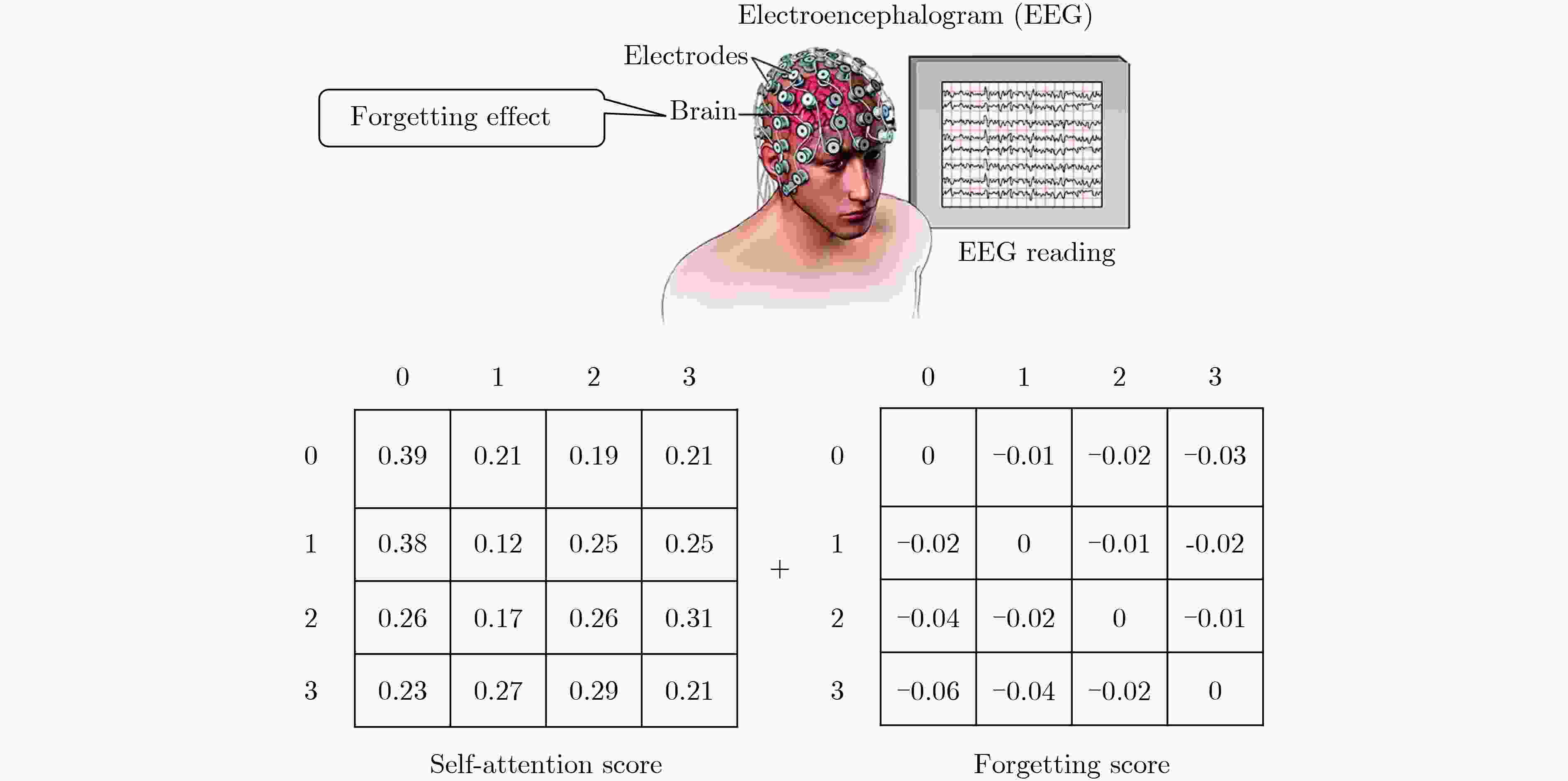 Abstract:Objective Electroencephalography (EEG), as a non-invasive method of recording neural signals, contains rich emotional and cognitive information and is widely used in brain science research and affective computing. While Transformer models have demonstrated strong global modeling capabilities in EEG-based emotion recognition tasks, their multi-head self-attention mechanisms overlook the nature of EEG as brain-generated data, which exhibits a forgetting effect. In reality, human brains tend to forget emotional or cognitive states from distant time points, yet existing Transformer-based models focus solely on the relevance between time steps, ignoring such forgetting effects. This limitation reduces their effectiveness in EEG emotion recognition. To address this issue, this study aims to design a model that simultaneously considers temporal relevance and the forgetting effect inherent in brain activity. Methods We propose a novel EEG emotion recognition model, termed Memory Self-Attention (MSA), which integrates a memory-based forgetting mechanism into the standard self-attention framework. The MSA mechanism combines global semantic modeling with a biologically-inspired memory decay component. Specifically, a memory forgetting score is computed for each attention head by learning two independent linear decay curves, reflecting the natural attenuation of memory over time. These scores are then combined with traditional attention weights, ensuring that temporal relationships are modulated by distance-aware forgetting behavior. Importantly, this design achieves improved model performance with negligible increase in model parameters and computational cost. The model first employs an Aggregated Convolutional Neural Network (ACNN) to extract spatiotemporal features across EEG channels. Then, the MSA module models global dependencies and memory-aware interactions. Finally, the refined feature representations are fed into a classification head to obtain the final predictions. Results and Discussions The proposed method is evaluated on several benchmark EEG emotion recognition datasets. On the DEAP binary classification task, the model achieves 98.87% and 98.30% classification accuracy for valence and arousal, respectively. On the SEED three-class task, it reaches 97.64% accuracy, and on the SEED-IV four-class task, it achieves 95.90% accuracy. These results ( Fig.1 ,Table 1 ) outperform most existing mainstream methods, demonstrating the effectiveness and robustness of the proposed model across diverse datasets and emotion classification levels.Conclusions This work presents an effective and biologically-informed approach for EEG-based emotion recognition by integrating a memory forgetting mechanism into the Transformer architecture. The proposed MSA model captures both temporal correlations and the forgetting characteristics of brain signals, offering a lightweight yet powerful alternative for multi-class emotion classification tasks. Experimental results validate its superior performance and generalizability. -