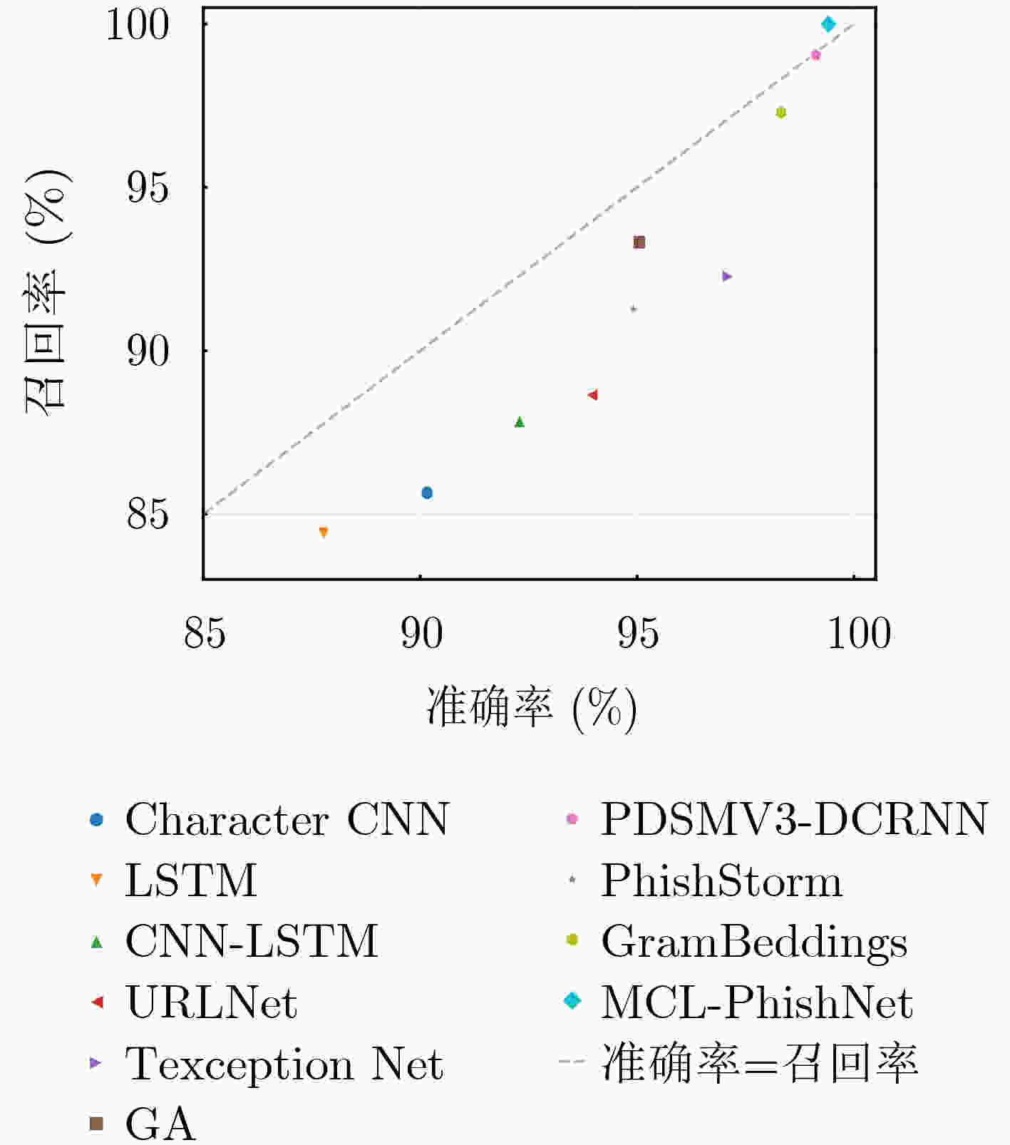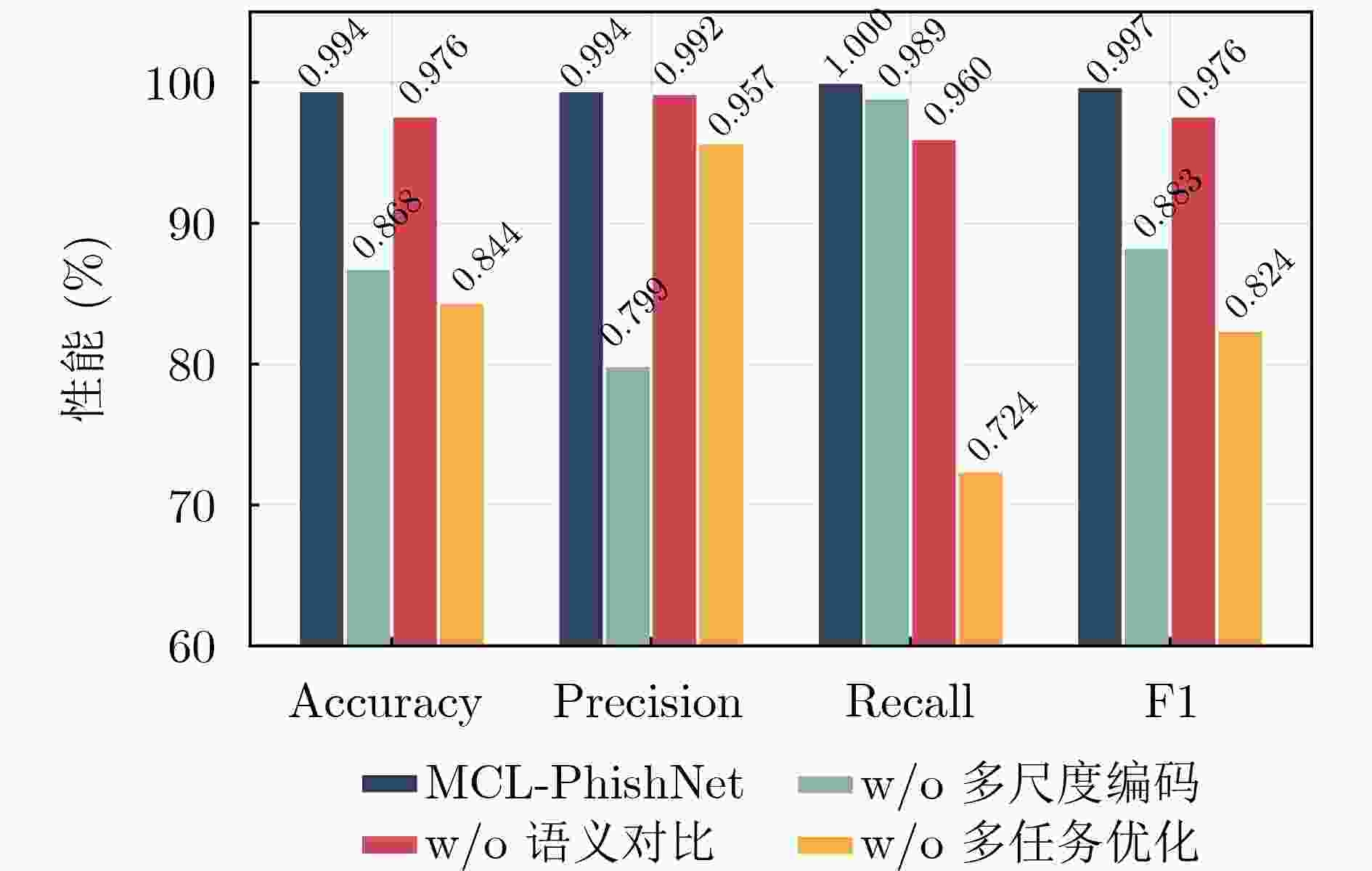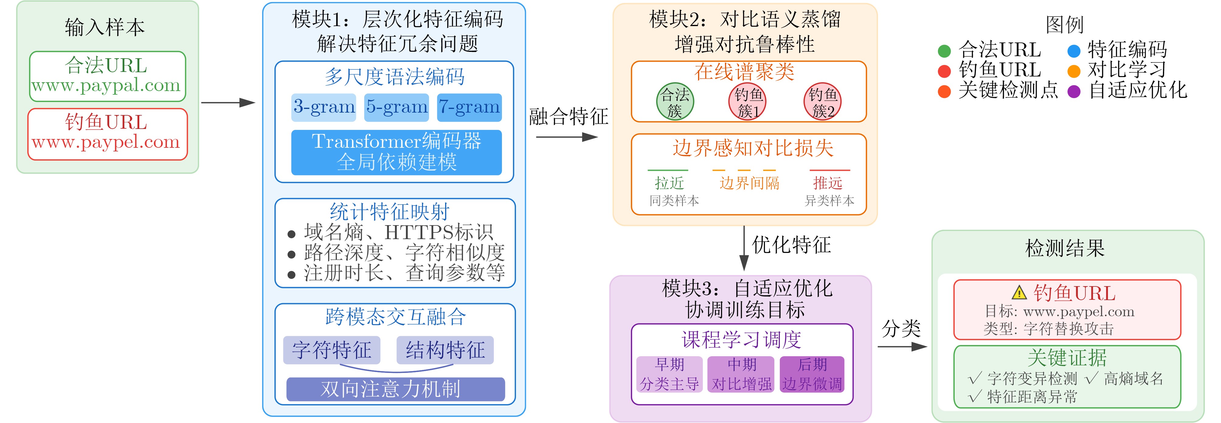 Objective The growing complexity and rapid evolution of phishing attacks present challenges to traditional detection methods, including feature redundancy, multi-modal mismatch, and limited robustness to adversarial samples. Methods MCL-PhishNet is proposed as a Multi-Modal Contrastive Learning framework that achieves precise phishing URL detection through a hierarchical syntactic encoder, bidirectional cross-modal attention mechanisms, and curriculum contrastive learning strategies. In this framework, multi-scale residual convolutions and Transformers jointly model local grammatical patterns and global dependency relationships of URLs, whereas a 17-dimensional statistical feature set improves robustness to adversarial samples. The dynamic contrastive learning mechanism optimizes the feature-space distribution through online spectral-clustering-based semantic subspace partitioning and boundary-margin constraints. Results and Discussions This study demonstrates consistent performance across different datasets (EBUU17 accuracy 99.41%, PhishStorm 99.41%, Kaggle 99.30%), validating the generalization capability of MCL-PhishNet. The three datasets differ significantly in sample distribution, attack types, and feature dimensions, yet the method in this study maintains stable high performance, indicating that the multimodal contrastive learning framework has strong cross-scenario adaptability. Compared to methods optimized for specific datasets, this approach avoids overfitting to particular dataset distributions through end-to-end learning and an adaptive feature fusion mechanism. Conclusions This paper addresses the core challenges in phishing URL detection, such as the difficulty of dynamic syntax pattern modeling, multimodal feature mismatches, and insufficient adversarial robustness, and proposes a multimodal contrastive learning framework, MCL-PhishNet. Through a collaborative mechanism of hierarchical syntax encoding, dynamic semantic distillation, and curriculum optimization, it achieves 99.41% accuracy and a 99.65% F1 score on datasets like EBUU17, PhishStorm and so on, improving existing state-of-the-art methods by 0.27%~3.76%. Experiments show that this approach effectively captures local variation patterns in URLs (such as numeric substitution attacks in ‘payp41-log1n.com’) through a residual convolution-Transformer collaborative architecture and reduces the false detection rate of path-sensitive parameters to 0.07% via a bidirectional cross-modal attention mechanism. However, the proposed framework has relatively high complexity. Although the hierarchical encoding module of MCL-PhishNet (including multi-scale CNNs, Transformers, and gated networks) improves detection accuracy, it also increases the number of model parameters. Moreover, the current model is trained primarily on English-based public datasets, resulting in significantly reduced detection accuracy for non-Latin characters (such as Cyrillic domain confusions) and regional phishing strategies (such as ‘fake’ URLs targeting local payment platforms). -