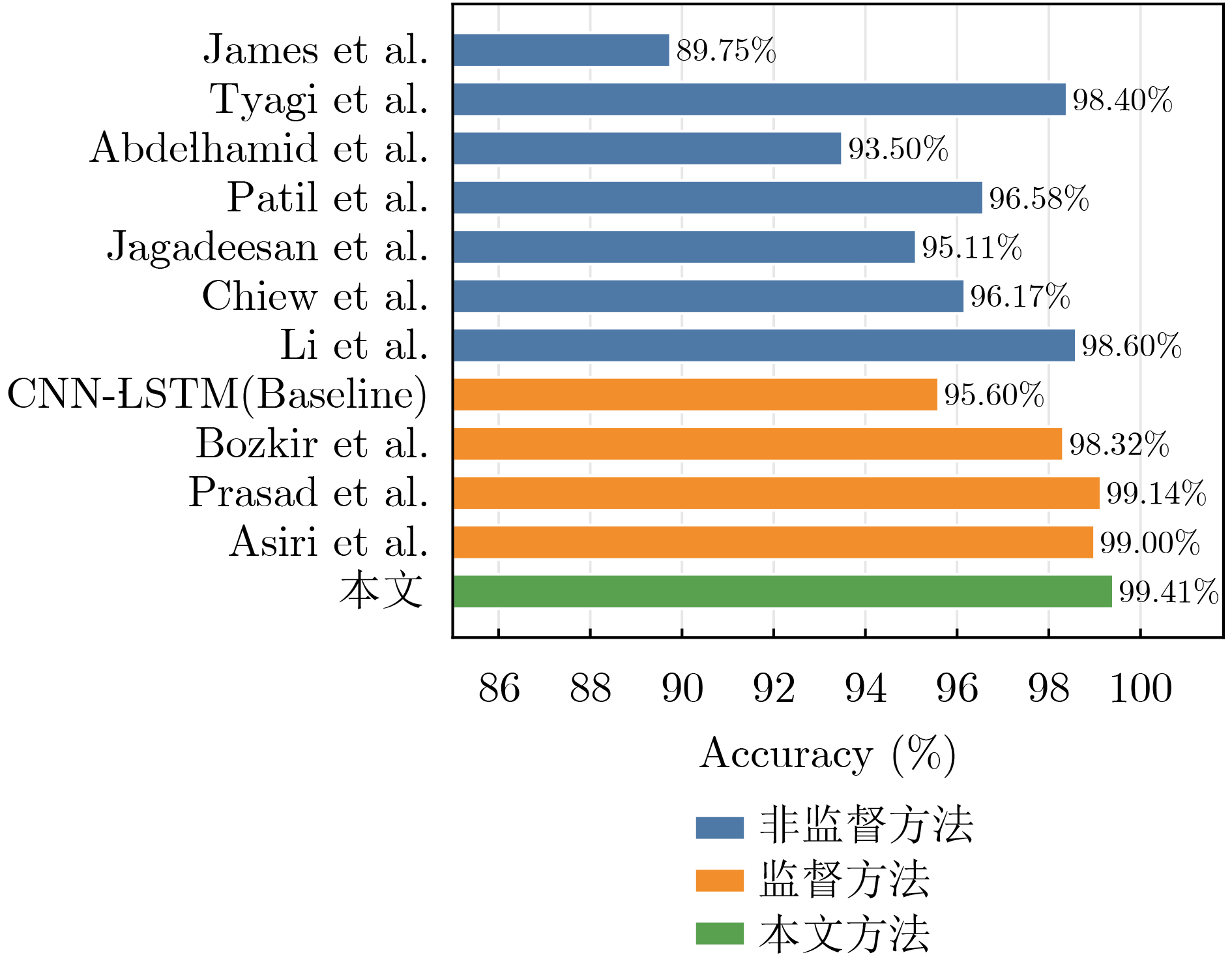 $ \mathcal{B}:{\mathrm{AlexaTop}}\;1000\mathrm{品}\mathrm{牌}\mathrm{域}\mathrm{名}\mathrm{库} $创新7:最长公共子序列比检测品牌仿冒 16 URL片段熵差异 $ \Delta H= |{H}_{{\mathrm{domain}}}-{H}_{{\mathrm{path}}}| $ 创新8:域名与路径熵值差检测随机路径混淆 17 域名注册时长 $ {T}_{{\mathrm{age}}}={T}_{{\mathrm{now}}}-{T}_{{\mathrm{reg}}}\left(\mathrm{天}\right) $ 创新9:WHOIS查询获取新注册域名(<7天)为高风险 表 1 不同方法在Kaggle URL数据集上的性能对比(%)