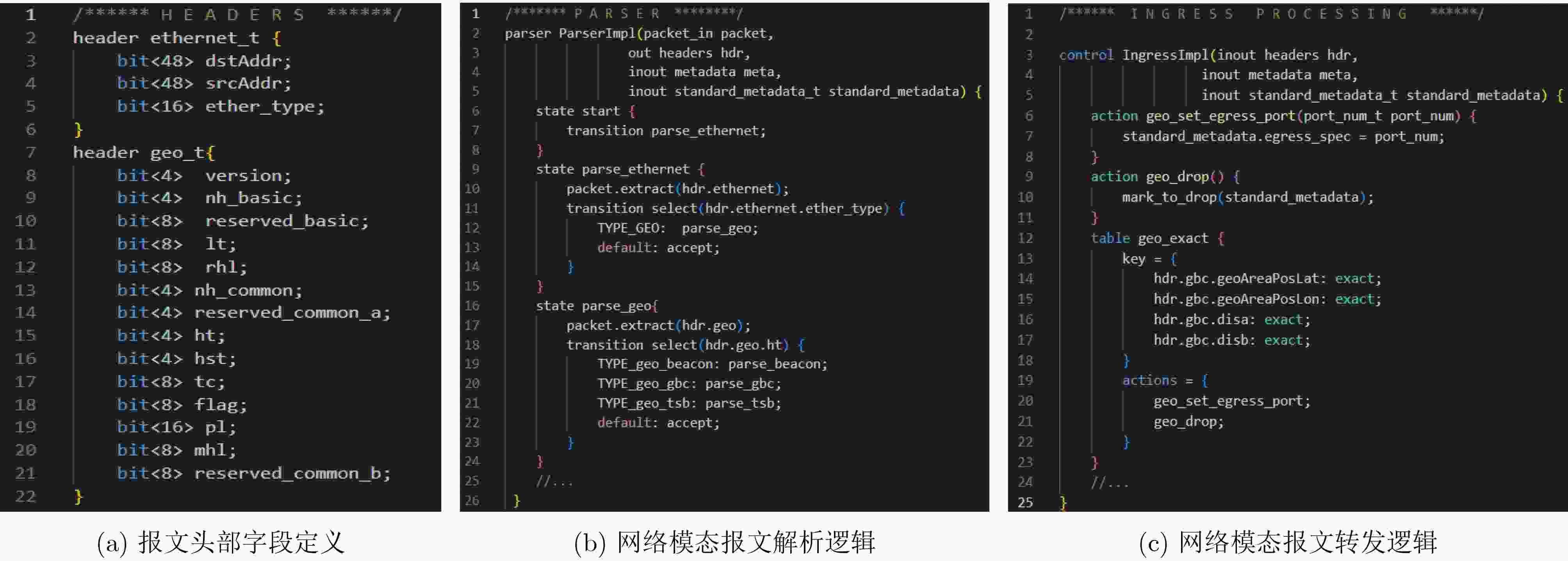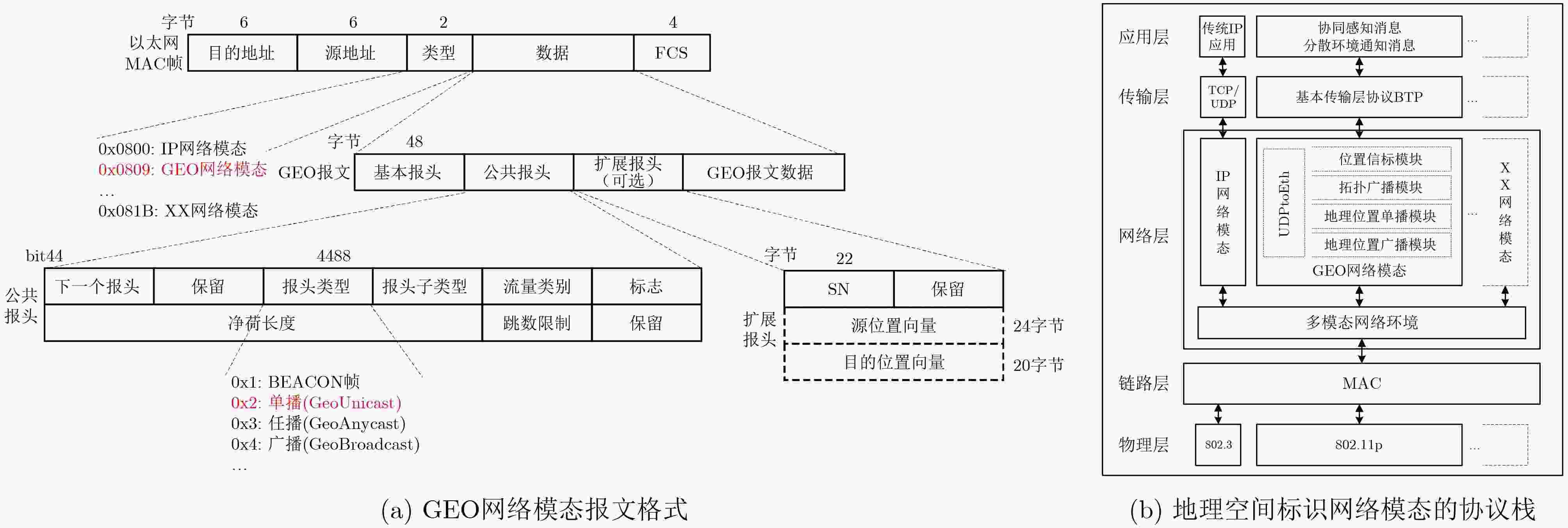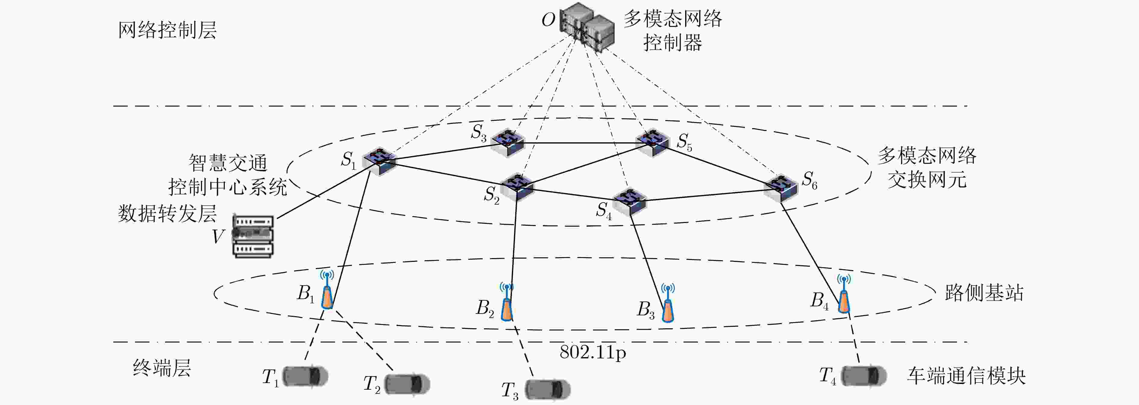 Objective Vehicle-infrastructure cooperative networks (V2X) are characterized by environmental openness, large node counts, high node mobility, frequent changes in network topology, unstable wireless channels, and diverse service requirements. These technical features present significant challenges to the efficient transmission of data. Thus, rapid network reconfiguration based on different service requirements becomes crucial, and constructing a flexible real-time network is essential for the application of V2X technologies in intelligent transportation systems (ITS). With the rise of programmable network technologies, programmable data plane techniques are driving a shift from “rigid architectures” to “flexible, adaptive” systems, enhancing the flexibility of intelligent transportation networks. In this context, a network protocol standard based on geospatial location information is proposed. Combining this standard with a polymorphic network architecture, a geospatial identifier network modal is designed. In this modal, the traditional three-layer protocol is replaced by packets containing geographic location identifiers, enabling packet forwarding directly based on geographic location information. Addressing and routing based on geographic location are more efficient and convenient than traditional IP-based addressing and routing. Furthermore, a geospatial identifier-based vehicle-infrastructure cooperative traffic system is designed for intelligent transportation scenarios. This system supports direct forwarding of packets based on geographic location information, offering flexibility in supporting the dissemination of road safety and traffic information within the V2X system, ensuring vehicle safety and improving route planning efficiency. Methods Based on the network protocol standard for geospatial location information and the flexible and scalable architecture of polymorphic networks, a geospatial identifier network modal is proposed. This modal replaces IP with a geospatial identifier network protocol at the three-layer network layer and implements addressing and routing based on geospatial information on programmable polymorphic network elements. To achieve end-to-end transmission, a geospatial identifier network modal protocol stack is designed, effectively supporting the unified transmission of various network modals. Additionally, considering the service demands and transmission characteristics of the GEO network modal, we develop a dynamic geographic routing mechanism. This mechanism operates within a multimodal network controller and leverages the relatively stable coverage areas of roadside base stations to establish a two-level mapping: "geographic region - base station/geographic coordinates - terminal". This enables precise end-to-end path matching for GEO network modal packets, achieving flexible and centrally controlled geographic forwarding. To validate the usability of the geospatial identifier network modal, a vehicle-infrastructure cooperative intelligent transportation system that supports the geospatial identifier addressing mechanism is developed, effectively facilitating the dissemination of road safety and traffic information. A detailed analysis of the business functional requirements of the intelligent transportation system is conducted, followed by the design of the business processing flow and the overall system. Additionally, key hardware and software modules, including geospatial representation data plane code, traffic control center services, road test base stations, and vehicle terminals, are designed and their implementation logic is provided. Results and Discussions System evaluation includes four main aspects: system evaluation environment, system operational effectiveness, theoretical analysis and performance evaluation. As shown in Figure 7 and8 , a prototype intelligent transportation system is deployed. The system is tested and validated to ensure it can transmit messages according to the geospatial identifier modal. Taking a typical V2V communication scenario as an example (e.g., onboard terminal T3 sending a road condition alert M to T2), we use sequence analysis to compare the forwarding efficiency of the GEO network modal against traditional IP protocols. Theoretical analysis demonstrates that the GEO network modal offers significant technical advantages in forwarding efficiency, as illustrated inFigure 9 . Further tests are conducted by varying conditions such as the number of terminals (Figure 10 ), background traffic (Figure 11 ), and transmission bandwidth (Figure 12 ) to assess the changes in transmission performance of geospatially represented modal packets. The network modal transmission performance of the intelligent transportation system is analyzed. System performance evaluation experiments demonstrate that the system exhibits good stability and high efficiency, meeting the demands of typical V2X traffic scenarios, such as massive connectivity and elastic traffic flows.Conclusions Combining the flexible and scalable architecture of polymorphic networks with the network protocol standard for geospatial location information, the geospatial identifier network modal is proposed and successfully implemented, enabling direct packet forwarding based on geospatial location. Additionally, for intelligent transportation scenarios, a prototype vehicle-infrastructure cooperative intelligent transportation system based on geospatial identifier addressing is designed. This system supports a variety of applications within the V2X context, such as road safety alerts and traffic information broadcasting. The intelligent transportation system ensures vehicle safety and enhances route planning efficiency. Experimental results show that the system provides excellent stability and efficiency, effectively supporting typical traffic scenarios involving massive connectivity, network background traffic fluctuations, and elastic service traffic. 
