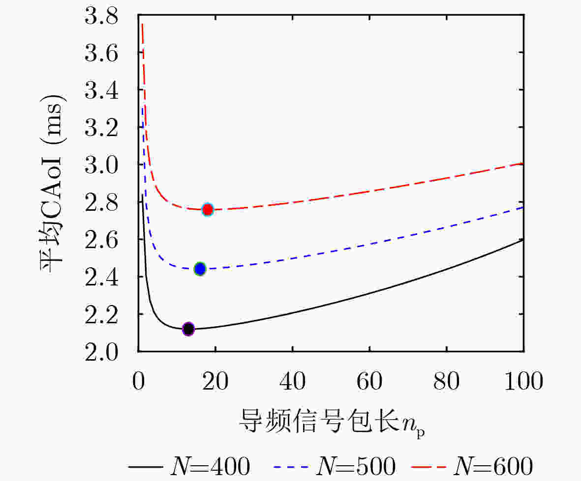 $ {f}_{{\mathrm{CAOI}}}\left({x}_{2}\right) $;8:直到$ n_{\mathrm{u}}-n\mathrm{_v} \lt \mathrm{tol} $(即区间内整数点数量足够少); 9:对最后约束区间$ \left[n_{\rm{v}},n_{\mathrm{u}}\right] $内的所有整数进行枚举并比较,找到使得信息年龄更小的包长值作为最优解$ n\mathrm{_p^*} $; 10:输出:$ n_{\mathrm{p}}=n_{\mathrm{p}}^* $(整数),$ n\mathrm{_d}=n_{\mathrm{d}}^*=N-n_{\mathrm{p}}^* $(整数),$ \min \_ {\mathrm{CAoI}} $。 -