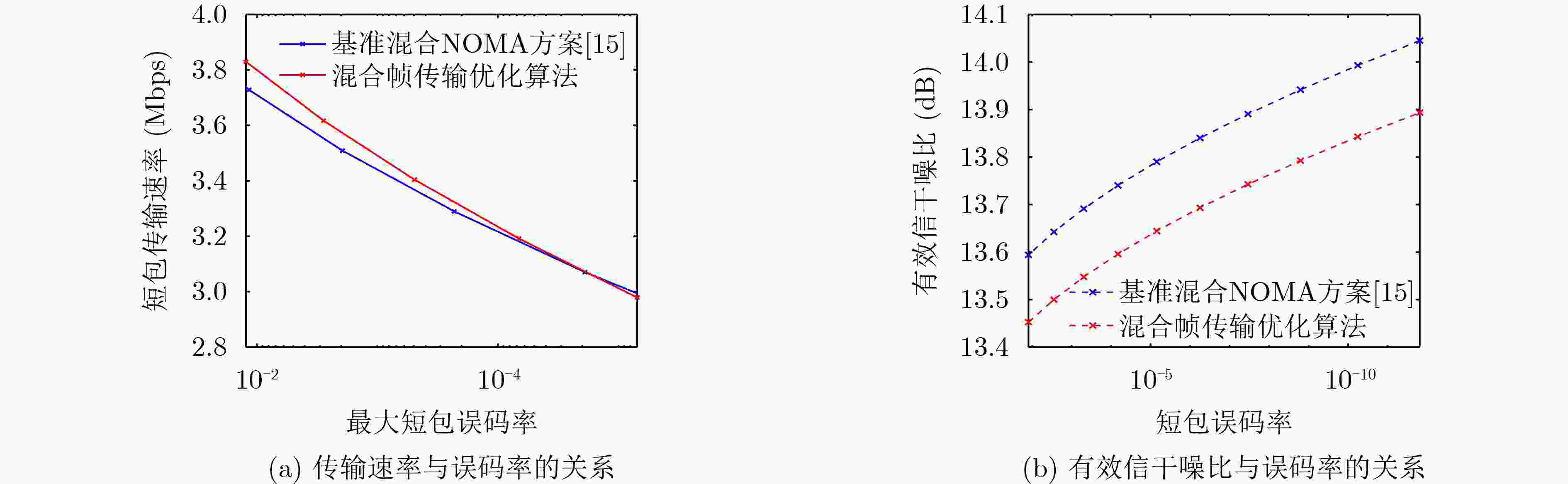 阈值$\varsigma $;输出:调度矩阵$\Pi $; 1:初始化值函数${V^0}({s_k}) = 1$,${V^1}({s_k}) = 0$,迭代轮次$i = 1$; 2://值迭代主循环 3:repeat 4: 初始化:$i = i + 1$,${V^i}({s_k}) = {V^{i + 1}}({s_k})$,$\delta = 0$ 5: for每个时隙状态${s_k}$ do 6: 计算动作价值函数:$ Q({s_k},{a_k}) = {l_k} + \upsilon \cdot \sum\limits_{{s_k}} {P({s_k}|{s_{k - 1}},{a_k})V({s_k})} \} $ 7: 更新值函数:$V({s_k}) = \min \{ Q({s_k},0),Q({s_k},1)\} $ 8: $\delta = \max \{ \delta ,\left| {{V^i}({s_k}) - {V^{i - 1}}({s_k})} \right|$ 9: end for 10:Until $\delta $<$\varsigma $ 11://策略提取阶段 12:for 每个时隙状态${s_k}$ do 13: 得出最优策略$ \pi *({s_k}) = \mathop {\arg \min }\limits_{{a_k} \in \{ 0,1\} } \{ {l_k} + \upsilon \cdot \sum\limits_{{s_k}} {P\left\langle {{{s_k}}} \mathrel{\left | {\vphantom {{{s_k}} {{s_{k - 1}},0}}} \right. } {{{s_{k - 1}},0}} \right\rangle V({s_k})} \} $ 14:end for 15:return $\pi *$ 表 2 基于NOMA的混合帧结构传输优化算法
