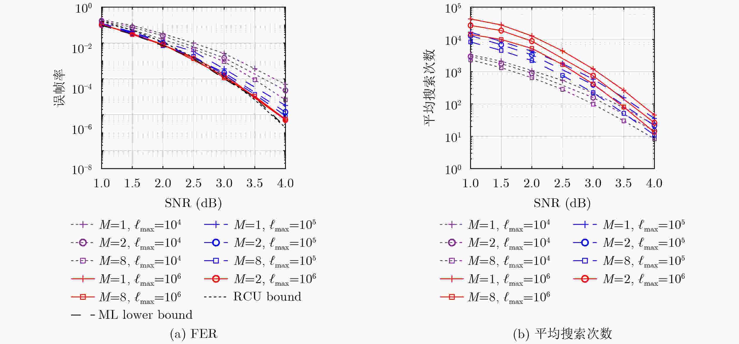 列,并据此计算初始LLR向量$ \boldsymbol{r} $。(2)第0行候选生成: (a) 在$ ({\boldsymbol{G}}^{{'}},\boldsymbol{r}) $上调用$ L\left({\boldsymbol{G}}^{{'}},\boldsymbol{r}\right) $,得到候选码字集合$ \boldsymbol{C} $。 (b) 在$ \boldsymbol{C} $中按照汉明重量从小到大排序,选取前$ M $个非零码字$ \{{\boldsymbol{c}}^{\left(0{,}0\right)},{\boldsymbol{c}}^{\left(1{,}0\right)},\cdots ,{\boldsymbol{c}}^{\left(M-1{,}0\right)}\} $。 (3)多矩阵MWSGM构造: (a) 对于$ m=0{,}1,\cdots ,M-1 $: ① 初始化$ \boldsymbol{G}_{{\mathrm{s}}}^{(m)} $为$ k\times n $零矩阵,并令$ \boldsymbol{G}_{{\mathrm{s}}}^{\left(m\right)}\left(0,\colon \right)\leftarrow {\boldsymbol{c}}^{(m,0)} $。//对于一个矩阵$ \boldsymbol{A} $,我们使用$ \boldsymbol{A}\left(\ell,\colon \right) $来表示$ \boldsymbol{A} $的第$ \ell $行。 ② 设置擦除集合$ {S}^{(m)}\leftarrow \left\{j\in \mathcal{P}|\boldsymbol{c}_{\rm{j}}^{\left(m,0\right)}=1\right\} $。 ③ 设置$ {{{\boldsymbol{G}}^{{'}}}}^{(m)}\leftarrow {\boldsymbol{G}}^{{'}} $, 令$ {\boldsymbol{r}}^{(m)}\leftarrow \boldsymbol{r} $。 ④ 从$ {{{\boldsymbol{G}}^{{'}}}}^{(m)} $中删除一行与$ {\boldsymbol{c}}^{(m,0)} $线性相关的行。 ⑤ 对所有$ j\in {S}^{\left(m\right)} $,令$ r_{j}^{\left(m\right)}\leftarrow 0 $。 ⑥ 对于$ i=1{,}2,\cdots ,k-1 $: (i) 在$ {{{(\boldsymbol{G}}^{{'}}}}^{(m)},{\boldsymbol{r}}^{(m)}) $上调用$ L\left({\boldsymbol{G}}^{{'}},\boldsymbol{r}\right) $,得到候选集合$ \boldsymbol{C}_{i}^{\left(m\right)} $。 (ii) 在$ \boldsymbol{C}_{i}^{\left(m\right)} $中选择在$ \mathcal{P}\backslash {S}^{(m)} $上汉明重量最小且在$ \mathcal{P}\backslash {S}^{(m)} $上非零的码字$ {\widehat{\boldsymbol{c}}}^{(m,i)} $。 (iii) 令$ \boldsymbol{G}_{s}^{\left(m\right)}\left(i,\colon \right)\leftarrow {\widehat{\boldsymbol{c}}}^{(m,i)} $ (iv) 更新$ {S}^{(m)}\leftarrow {S}^{(m)}\cup \left\{j\in \mathcal{P}|\widehat{\boldsymbol{c}}_{j}^{\left(m,i\right)}=1\right\} $ (v) 从$ {{{\boldsymbol{G}}^{{'}}}}^{(m)} $中删除一行与$ {\widehat{\boldsymbol{c}}}^{(m,i)} $线性相关的行。 (vi) 对所有$ j\in {S}^{\left(m\right)} $,令$ r_{j}^{\left(m\right)}\leftarrow 0 $。 (4)对每个$ \boldsymbol{G}_{{\mathrm{s}}}^{(m)} $的列进行必要的置换,使其成为阶梯生成矩阵。 (5)返回$ {\boldsymbol{G}}_{\rm{s}}=\{\boldsymbol{G}_{{\mathrm{s}}}^{\left(0\right)},\boldsymbol{G}_{{\mathrm{s}}}^{\left(1\right)},\cdots ,\boldsymbol{G}_{{\mathrm{s}}}^{\left(M-1\right)}\} $ -