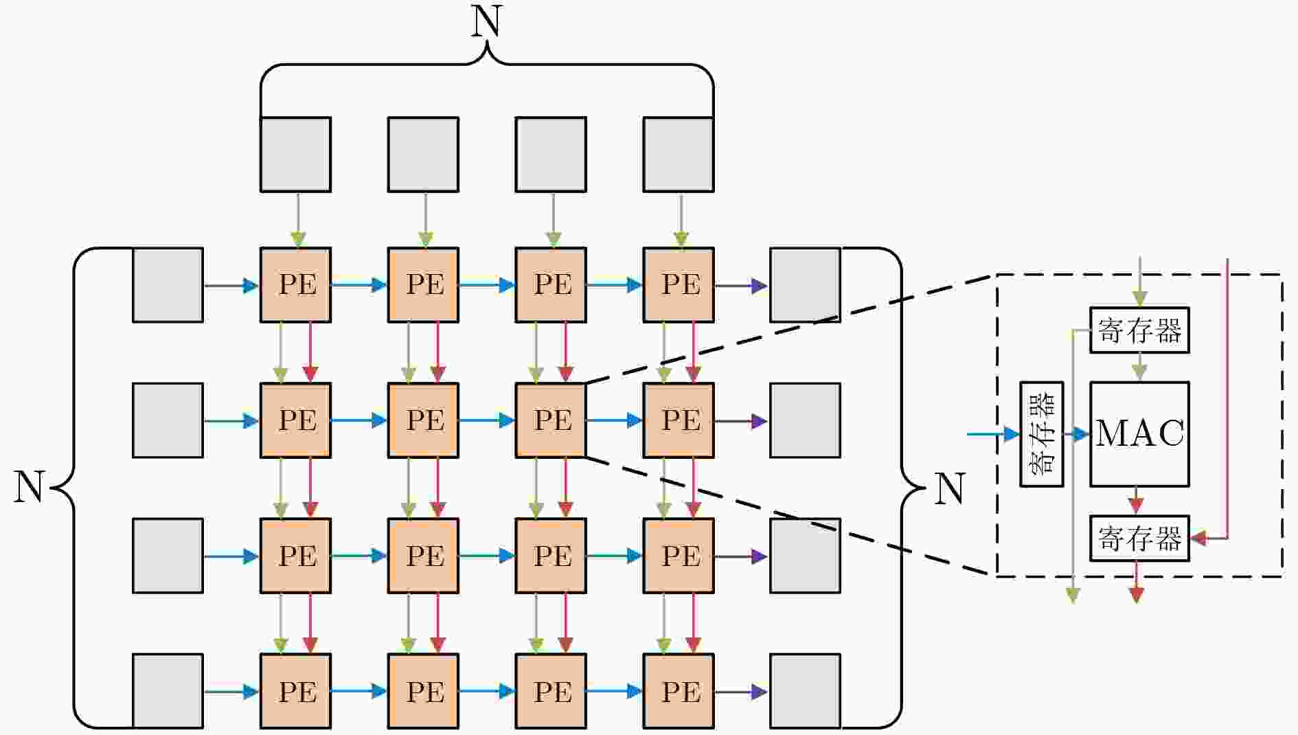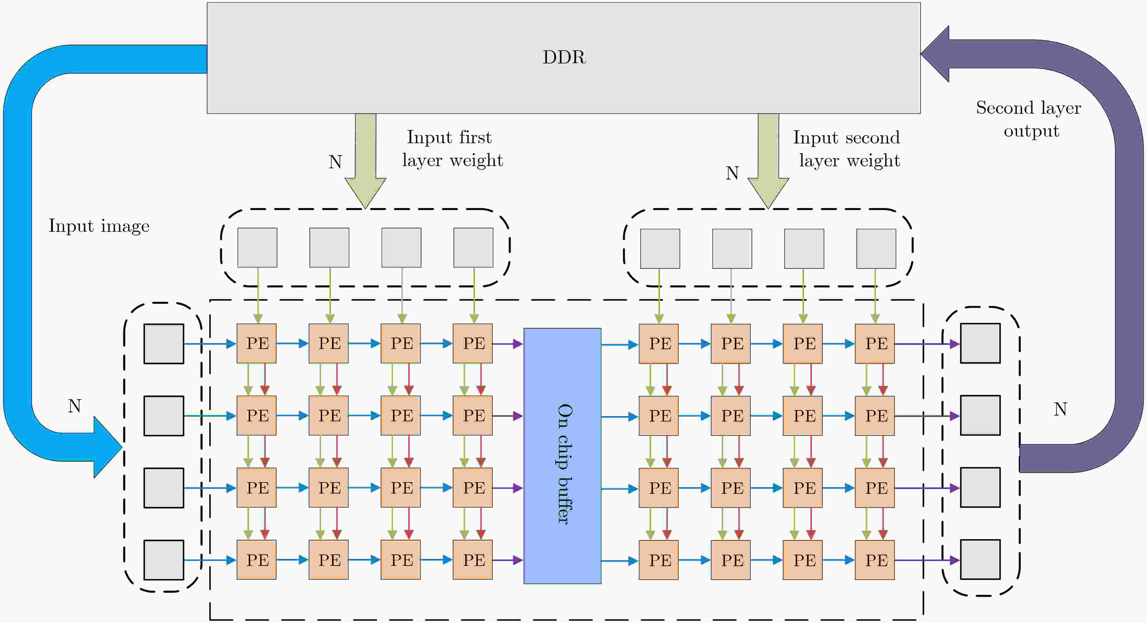 7100 平台上,VGG16、ResNet50以及Yolov8n在所提出加速器上的性能分别达到390.25GOPS、360.27GOPS和348.08GOPS,为部署高性能、低功耗的CNN推理至资源受限的边缘设备提供了有效的FPGA实现途径。Abstract:Objective With the rapid deployment of deep learning in edge computing, the demand for efficient Convolutional Neural Network (CNN) accelerators has become increasingly urgent. Although traditional CPUs and GPUs provide strong computational power, they suffer from high power consumption, large latency, and limited scalability in real-time embedded scenarios. FPGA-based accelerators, owing to their reconfigurability and parallelism, present a promising alternative. However, existing implementations often face challenges such as low resource utilization, memory access bottlenecks, and difficulties in balancing throughput with energy efficiency. To address these issues, this paper proposes a systolic array–based CNN accelerator with layer-fusion optimization, combined with an enhanced memory hierarchy and computation scheduling strategy. By designing hardware-oriented convolution mapping methods and employing lightweight quantization schemes, the proposed accelerator achieves improved computational efficiency and reduced resource consumption while meeting real-time inference requirements, making it suitable for complex application scenarios such as intelligent surveillance and autonomous driving. Methods This paper addresses the critical challenges commonly observed in FPGA-based Convolutional Neural Network (CNN) accelerators, including data transfer bottlenecks, insufficient resource utilization, and low processing unit efficiency. We propose a hybrid CNN accelerator architecture based on systolic array–assisted layer fusion, in which computation-intensive adjacent layers are deeply bound and executed consecutively within the same systolic array. This design reduces frequent off-chip memory access of intermediate results, decreases data transfer overhead and power consumption, and improves both computation speed and overall energy efficiency. A dynamically reconfigurable systolic array method is further developed to provide hardware-level adaptability for multi-dimensional matrix multiplications, thereby avoiding the resource waste of deploying dedicated hardware for different computation scales, reducing overall FPGA logic resource consumption, and enhancing adaptability and flexibility of hardware resources. In addition, a streaming systolic array computation scheme is introduced through carefully orchestrated computation flow and control logic, ensuring that processing elements within the systolic array remain in a high-efficiency working state. Data continuously flows through the computation engine in a highly pipelined and parallelized manner, improving the utilization of internal processing units, reducing idle cycles, and ultimately enhancing overall throughput. Results and Discussions To explore the optimal quantization precision of neural network models, experiments were conducted on the MNIST dataset using two representative architectures, VGG16 and ResNet50, under fixed-point quantization with 12-bit, 10-bit, 8-bit, and 6-bit precision. The results, as shown in Table 1 , indicate that when the quantization bit width falls below 8 bits, model inference accuracy drops significantly, suggesting that excessively low precision severely compromises the representational capacity of the model. On the proposed accelerator architecture, VGG16, ResNet50, and YOLOv8n achieved peak computational performances of 390.25 GOPS, 360.27 GOPS, and 348.08 GOPS, respectively. To comprehensively evaluate the performance advantages of the proposed accelerator, comparisons were made with FPGA accelerator designs reported in existing literature, as summarized inTable 4 .Table 5 further presents a comparison of the proposed accelerator with conventional CPU and GPU platforms in terms of performance and energy efficiency. During the acceleration of VGG16, ResNet50, and YOLOv8n, the proposed accelerator achieved computational throughput that was 1.76×, 3.99×, and 2.61× higher than that of the corresponding CPU platforms, demonstrating significant performance improvements unattainable by general-purpose processors. Moreover, in terms of energy efficiency, the proposed accelerator achieved improvements of 3.1× (VGG16), 2.64× (ResNet50), and 2.96× (YOLOv8n) compared with GPU platforms, highlighting its superior energy utilization efficiency.Conclusions This paper proposes a systolic array–assisted layer-fusion CNN accelerator architecture. First, a theoretical analysis of the accelerator’s computational density is conducted, demonstrating the performance advantages of the proposed design. Second, to address the design challenge arising from the variability in local convolution window sizes of the second layer, a novel dynamically reconfigurable systolic array method is introduced. Furthermore, to enhance the overall computational efficiency, a streaming systolic array scheme is developed, in which data continuously flows through the computation engine in a highly pipelined and parallelized manner. This design reduces idle cycles within the systolic array and improves the overall throughput of the accelerator. Experimental results show that the proposed accelerator achieves high throughput with minimal loss in inference accuracy. Specifically, peak performance levels of 390.25 GOPS, 360.27 GOPS, and 348.08 GOPS were attained for VGG16, ResNet50, and YOLOv8n, respectively. Compared with traditional CPU and GPU platforms, the proposed design exhibits superior energy efficiency, demonstrating that the accelerator architecture is particularly well-suited for resource-constrained and energy-sensitive application scenarios such as edge computing. -