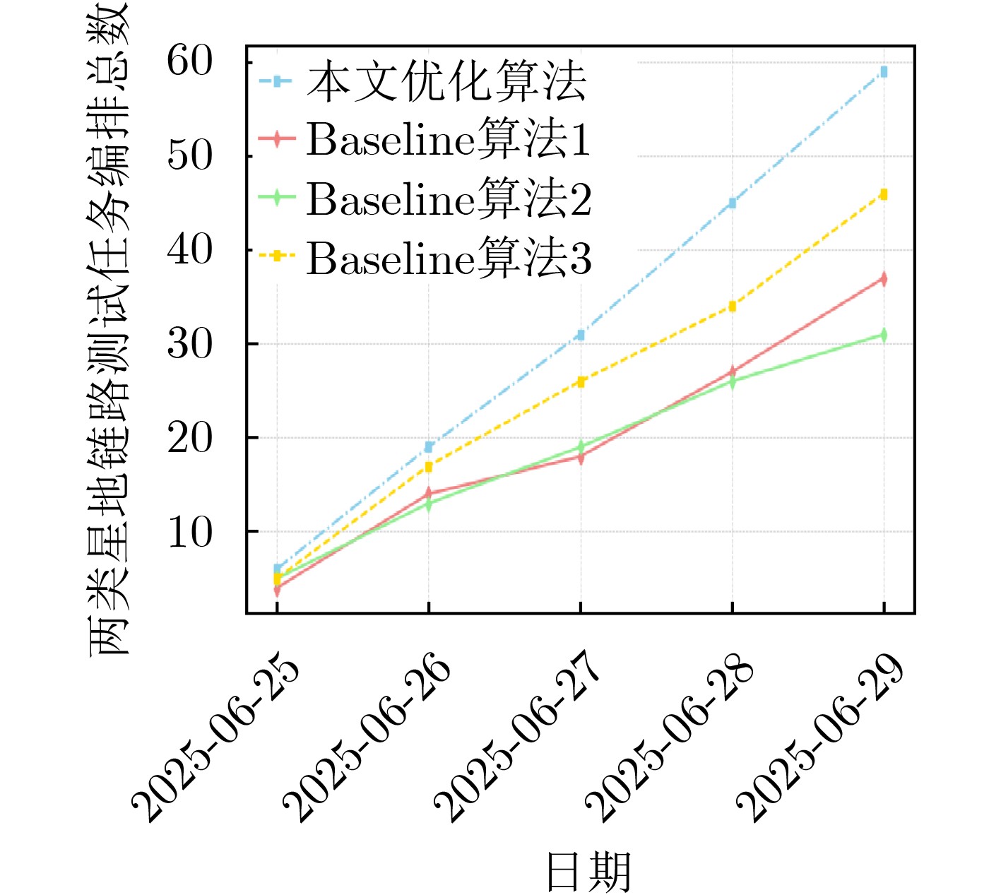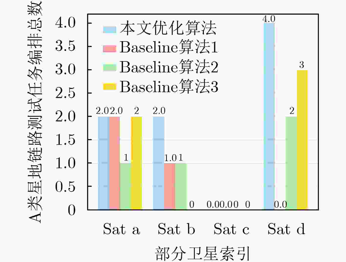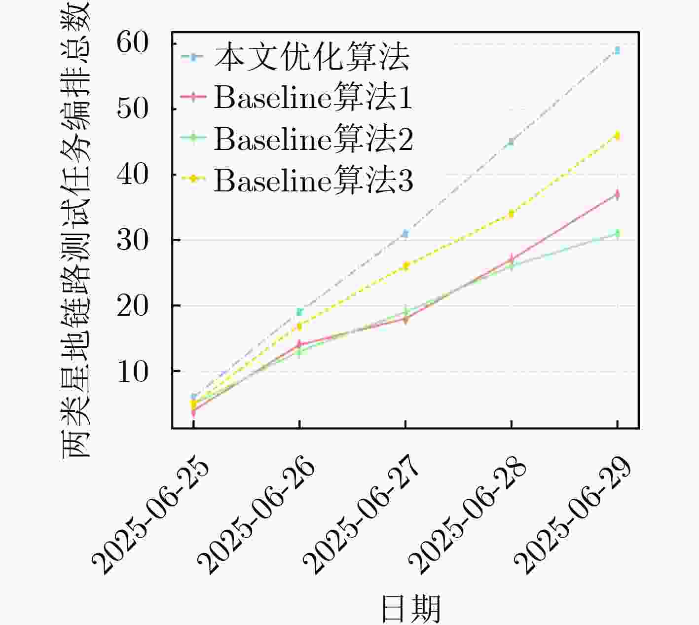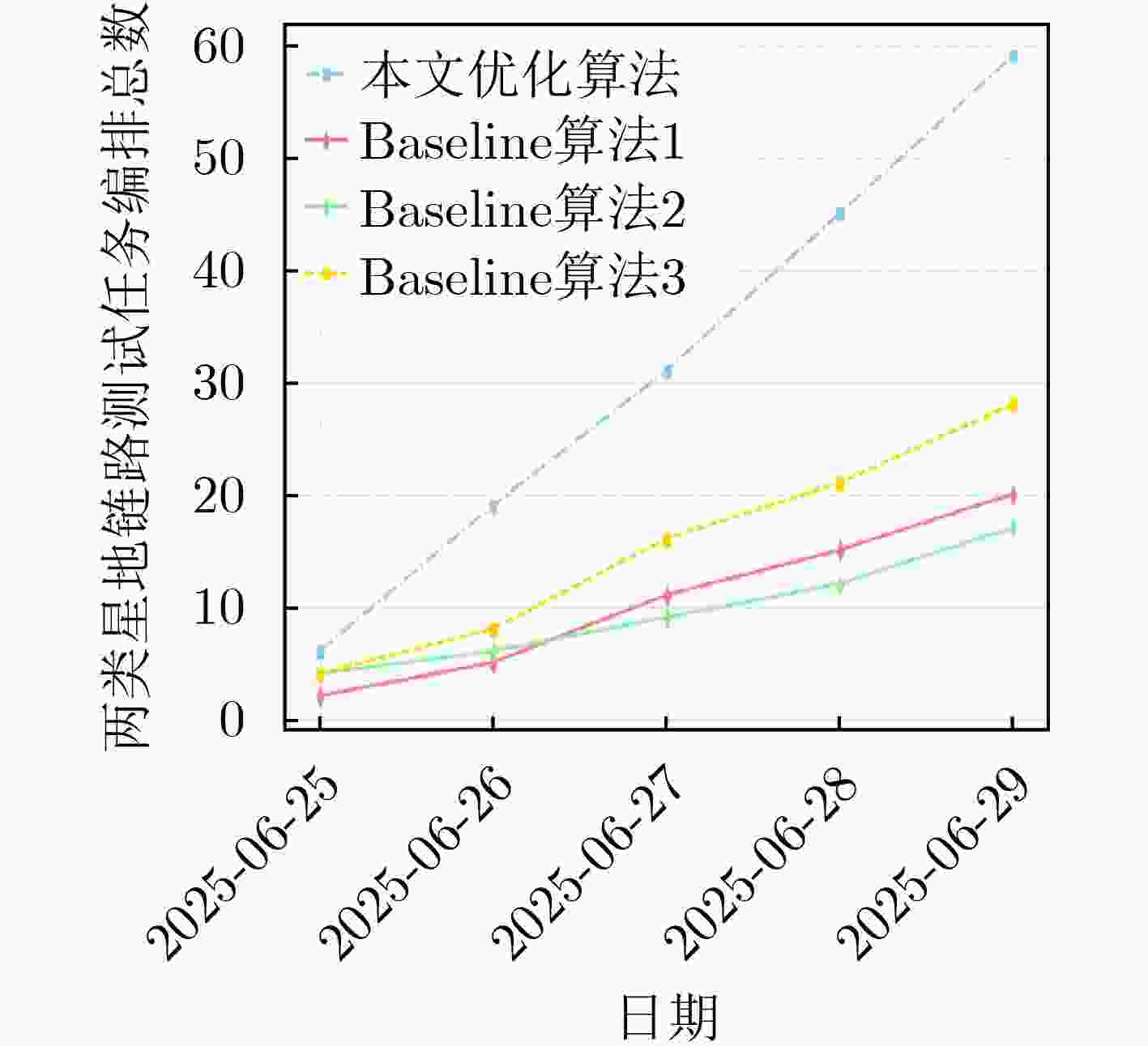 卫星 信关站 天线 跟踪模式 跟踪开始时间(北斗时) 跟踪结束时间(北斗时) 最大仰角(°) d A 837 Φ1 2025-06-29 08:49:45 2025-06-29 08:51:35 5.536425 c A 837 Φ1 2025-06-29 09:10:08 2025-06-29 09:16:02 12.90948 d B 826 Φ2 2025-06-29 10:15:11 2025-06-29 10:19:38 78.57337 a B 825 Φ2 2025-06-29 10:16:44 2025-06-29 10:23:52 74.55824 d C 824 Φ2 2025-06-29 10:20:41 2025-06-29 10:26:43 25.79927 a D 836 Φ1 2025-06-29 10:19:51 2025-06-29 10:27:12 19.11916 b C 822 Φ2 2025-06-29 10:23:44 2025-06-29 10:29:54 27.59913 d E1 834 Φ1 2025-06-29 10:22:58 2025-06-29 10:31:27 39.66145 a E3 842 Φ2 2025-06-29 10:24:31 2025-06-29 10:33:01 40.83499 d E2 841 Φ2 2025-06-29 10:26:53 2025-06-29 10:31:27 39.66145 c D 836 Φ1 2025-06-29 10:39:48 2025-06-29 10:44:45 46.63377 c A 837 Φ1 2025-06-29 10:44:55 2025-06-29 10:53:10 81.14615 a F 829 Φ1 2025-06-29 11:11:36 2025-06-29 11:19:21 13.99255 c F 829 Φ1 2025-06-29 11:30:58 2025-06-29 11:39:27 22.97701 d C 824 Φ2 2025-06-29 11:57:39 2025-06-29 12:04:06 31.18105 b D 836 Φ1 2025-06-29 11:58:03 2025-06-29 12:06:19 30.98595 b C 822 Φ2 2025-06-29 12:00:51 2025-06-29 12:07:12 29.4712 a E3 842 Φ2 2025-06-29 12:01:48 2025-06-29 12:10:19 38.24031 a E1 834 Φ1 2025-06-29 12:01:48 2025-06-29 12:10:19 38.24031 d E2 841 Φ2 2025-06-29 12:04:16 2025-06-29 12:08:46 38.9376 b A 837 Φ1 2025-06-29 12:06:29 2025-06-29 12:11:48 31.67761 表 2 两类星地链路测试任务编排结果表