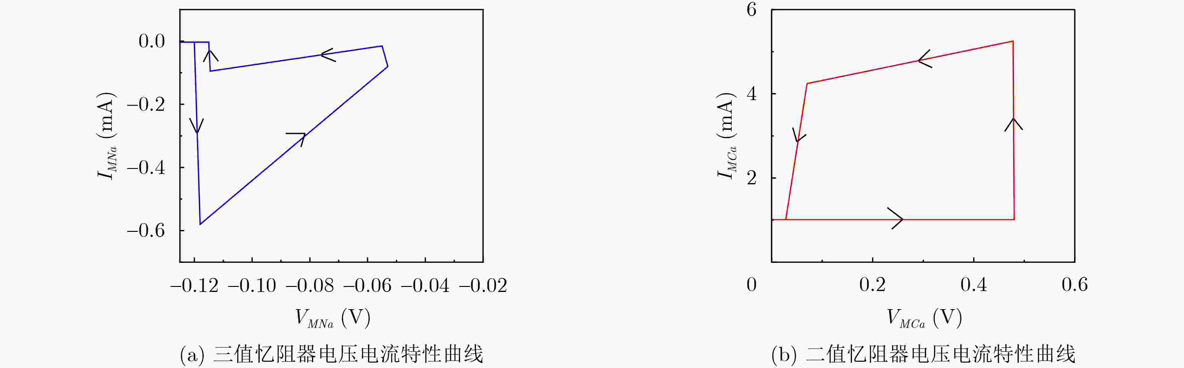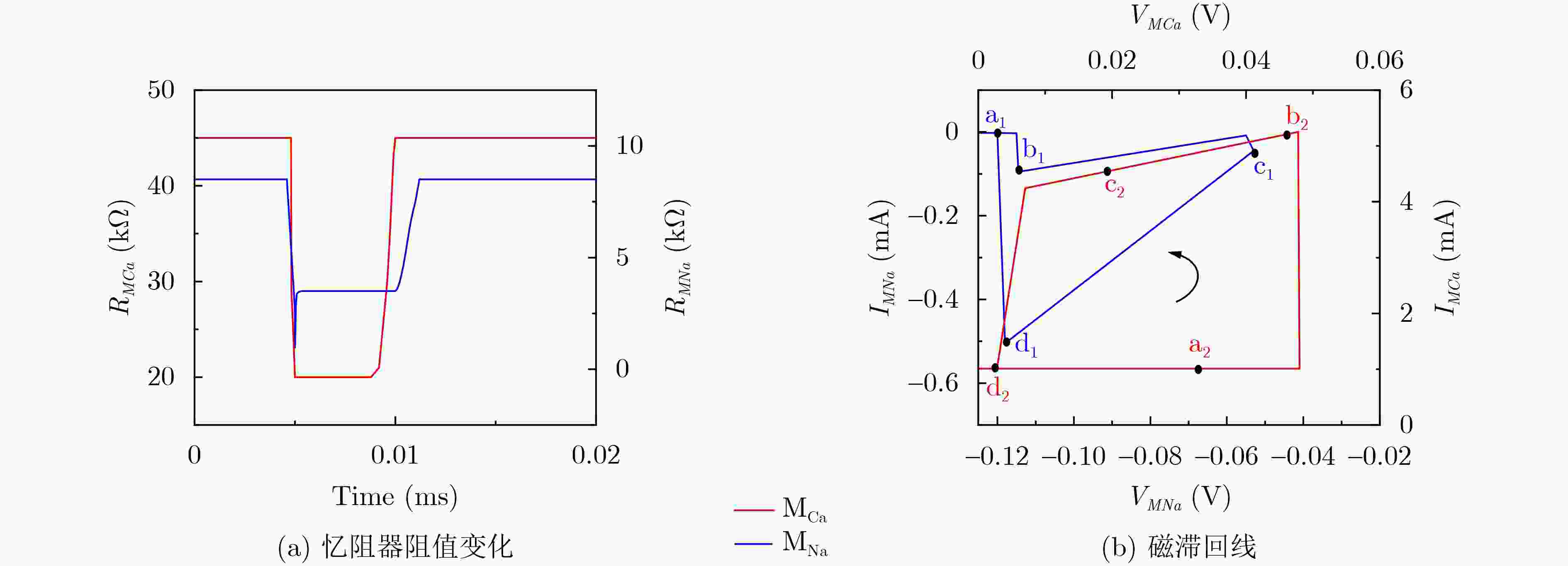 离子通道 $ {R}_{off} $ $ {R}_{on} $ $ {V}_{th} $ $ {V}_{h} $ $ {b}_{1} $ $ {b}_{2} $ $ {q}_{1} $ $ {q}_{2} $ Na+ 1MΩ - –110 mV –119.5 mV 15 2 - - Ca2+ 1 MΩ 30 kΩ 50 mV 7 mV 18 –9.8 –0.51 –0.51 -