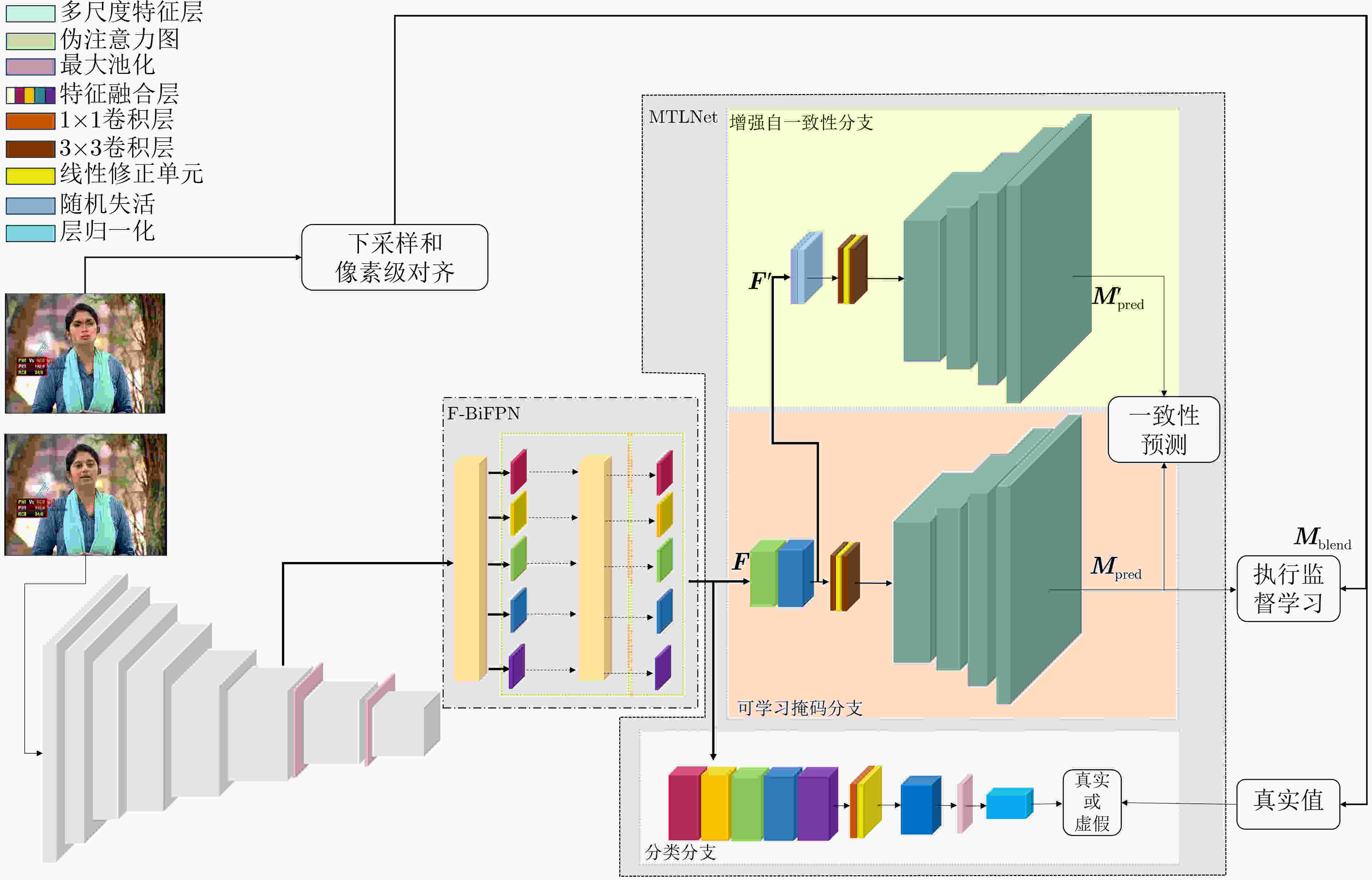 摘要: 目前高质量深度伪造视频检测方法大多基于隐式注意力机制的监督二分类模型。虽然该类模型能够通过自学习,判别伪造痕迹,鉴别异常区域,但在面对未经学习的伪造技术时,对伪造区域的敏感性降低,泛化性不足。基于此,该文提出一种伪造注意图驱动的多任务深伪视频检测模型(F-BiFPN-MTLNet)。首先,设计了一种融合伪造注意图的新型加权双向特征金字塔网络(F-BiFPN),通过伪造注意图监督低层和高层特征图的融合过程,在减少信息冗余的同时,增强模型对高质量伪造区域的敏感性。然后,定义了一种基于显式注意力机制的多任务学习网络(MTLNet)。一方面,该网络在原有基于监督二分类器的单任务模型的基础上,结合基于可学习掩码的注意策略与增强自一致性的注意策略,实现多任务加权判别,提高模型检测的可靠性;另一方面,引入显式注意力机制,通过生成的伪造位置标签对特征图进行监督,显式地指导模型聚焦于容易产生伪影的敏感区域,提高模型的泛化能力。实验结果表明,该文构建的F-BiFPN-MTLNet模型在多个基准测试中均表现出了较好性能,在曲线下面积(AUC)和平均精度(AP)等指标上取得了显著的提升。Abstract: