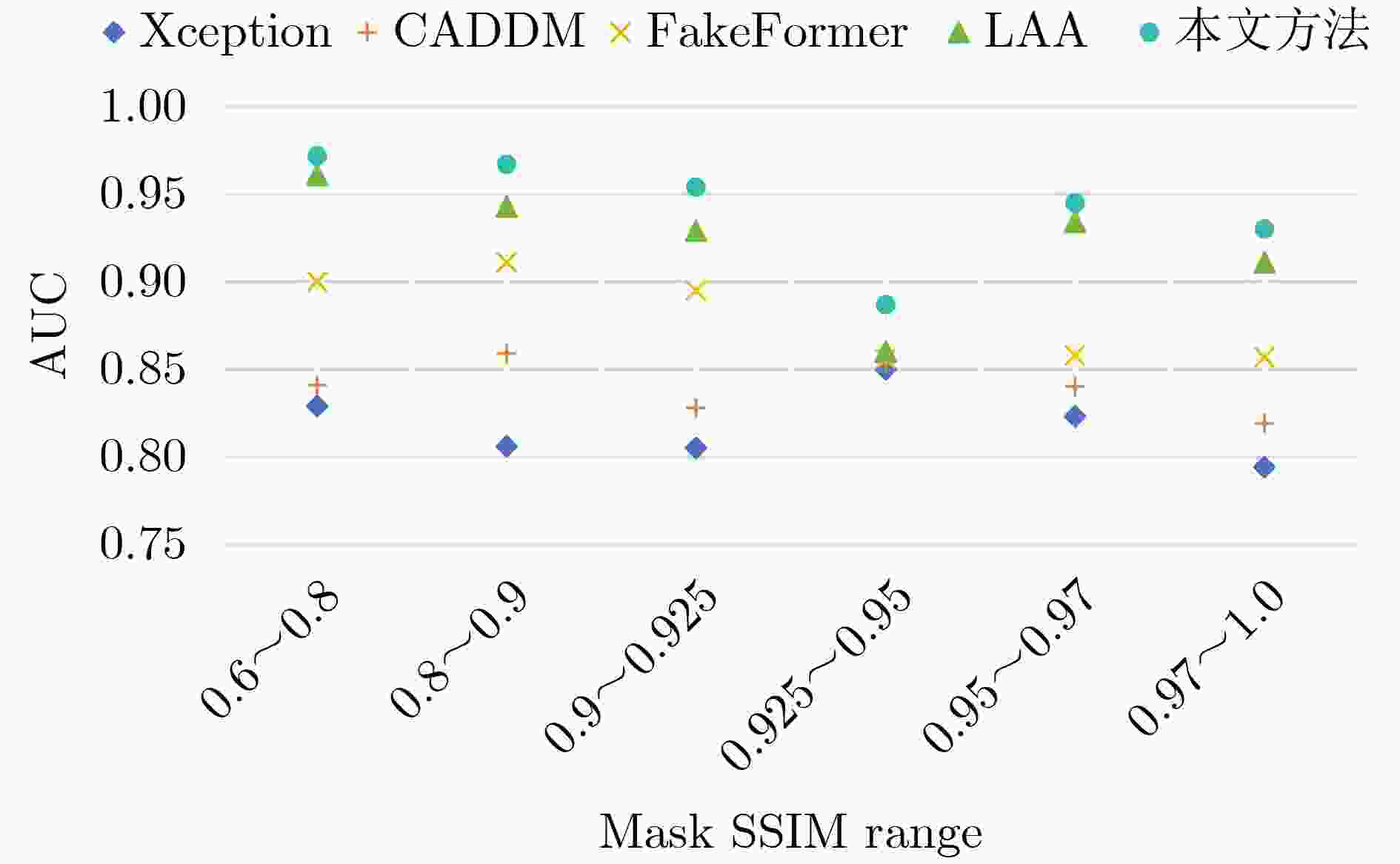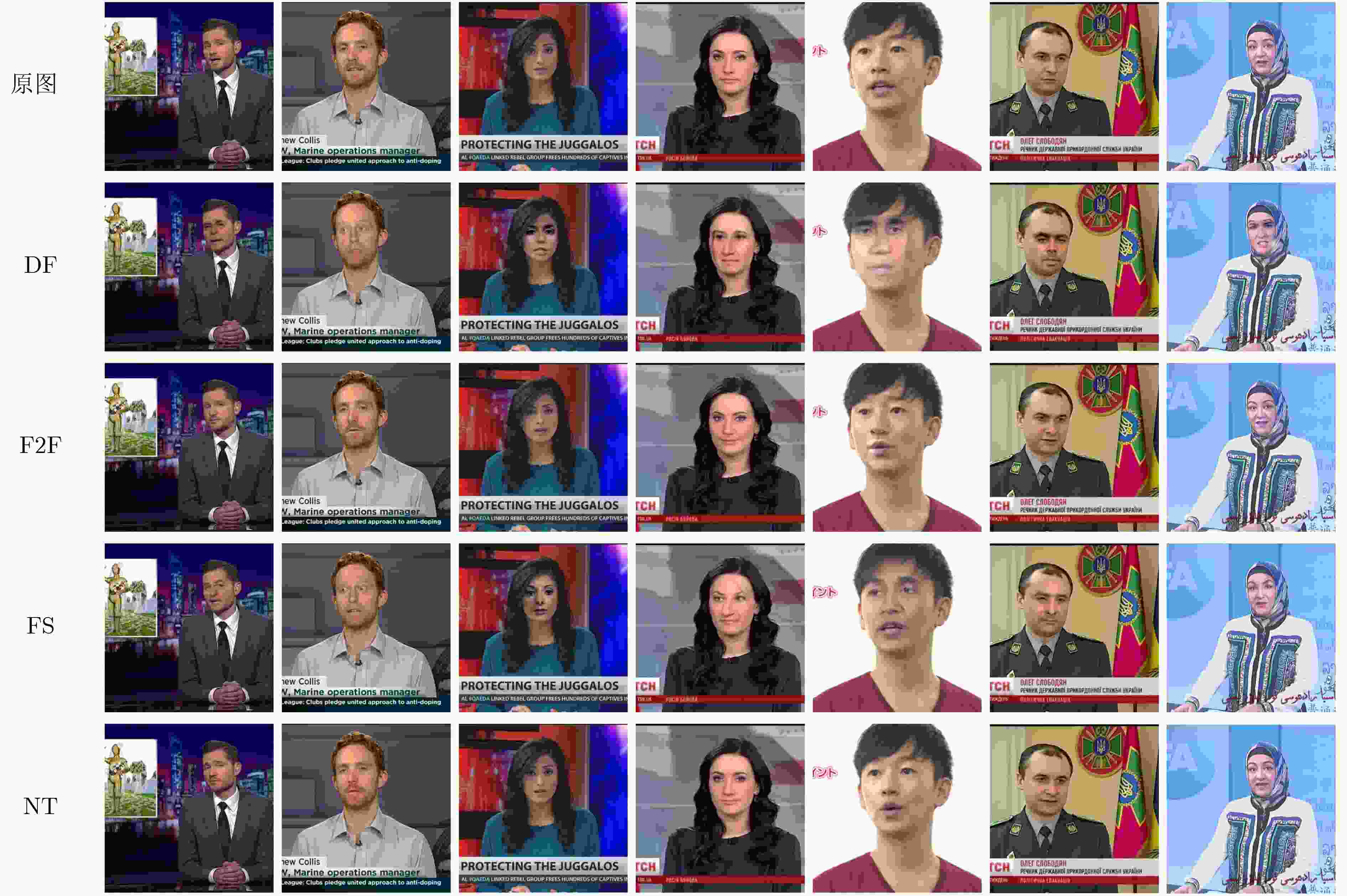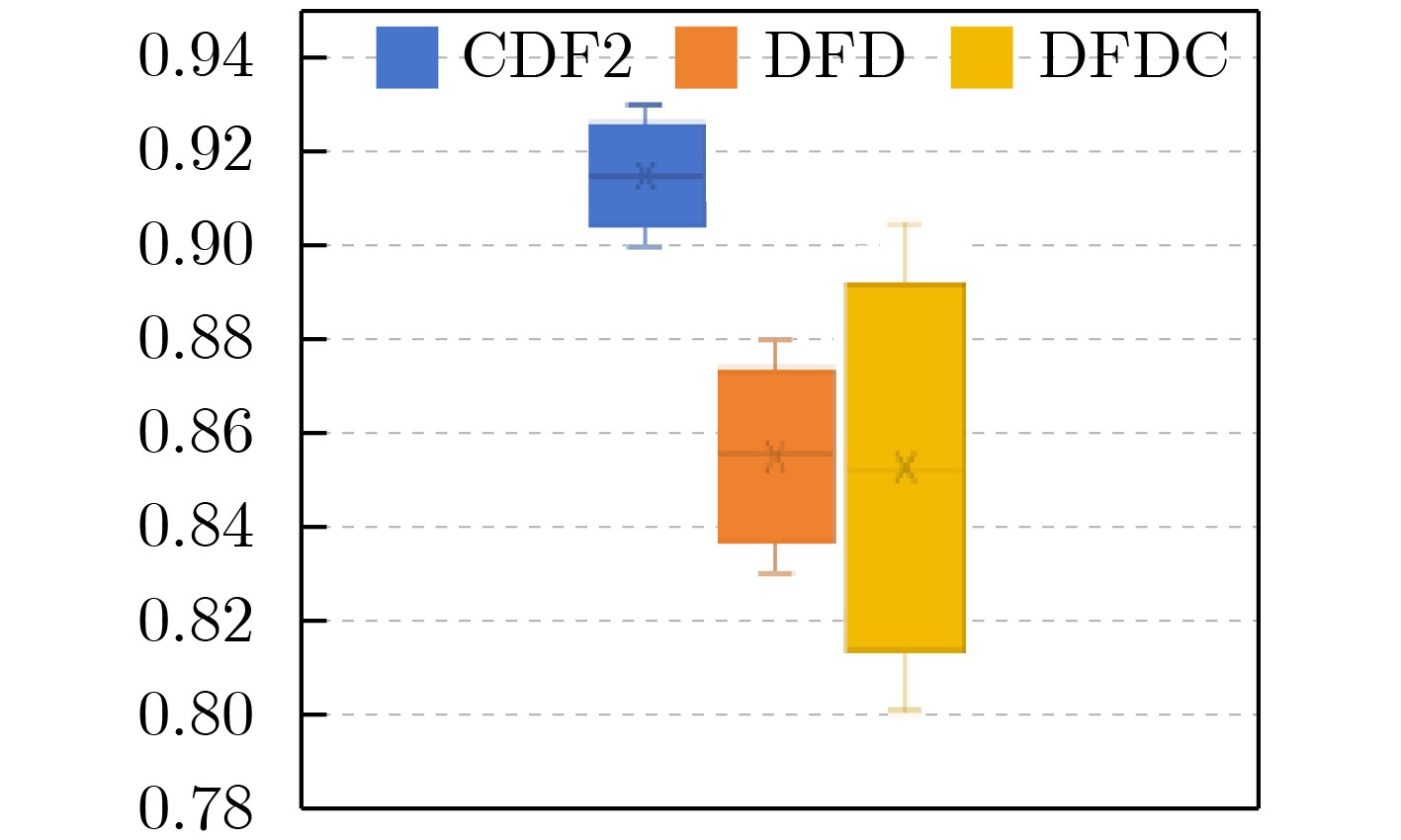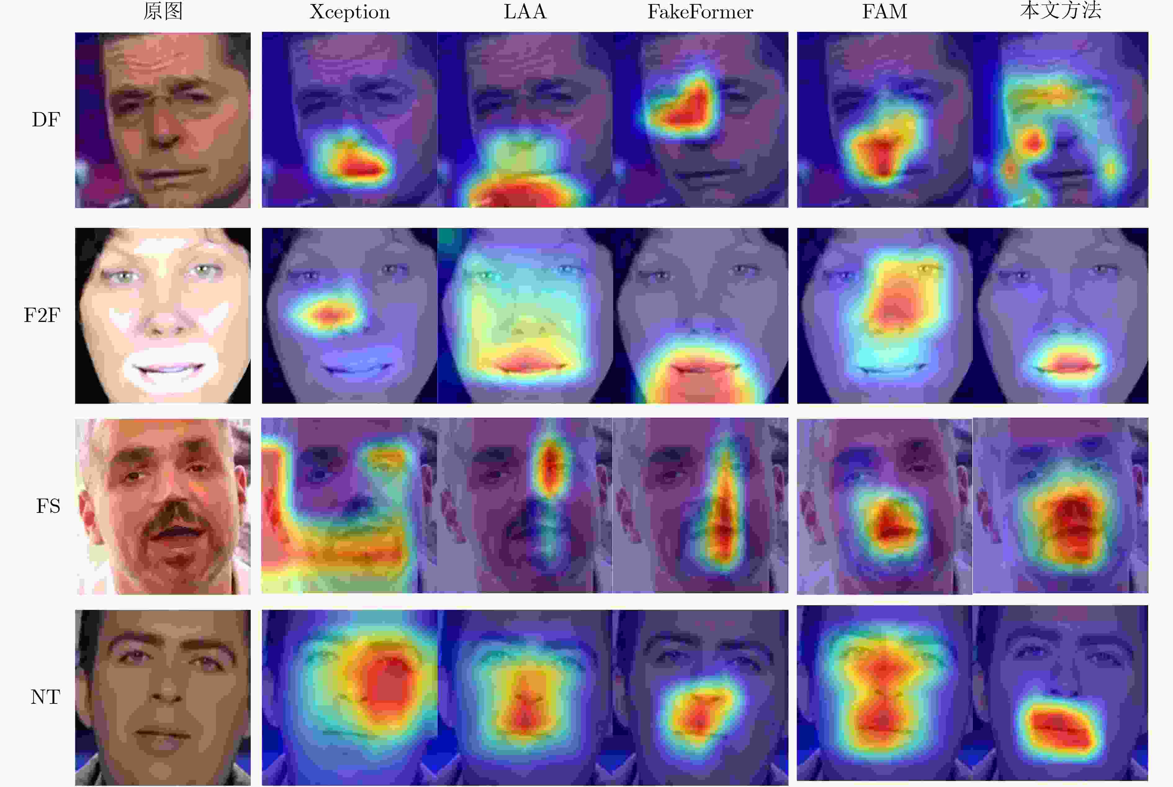 方法 FF++ CDF2 DFW DFD DFDC AUC AUC AP AUC AP AUC AP AUC AP Xception[11] 99.09 61.08 66.39 65.20 55.37 89.77 85.48 69.90 91.89 EfficientNet[12] 95.01 74.54 - 67.12 - 94.53 - 77.93 - Face x-ray[34] 99.20 79.51 - - - 95.40 93.51 65.50 - RECCE[30] - 68.71 70.35 68.16 54.41 - - 91.33 - Multi-attentional[13] - 67.02 75.30 59.74 73.80 92.95 96.51 68.01 - CADDM[41] 99.69 93.88 91.12 74.48 75.23 99.03 99.59 - - TBX[55] 96.88 74.31 - - - 82.37 - - - UCF[56] - 82.41 - - - 94.47 - 80.51 - ViT[57] 97.45 92.62 - - - 95.72 - 77.35 - FakeFormer[58] 97.67 94.45 97.15 81.74 83.72 96.12 98.31 78.91 - SBI[38] 99.64 93.18 85.16 67.45 55.79 97.58 92.83 86.15 94.24 AUNet[59] 99.46 92.77 - - - 99.22 - 86.16 - LAA-Net[40] 99.46 95.40 97.64 80.03 81.08 98.95 99.40 86.94 97.70 本文方法 99.71 96.04 94.27 82.11 81.47 99.51 98.76 88.27 96.47 注:粗体表示最优值,下划线表示次优值。 表 2 屏蔽各个部件后的多数据集AUC值(%)