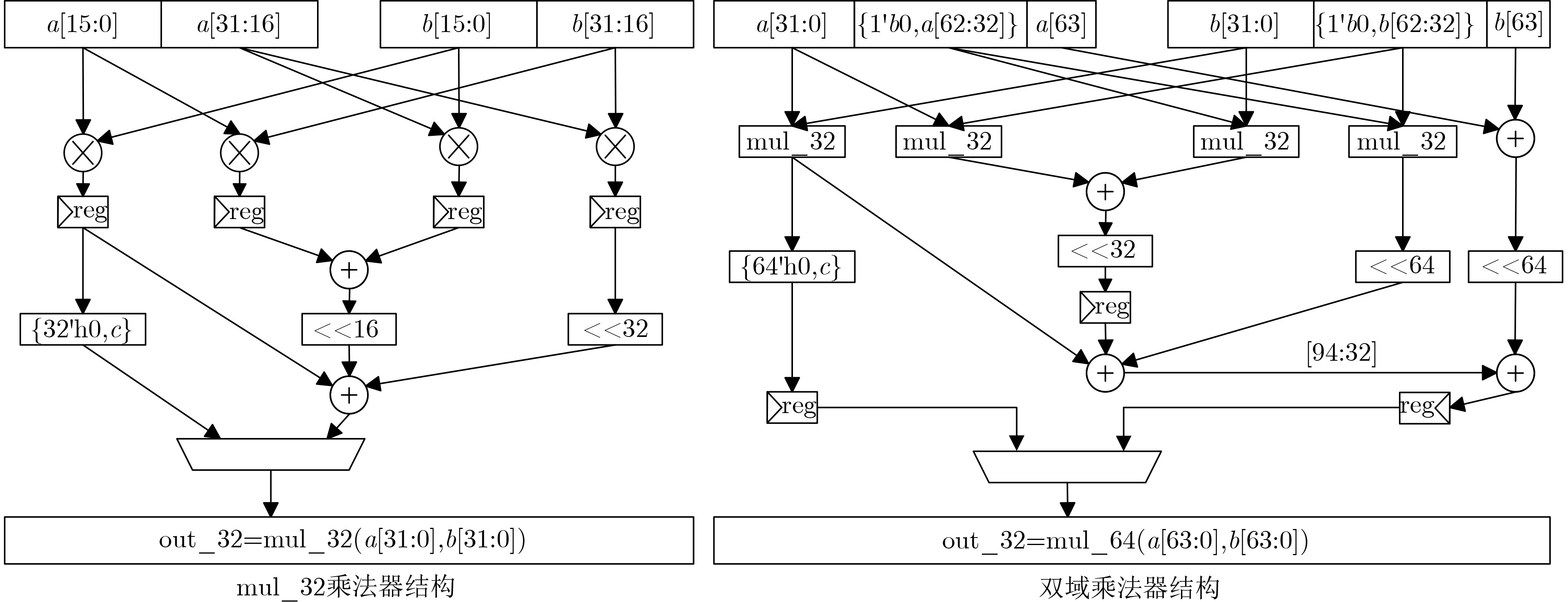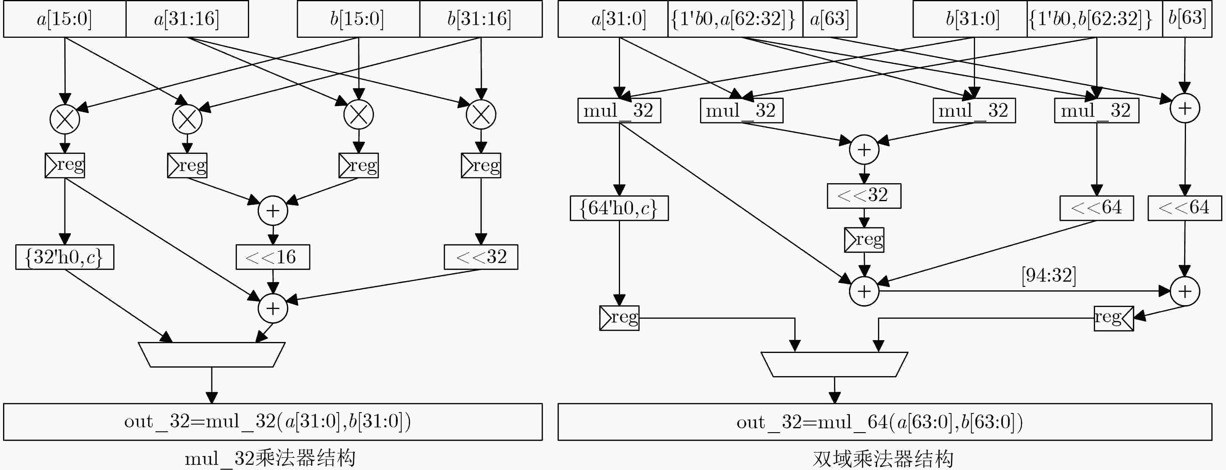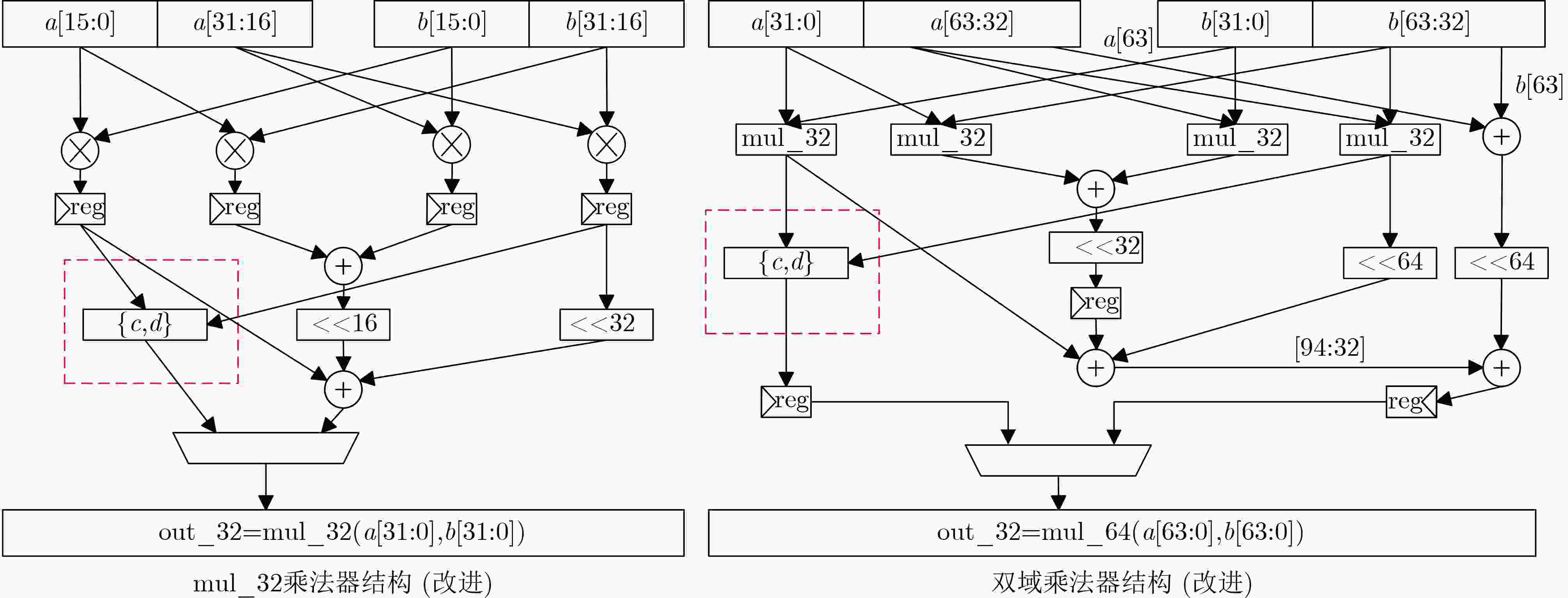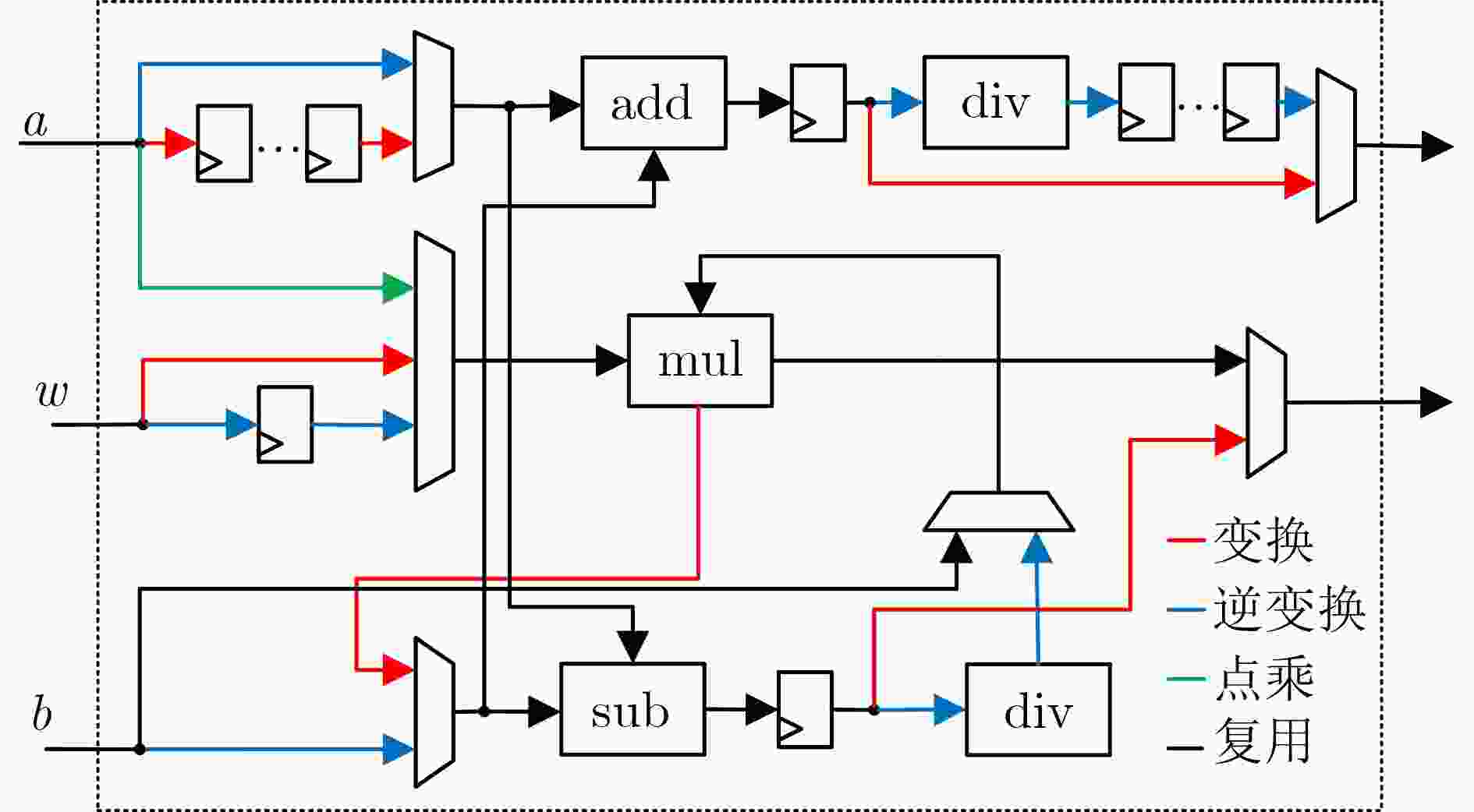 Kyber Dilithium/Falcon 变换 $ \left.\begin{array}{c}{a}^{\prime}=a+b\cdot \omega \\{b}^{\prime}=a-b\cdot \omega \end{array}\right\}\Rightarrow \begin{array}{c}a+b\cdot c\\a-b\cdot c\end{array} $ $ \left.\begin{array}{c}{a}^{\prime}=a+b\cdot \omega \\{b}^{\prime}=a-b\cdot \omega \end{array}\right\}\Rightarrow \begin{array}{c}a+b\cdot c\\a-b\cdot c\end{array} $ 点乘 $ \left.\begin{array}{c}{\hat{c}}_{2i}=({\hat{a}}_{2i}\cdot {\hat{b}}_{2i})+({\hat{a}}_{2i+1}\cdot {\hat{b}}_{2i+1})\cdot \omega \\{\hat{c}}_{2i+1}=({\hat{a}}_{2i}\cdot {\hat{b}}_{2i+1})+{\hat{a}}_{2i+1}\cdot {\hat{b}}_{2i}\end{array}\right\}\Rightarrow \begin{array}{c}b\cdot c\\a+d\cdot e\end{array} $ $ {c}_{i}={a}_{i}\cdot {b}_{i}\Rightarrow b\cdot c $ 逆变换 $ \left.\begin{array}{c}{a}^{\prime}=(a+b)/2\\{b}^{\prime}=\omega \cdot (a-b)/2\end{array}\right\}\Rightarrow \begin{array}{c}(a+b)/2\\\omega \cdot (a-b)/2\end{array} $ $ \left.\begin{array}{c}{a}^{\prime}=(a+b)/2\\{b}^{\prime}=\omega \cdot (a-b)/2\end{array}\right\}\Rightarrow \begin{array}{c}(a+b)/2\\\omega \cdot (a-b)/2\end{array} $ 算法1:Montgomery模乘 算法2:Barrett模乘 算法3:K-RED模乘 输入:$ A,B,R,P,{P}^{\prime} $ 输入:$ a,b,m=\left\lfloor {2}^{k}/q\right\rfloor ;k\approx 2\left\lceil \log q\right\rceil $ 输入:$ a,b,q=k\times {2}^{m}+1 $ 输出:$ u=A\times B\times {R}^{-1}(\mathrm{mod}P) $ 输出:$ O=a\times b(\mathrm{mod}q) $ 输出:$ {C}^{\prime}=k\times a\times b\mathrm{mod}q $ 1: $ t=A\times B $ 1: $ O=a\times b $ 1: $ C=a\times b $ 2: $ s=(t+(t\times {P}^{\prime}(\mathrm{mod}R)\times P)))/R $ 2: $ t=(O\times m)\gg k $ 2: $ {C}_{l}=C\mathrm{mod}{2}^{m} $ 3: $ if(s \gt P) $ 3: $ O=O-(t\times q) $ 3: $ {C}_{h}=C\gg m $ 4: $ s=s-P $ 4: $ if(O\geq q) $ 4: $ {C}^{\prime}=k{C}_{l}-{C}_{h} $ 5: $ returns $ 5: $ O=O-q $ 5: $ return{C}^{\prime} $ 6: $ returnO $ 4 双域可重构乘法单元