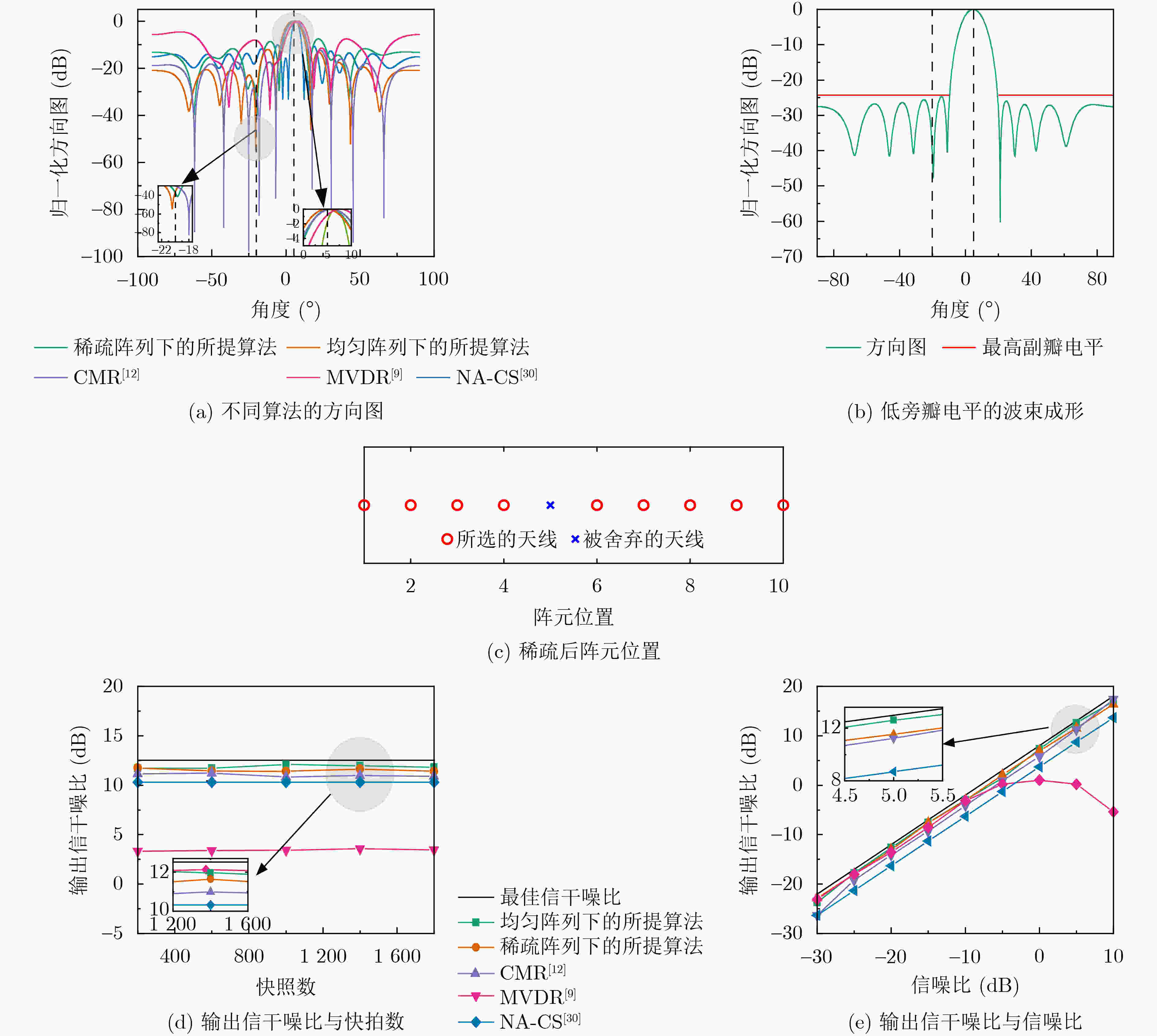 算法 计算复杂度 主要计算来源 所提算法 $ O\left(\sqrt{N+J}\left({N}^{3}+N{K}^{2}+NJ\right)\right) $ 多约束SOCP内点法求解 MVDR[9] $ O\left({N}^{3}\right) $ 协方差矩阵求逆 CMR[12] $ O\left({N}^{3.5}\right) $ 协方差矩阵重构与优化 NA-CS[30] $ O\left({N}^{2}D+{D}^{3}\right) $ 稀疏重构与字典矩阵构建 注:$ N $是天线个数,$ K $是接收信号的采样点数,$ J $是副瓣区域采样点数,$ D $是离散化空域点数,通常远大于$ N $,导致其实际计算负担较重。 -