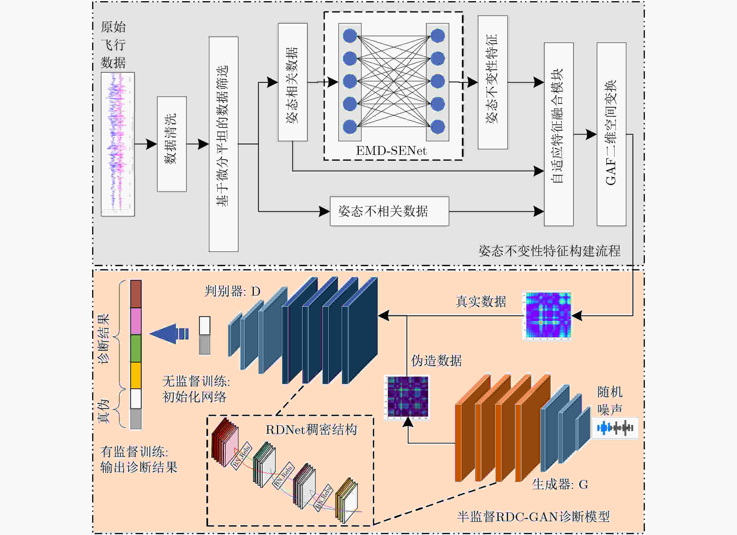 摘要: 无人机的飞控系统故障诊断主要面临以下两大挑战:其一,作为新兴的空中飞行平台,无人机可用于故障诊断的有效训练数据规模有限,存在显著的训练数据匮乏问题;其二,作为高机动性空中飞行平台,无人机在不同飞行姿态下的数据分布差异显著,存在数据环境高度变动的问题。针对这两种挑战,该文提出了一种结合姿态不变性特征和半监督复兴稠密生成对抗分类网络(RDC-GAN)模型的飞控系统故障诊断方法。方法首先通过基于微分平坦的数据筛选将无人机数据分为姿态相关数据和姿态不相关数据;对于姿态相关数据,利用经验模态挤压激励网络(EMD-SENet)提取对姿态变化具有鲁棒性的姿态不变性特征;之后采用自适应特征融合模块将姿态不相关数据、姿态相关数据和提取到的姿态不变性特征进行加权融合;最后将融合特征送入半监督RDC-GAN模型进行两阶段训练:第1阶段采用无监督训练,利用大量无标签数据对模型网络权重初始化,第2阶段采用有监督训练,通过少量有标签数据进一步对网络权重进行微调,从而实现仅用少量有效数据就能精确诊断出无人机飞控故障的目的。方法在公开数据集RflyMad上整体精度达到了95.71%,在真机故障诊断实验中的整体精度达到了92.78%。Abstract: