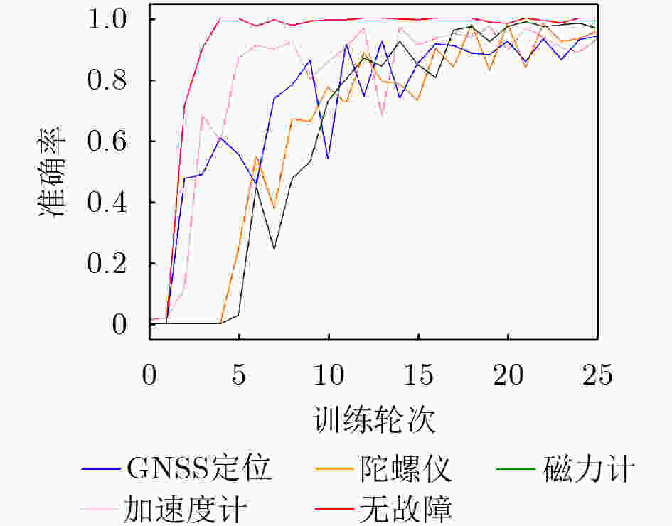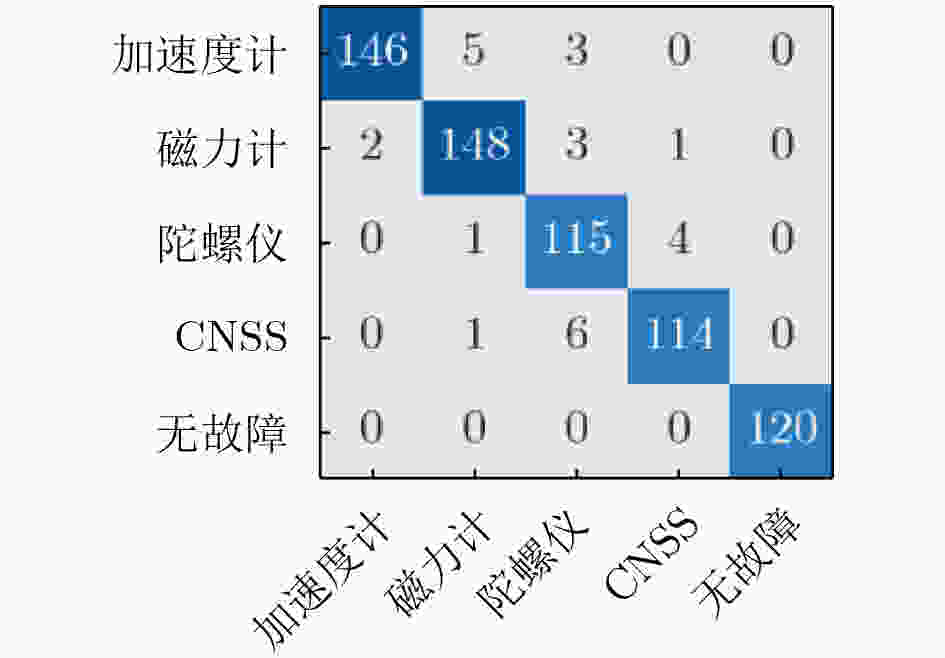 方法 文献[12]方法 文献[13]方法 文献[14]方法 文献[8]方法 文献[15]方法 文献[16]方法 文献[17]方法 本文方法 GNSS故障 85.31±1.25 92.25±1.51 92.41±1.21 91.21±1.31 90.12±1.42 92.45±0.87 93.21±0.75 95.29±0.58 加速度计故障 87.13±1.52 90.34±1.04 90.27±1.64 90.07±0.93 88.26±1.13 91.63±0.79 91.97±0.77 93.54±0.49 磁力计故障 83.28±0.56 88.92±0.86 89.34±0.87 86.32±0.62 87.18±0.56 91.12±0.64 91.25±0.65 93.51±0.37 陀螺仪故障 85.45±0.43 89.35±1.56 90.15±0.55 88.41±0.97 85.91±0.52 91.87±0.61 92.27±0.48 94.27±0.41 无故障 94.16±0.28 97.39±0.43 97.83±0.29 97.62±0.34 95.56±0.44 97.51±0.32 97.43±0.24 100±0.00 整体精度 88.41±0.86 91.89±0.82 92.15±0.74 91.57±0.76 90.08±0.62 92.84±0.61 93.54±0.51 95.71±0.25 平均精度 87.06±1.07 91.65±1.12 92.04±0.81 90.72±0.59 89.41±0.53 92.53±0.54 92.90±0.45 95.32±0.31 卡帕系数 87.91±0.94 91.56±1.04 92.07±0.78 91.25±0.62 89.52±0.65 92.64±0.59 93.01±0.46 95.41±0.29 表 4 主干网络模型对比