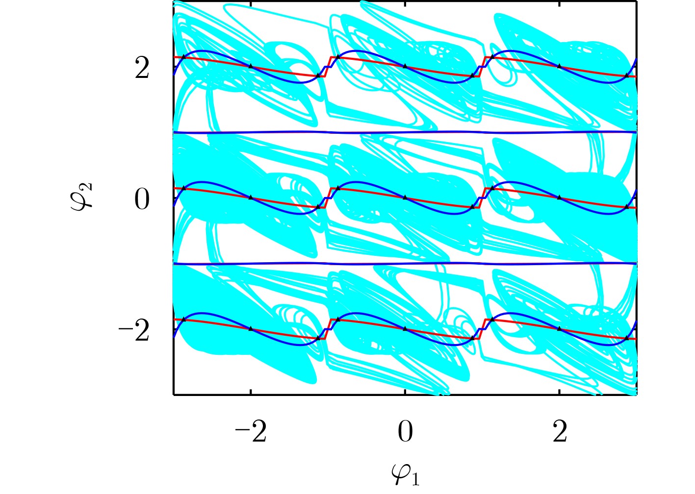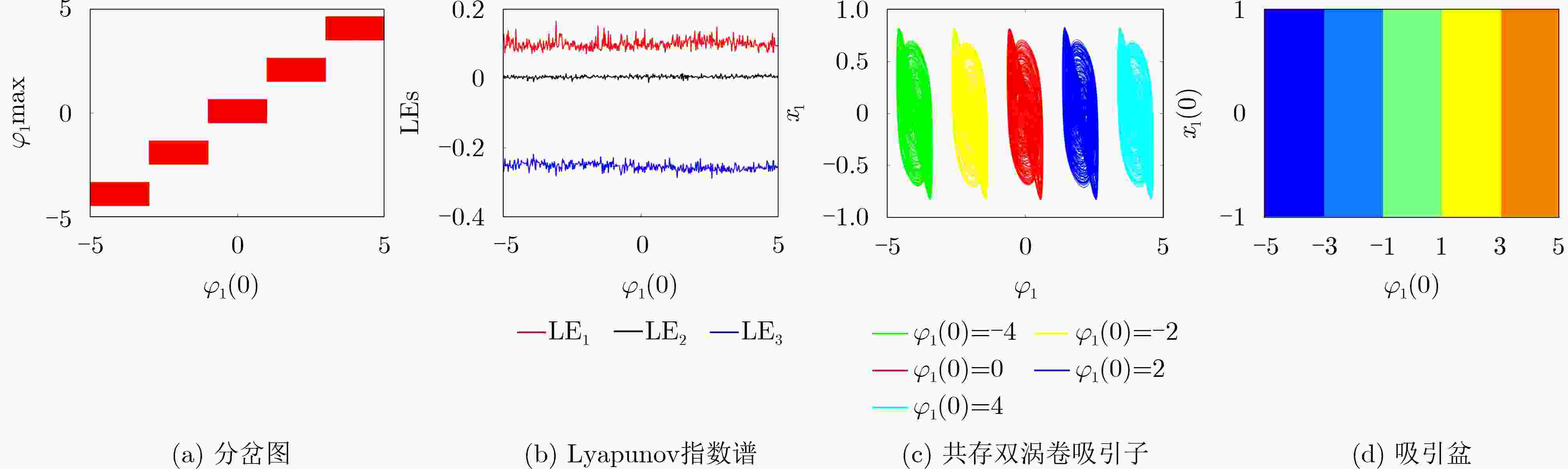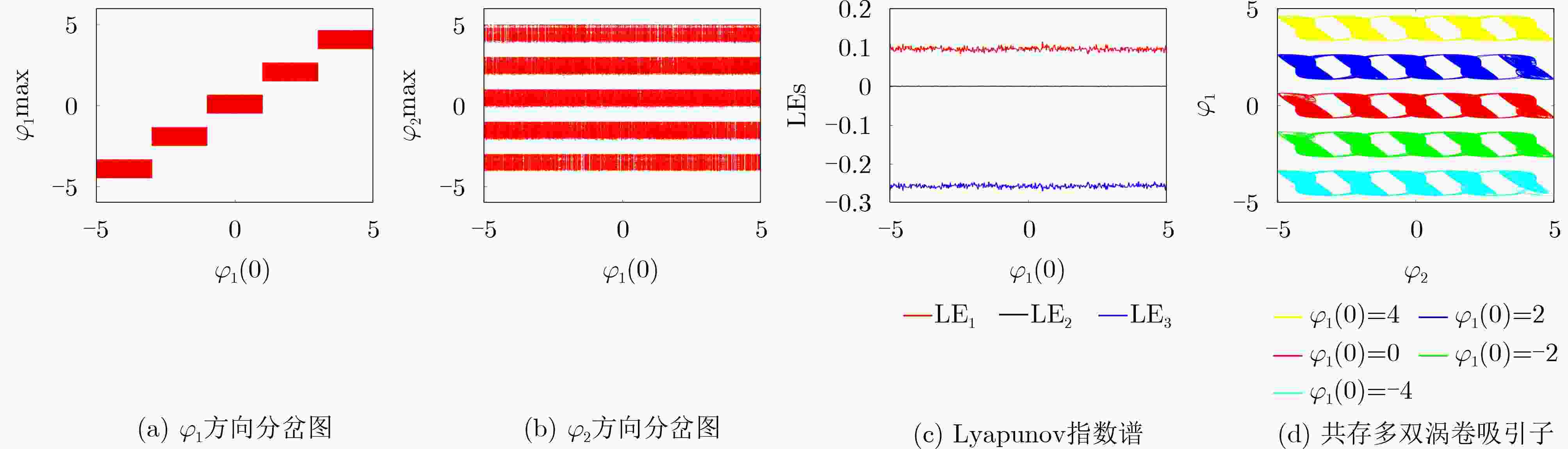$ {\beta }_{1}=0.001 $图2(b) 2 $ \begin{cases} {\dot{x}}_{1}=-{x}_{1}+2.22\tanh ({x}_{1})-1.21\tanh ({x}_{2})+0.5\tanh ({x}_{3})\\ {\dot{x}}_{2}=-{x}_{2}+2.1\tanh ({x}_{1})+1.7\tanh ({x}_{2})+1.15\tanh ({x}_{3})\\ {\dot{x}}_{3}=-{x}_{3}-4.75\tanh ({x}_{1})+k_2{W}_{2}({\varphi }_{2})\tanh ({x}_{2})+k_1{W}_{1}({\varphi }_{1})\tanh ({x}_{3})\\ {\dot{\varphi }}_{1}=-{b}_{1}f({\varphi }_{1})+{a}_{1}\tanh ({x}_{3})\\ {\dot{\varphi }}_{2}=-{b}_{2}f({\varphi }_{2})+{a}_{2}\tanh ({x}_{2})\\ \end{cases} $ $ {b}_{2}=1.385 $