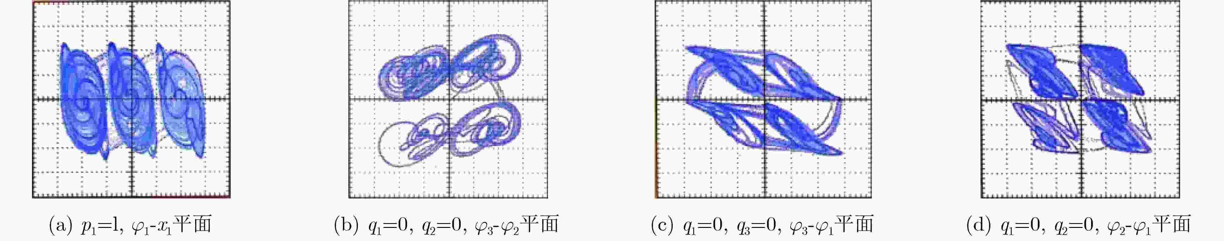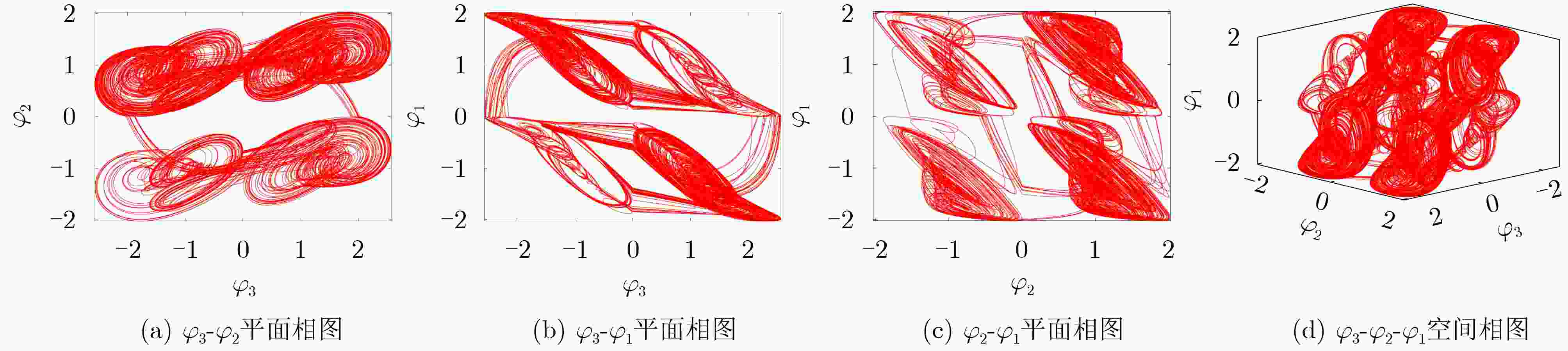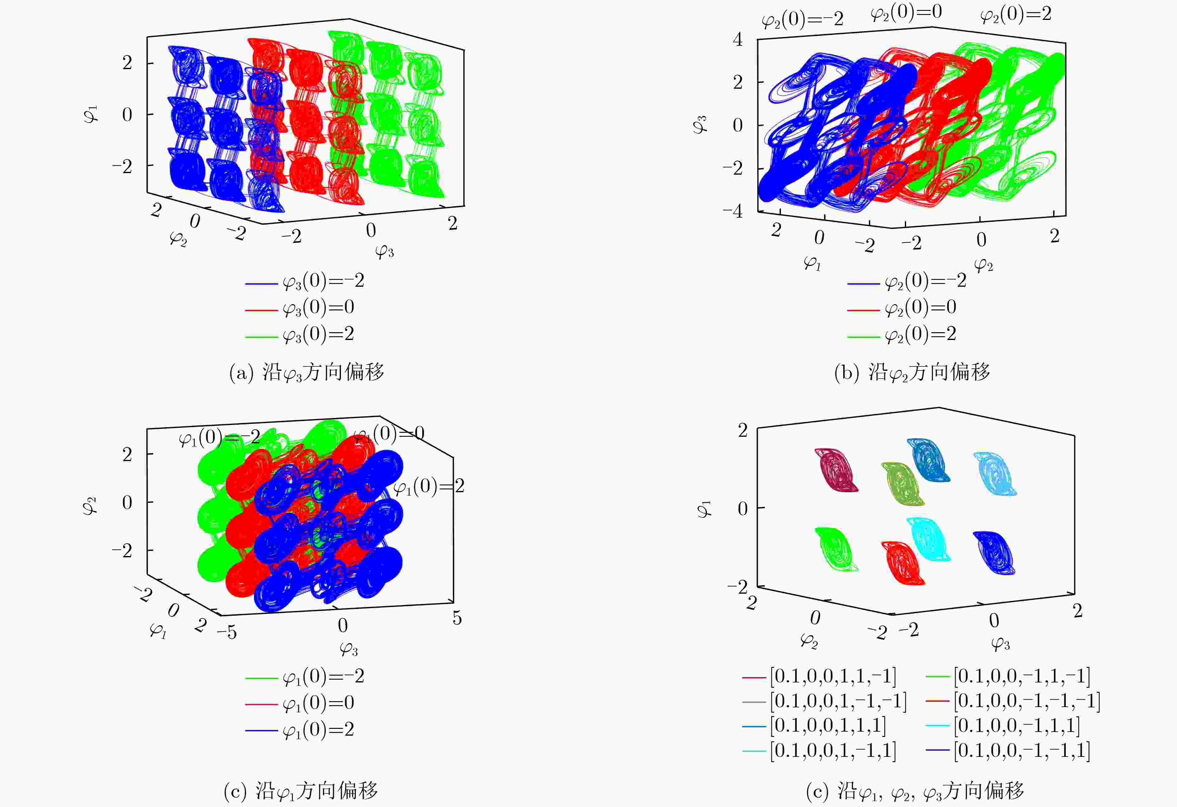 其余参数与上一致图2(c) 3 $ \begin{cases} {\dot{x}}_{1}=-{x}_{1}+2.22\tanh ({x}_{1})-1.21\tanh ({x}_{2})+0.5\tanh ({x}_{3})+k_3{W}_{3}({\varphi }_{3}){x}_{1}\\ {\dot{x}}_{2}=-{x}_{2}+2.1\tanh ({x}_{1})+1.7\tanh ({x}_{2})+1.15\tanh ({x}_{3})\\ {\dot{x}}_{3}=-{x}_{3}-4.75\tanh ({x}_{1})+k_2{W}_{2}({\varphi }_{2})\tanh ({x}_{2})+k_1{W}_{1}({\varphi }_{1})\tanh ({x}_{3})\\ {\dot{\varphi }}_{1}=-{b}_{1}f({\varphi }_{1})+{a}_{1}\tanh ({x}_{3})\\ {\dot{\varphi }}_{2}=-{b}_{2}f({\varphi }_{2})+{a}_{2}\tanh ({x}_{2})\\ {\dot{\varphi }}_{3}=-{b}_{3}f({\varphi }_{3})+{a}_{3}{x}_{1}\\ \end{cases} $ $ {b}_{3}=1.4 $