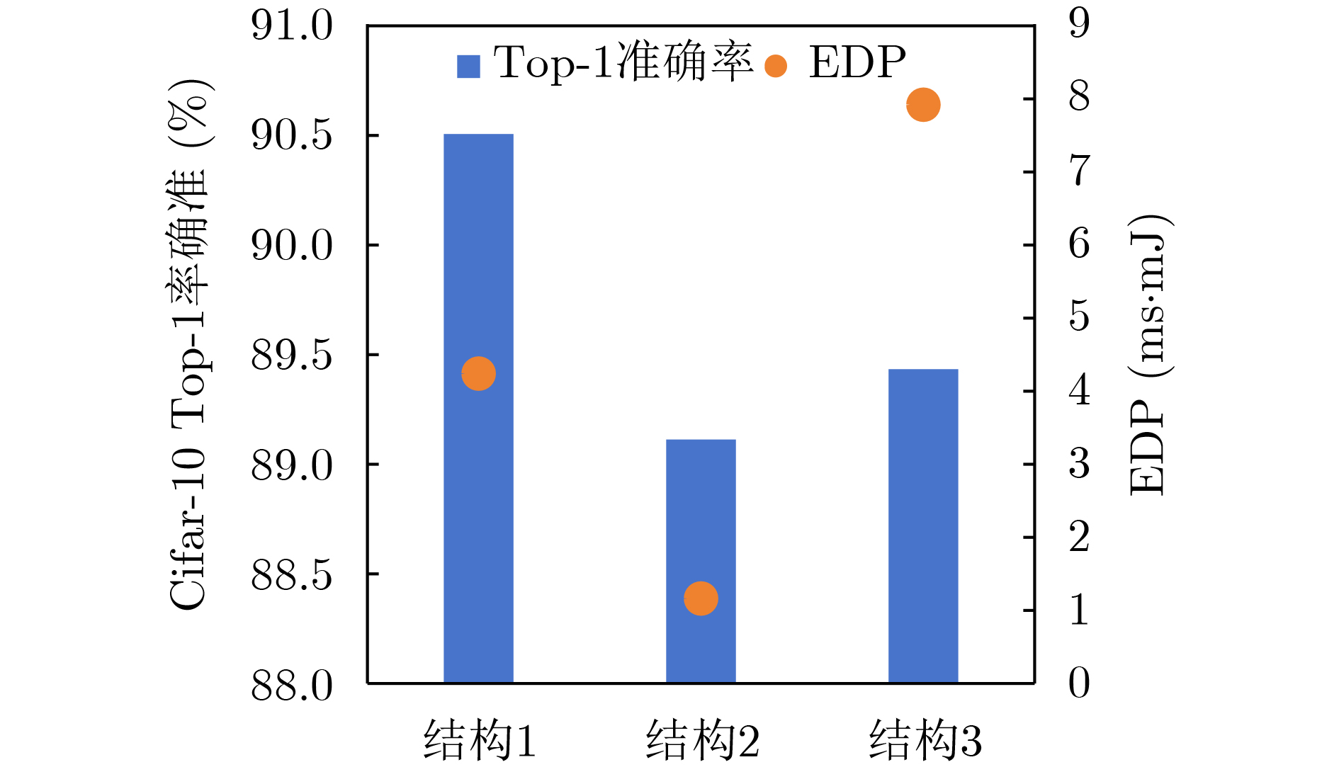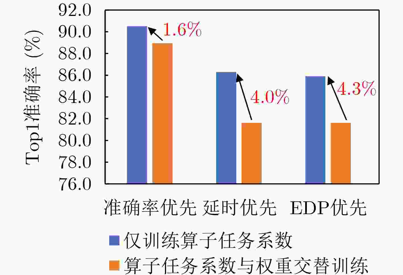 时长(h)NACIM 73.9 1.55 - - 59 UAE 83.0 - - - 154 NAS4RRAM 84.4 - - - 289 CARS(准确度优先) 88.0 11.03 - - 72 Gibbon(准确度优先) 88.3 14.33 - - 6 Gibbon(EDP优先) 84.6 0.24 - - 6 NAS4CIM(准确度优先) 90.5 4.23 268.35 81.10 6 NAS4CIM(EDP优先) 85.9 0.16 65.59 19.76 6 NAS4CIM(平衡) 89.3 0.97 135.23 49.12 6 表 4 FashionMNIST 数据集上的搜索结果与实片测试结果