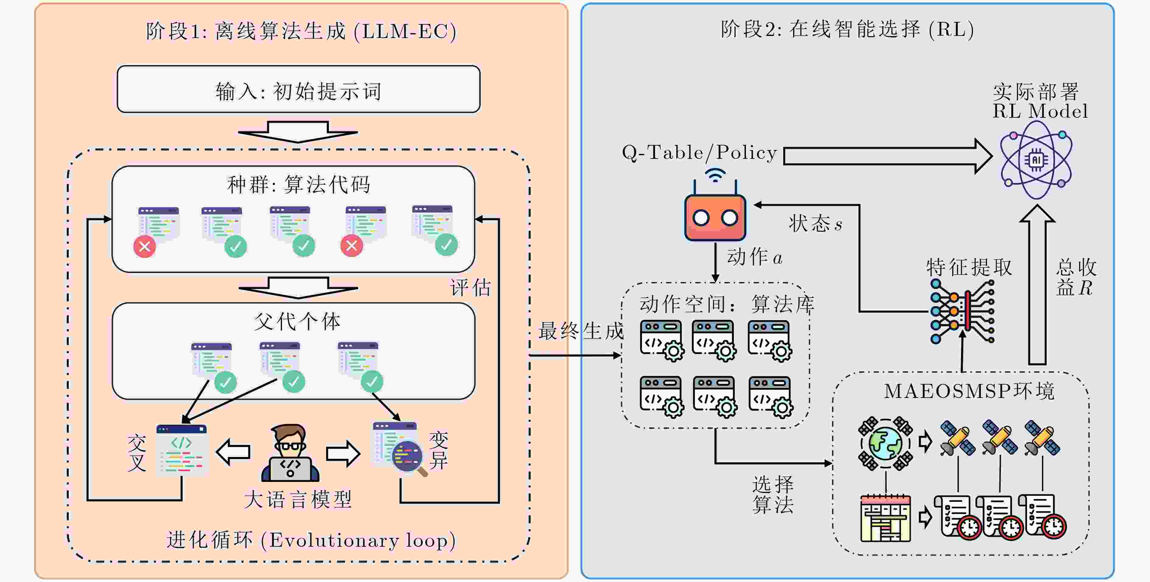 $ N\mathrm{_o} $,学习率$ \alpha $,折扣因子$ \gamma $,训练迭代次数$ E\mathrm{_{max}} $输出:最优任务分配算法库$ \mathcal{A} $,训练好的RL策略$ {Q}^{\mathrm{*}} $ /* 第一阶段:基于多场景进化的离线算法库构建 */ 1 初始化算法库$ \mathcal{A}\leftarrow \mathcal{\varnothing } $ 2 for 每个场景$ S\mathit{\mathrm{_{\mathit{\mathrm{\mathrm{k\mathrm{ }}}}}}}\in\mathcal{S}_{\mathrm{train}} $ do: 3 初始化:使用LLM生成针对场景$ S\mathrm{_{\mathit{\mathrm{k}}}} $的初始种群$ \mathrm{Pop} $ 4 for $ g=1 $ to $ G\mathrm{_{EC}} $ do 5 评估$ \mathrm{Pop} $中所有个体的适应度(在场景$ S\mathrm{_k} $下的收益) 6 通过轮盘赌方法选择父代个体 7 交叉与变异: 8 for 每一对父代 do 9 if $ \text{Random} < p\mathrm{_c} $ then 10 通过LLM对父代代码进行交叉,生成子代 11 else 12 直接保留父代 13 end if 14 end for 15 for 每个子代 do 16 if $ \text{Random} < p\mathrm{_c} $ then 17 通过LLM变异提示对代码进行变异 18 end if 19 end for 20 更新种群$ \mathrm{\mathrm{Pop}\mathrm{ }} $,保留最优个体 21 end for 22 $ \pi_{\mathrm{\mathit{k}}}^{\mathrm{*}}\leftarrow $从$ \mathrm{Pop} $中选取的最优算法 23 $ \mathcal{A}\leftarrow \mathcal{A}\cup \{\pi _{k}^{\mathrm{*}}\} $ 24 end for /* 第二阶段:基于求解状态的RL策略训练 */ 25 初始化Q表$ Q(\boldsymbol{s},a)\leftarrow 0 $ 26 for episode $ e=1 $ to $ E\mathrm{_{max}} $ do 27 随机选择场景$ S\in\mathcal{S}\mathrm{_{train}} $,初始化解$ {\boldsymbol{x}}_{0} $ 28 初始化求解状态$ {\boldsymbol{s}}_{0} $ 29 while 未满足终止条件 do 30 动作选择:基于当前状态$ {\boldsymbol{s}}_{t} $,使用$\epsilon $-greedy策略从库