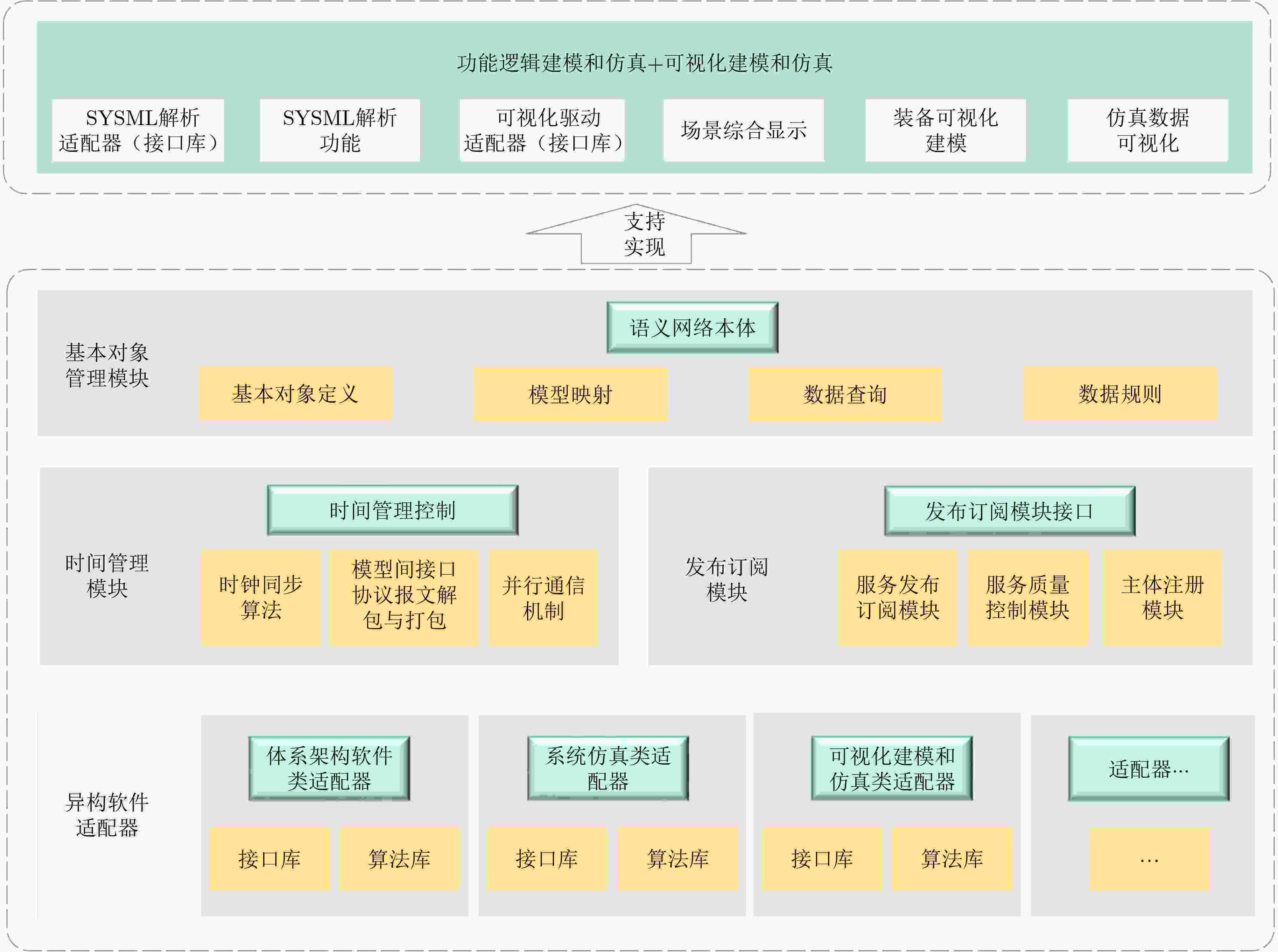 • 摘要: 该文聚焦于基于模型的系统工程(MBSE)应用于天基支援一体化仿真,旨在解决复杂运行体系下信息描述、系统互操作与集成仿真的关键难题。针对传统仿真方法在功能逻辑-时空信息的跨平台协同、动态扩展和高效集成方面的不足,该文提出一种基于离散事件系统规范(DEVS)的多视角建模仿真方法,并构建了“1个平台+N个组件适配器”的分布式混合仿真集成框架。该框架通过基本对象管理、异构软件适配器、时间管理控制和发布订阅四大核心模块,实现了对系统模型的抽象化互联、仿真资源的即插即用、全局时序的精确同步以及高性能实时通信,有效支撑了异构仿真软件的互操作与可重用。在此基础上,进一步设计了联合仿真系统,整合体系架构开发与验证软件与运行可视化与推演的时空仿真软件,利用消息中间件实现状态机与时空模型之间的双向同步交互,完成了从运行概念到数字推演的闭环验证。以“海上天基支援拒止”为典型场景,开展了运行概念设计、资源分析与联合仿真,验证了体系功能逻辑的合理性与可信性。该研究成果为复杂联合运行体系的数字化设计、推演优化与方案改进提供了有效的技术路径与环境支撑。