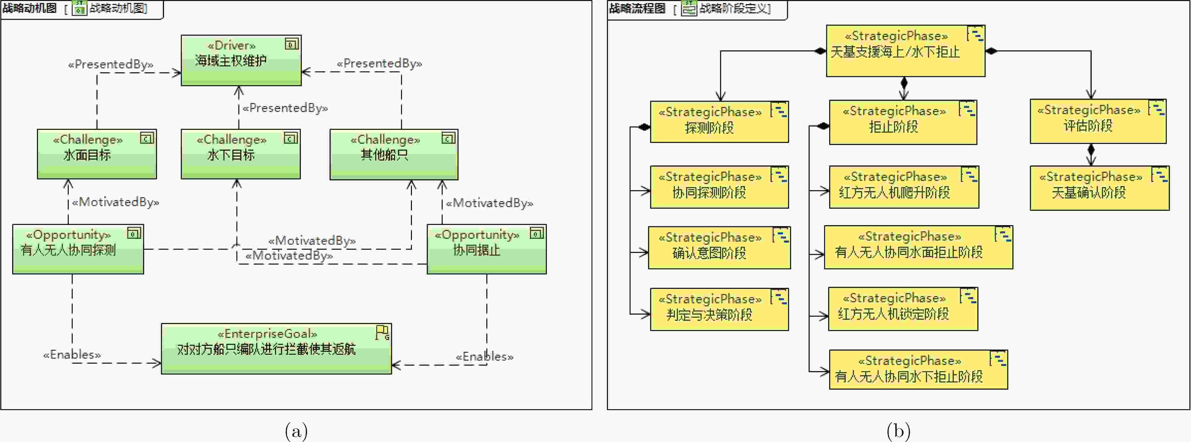 图  4  (a)海上天基支援拒止体系战略动机分析 (b)海上天基支援拒止体系战略流程分析