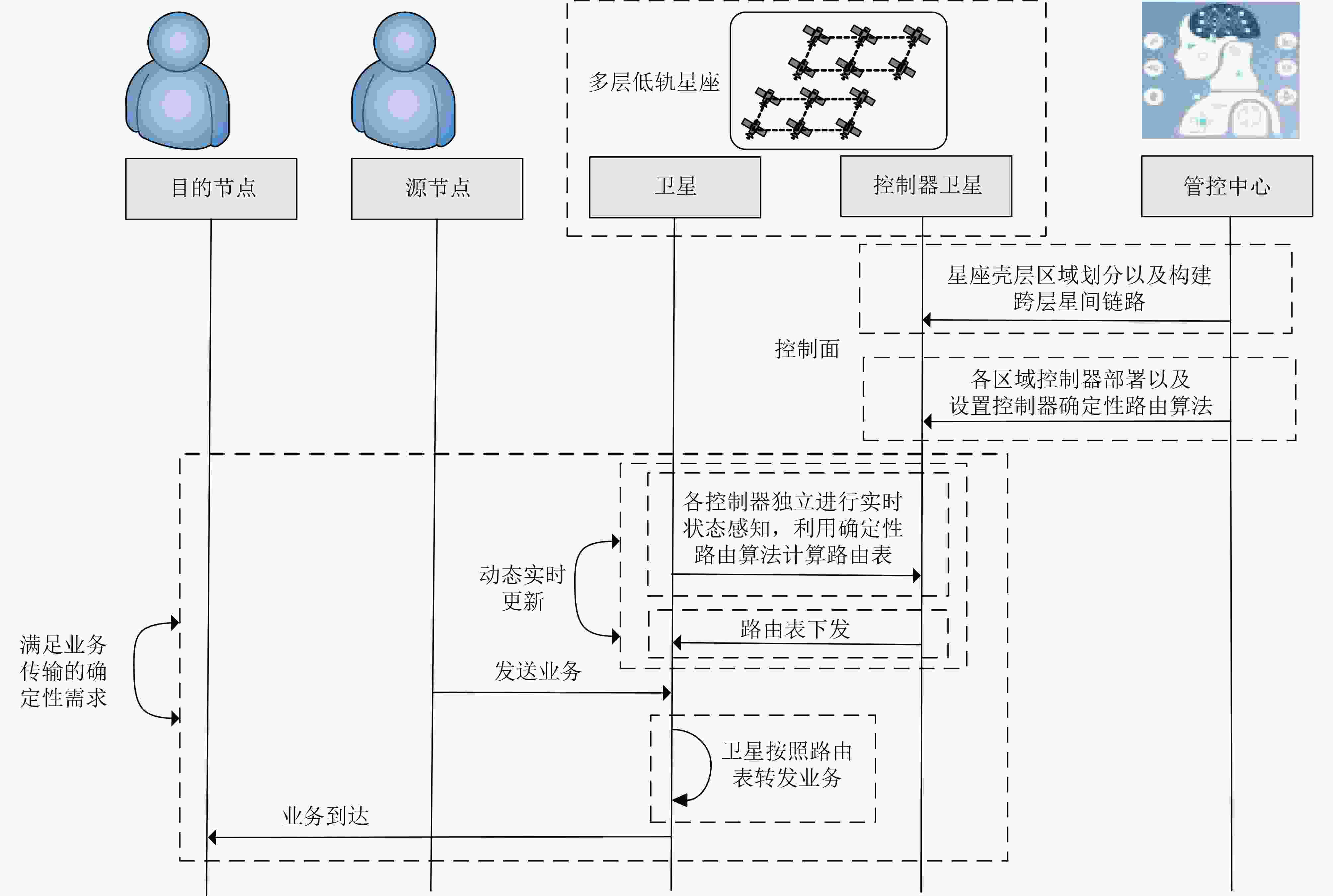 Objective The massive scale and large number of satellites in multi-layer Low Earth Orbit (LEO) constellations result in highly dynamic network topologies. Coupled with the time-varying traffic load, this leads to temporal fluctuations in satellite network resources (e.g., available link queue sizes, available link bandwidth), making it challenging to establish stable end-to-end transmission paths and guarantee Quality of Service (QoS). To address these issues, this study introduces Software-Defined Networking (SDN) into multi-layer LEO constellations. By leveraging SDN controllers to collect network state information, unified management of network resources is achieved. The constellation is partitioned into regions, with a controller deployed in each region to manage the entire constellation. Furthermore, a deterministic delay routing algorithm is designed within the SDN controller to compute inter-region transmission paths for traffic, thereby meeting its deterministic delay requirements. Methods This paper proposes a deterministic delay routing algorithm for multi-layer LEO constellations based on controller collaboration. Firstly, a regional division strategy and controller deployment scheme are proposed, dividing the satellite network into multiple regions, each managed by an assigned controller. Subsequently, criteria are established for Inter-Satellite Links (ISLs) between satellites within the same layer and across different layers to characterize link communication states. Finally, a Time-Varying Graph (TVG) model is employed to represent the network topology and link resource attributes, including bandwidth, queue size, and link duration. This is combined with a multi-destination LaGrange relaxation method to optimize path selection, ensuring the chosen paths satisfy both delay and delay jitter constraints. Through collaboration between adjacent regional controllers, which exchange state information, the proposed algorithm enables the computation of feasible inter-region paths. Results and Discussions To validate the effectiveness of the proposed method, a simulation system for multi-layer LEO constellations was designed, and the algorithm’s performance was tested under different data transmission rates. Compared to IUDR, the proposed method significantly enhances network performance by reducing end-to-end delay, delay jitter, and packet loss rate, while improving throughput. Specifically, at a data transmission rate of 3 Mbps, the average end-to-end delay was reduced by 16.0% ( Fig. 3(a) ), delay jitter by 37.9% (Fig. 3(b) ), packet loss rate by 37.2% (Fig. 3(c) ), and throughput increased by approximately 2%(Fig. 3(d) ). Regarding signaling overhead, the proposed algorithm achieves a higher Reduction-Improvement Gain Ratio, improved by approximately 111.8% compared to IUDR, indicating the superior comprehensive performance of the DDRA-ICC. Additionally, the proposed method exhibits lower time complexity for route computation compared to IUDR.Conclusions To solve the problem of deterministic delay for traffic transmission in multi-layer LEO constellations, this study proposed a controller collaboration-based deterministic delay routing algorithm. Performance evaluation under different load scenarios demonstrates that: (1) Compared to IUDR, the proposed algorithm reduces average end-to-end delay, delay jitter, and packet loss rate by 16.0%, 37.9%, and 37.2% respectively, while increasing average throughput by approximately 2%. (2) While the additional overhead increase of the DDRA-ICC is comparable to IUDR, it further reduces the packet loss rate to 2.96%—a reduction of 52.49%—and achieves a Reduction-Improvement Gain Ratio of 1.97. This indicates lower packet loss, a higher Reduction-Improvement Gain Ratio, and demonstrates a better balance between overhead and reliability, granting it greater advantage in ensuring deterministic traffic transmission. Future work could incorporate more practical factors, such as the impact of satellite node failures on network performance, to further enhance network capabilities. -