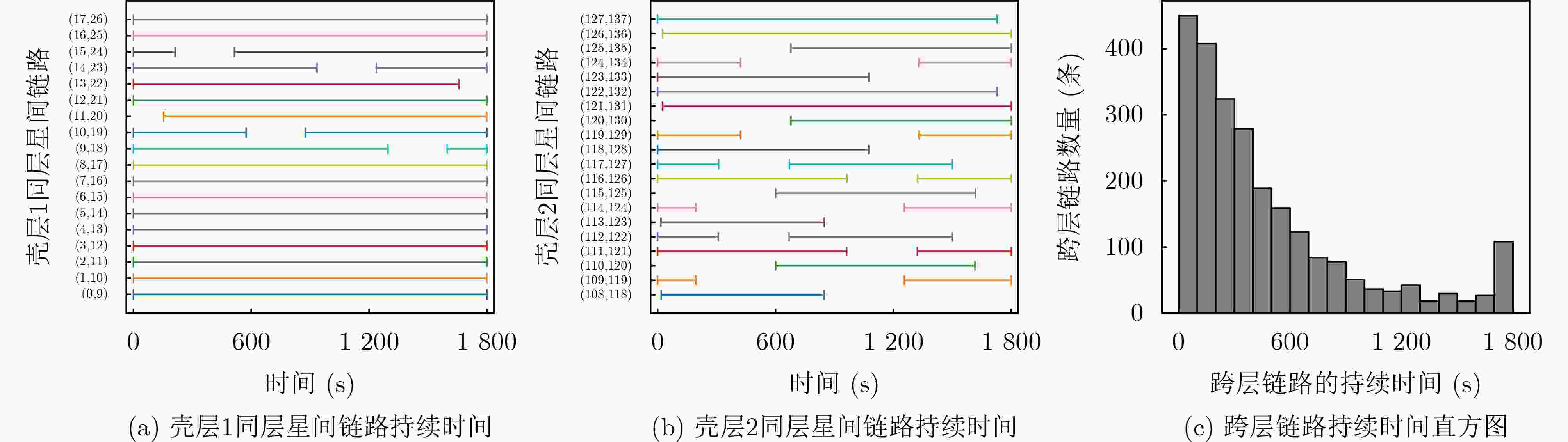延约束$ D $和时延抖动约束$ J $输出: 当前区域内从$ {S}_{G} $到$ {D}_{G} $满足确定性时延需求的路径$ \text{path} $ 1: 确定$ {S}_{G} $和$ {D}_{G} $所在的区域,源用户终端节点$ {S}_{G} $所在的区域称为源区域$ {S}_{R} $,目的用户终端节点$ {D}_{G} $所在的区域称为目的区域$ {D}_{R} $ 2: 基于最小跳数在$ {G}_{R} $中,计算源区域到目的区域的所需经历的区域集合$ {p}_{r} $ 3: 针对区域集合$ {p}_{r} $中每个区域的控制器更新时变增量图$ {G}_{{{r}_{i}}} $ 4: 给定$ D $和$ J $,按照公式(10)计算区域集合$ {p}_{r} $中每个区域对应的时延约束$ {D}_{{{r}_{i}}} $和时延抖动约束$ {J}_{{{r}_{i}}} $,令$ i=0 $ 5: 判断当前区域$ {r}_{i} $是否为源区域$ {S}_{R} $,若是,则设置当前区域$ {r}_{i} $的源节点$ {S}_{s} $为$ {S}_{G} $,若不是,则令$ {S}_{s} $为$ {r}_{i} $第一个接收到业务的卫星节点 6: 判断当前区域$ {r}_{i} $是否为目的区域$ {\mathrm{D}}_{\mathrm{R}} $$ {D}_{R} $,若是,则把$ {D}_{G} $加入到$ {r}_{i} $的目的节点集合$ {\text{Dest}}_{{{r}_{i}}} $中,并转至步骤10,若不是,则转至步骤7 7: 由$ {r}_{i} $内的控制器$ {C}_{{{r}_{i}}} $向$ {r}_{i+1} $内的控制器$ {C}_{{{r}_{i+1}}} $发送请求,$ {C}_{{{r}_{i+1}}} $收到请求后把$ {r}_{i} $与$ {r}_{i+1} $之间的边界卫星的状态信息发送给$ {C}_{{{r}_{i}}} $ 8: $ {C}_{{{r}_{i}}} $收到状态信息后,筛选出$ {r}_{i} $与$ {r}_{i+1} $之间边界星间链路中的所有可行星间链路,得到边界可行链路集合$ E_{{r}_{i},{r}_{i+1}}^{e} $对应的带宽集合